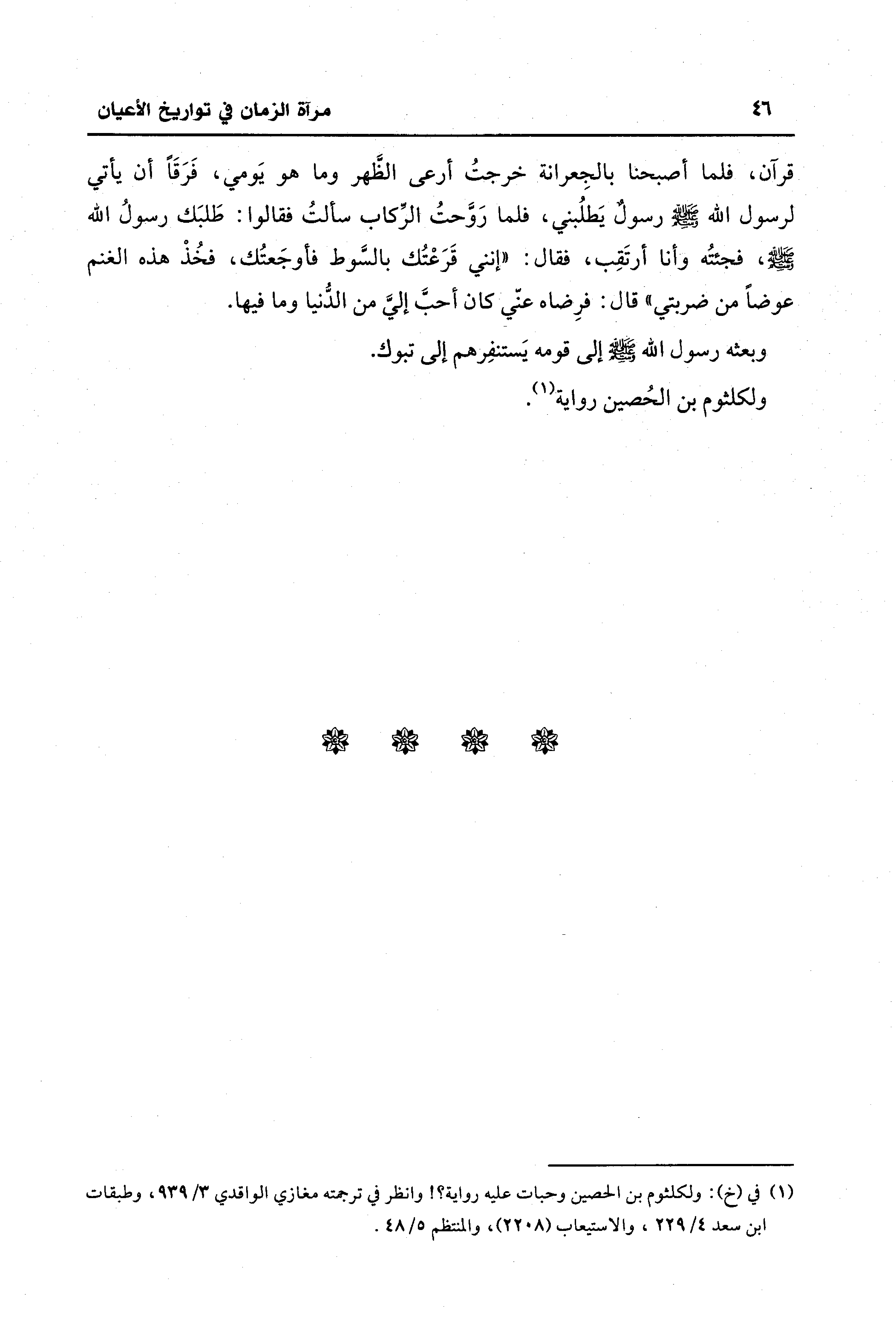 قرآن، فلما أصبحنا بالجِعرانة خرجتُ أرعى الظَهر وما هو يَومي، فَرَقًا أن يأتي لرسول الله - صَلَّى الله عليه وسلم - رسولٌ يَطلُبني، فلما رَوَّحتُ الرّكاب سألتُ فقالوا: طَلبَك رسولُ الله - صلى الله عليه وسلم -، فجئتُه وأنا أرتَقِب، فقال: "إنني قَرَعْتُك بالسَّوط فأوجَعتُك، فخُذْ هذه الغنم عوضًا من ضربتي" قال: فرِضاه عني كان أحب إليَّ من الدُّنيا وما فيها.