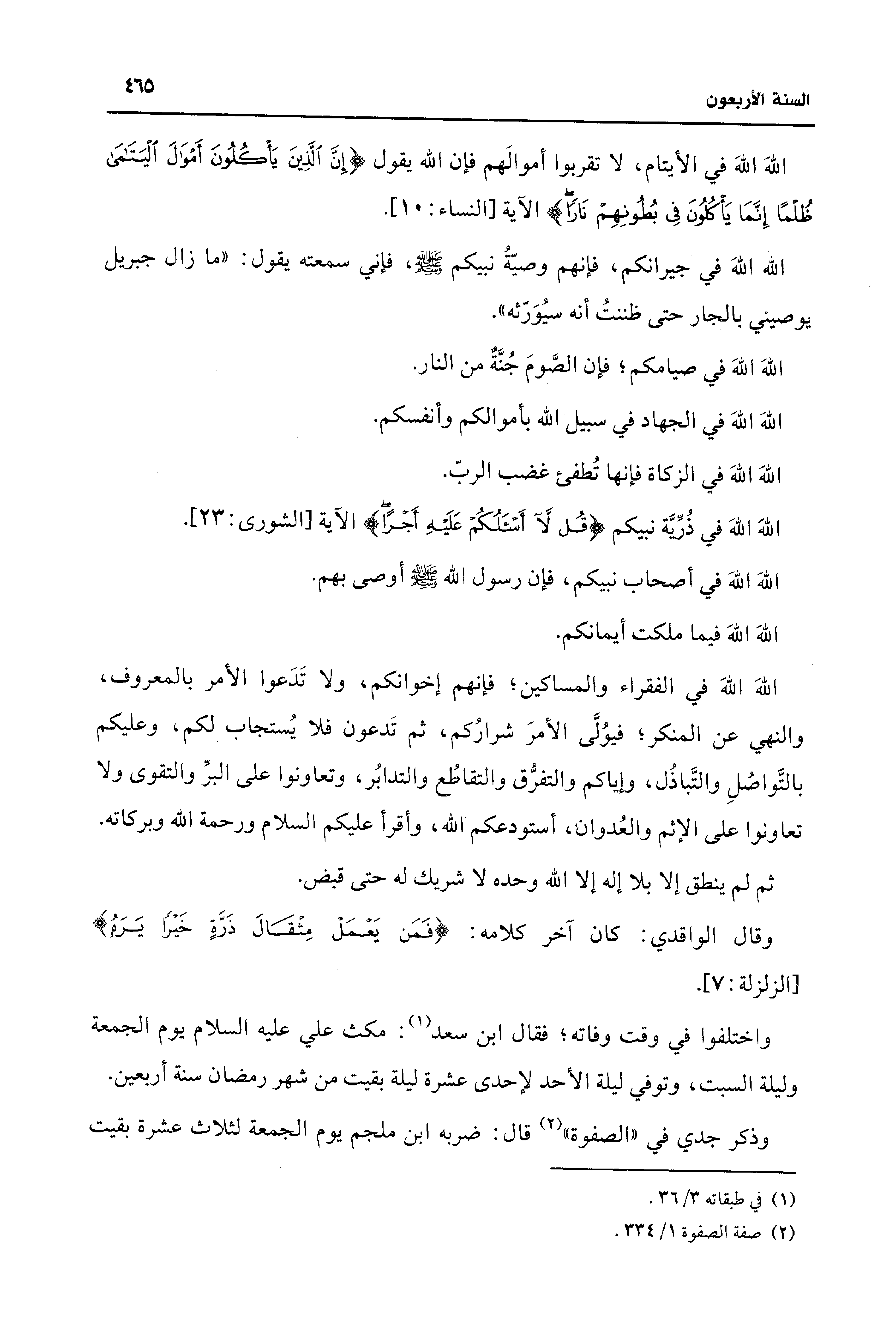 اللهَ اللهَ في الفقراء والمساكين؛ فإنهم إخوانكم، ولا تَدَعوا الأمر بالمعروف، والنهي عن المنكر؛ فيوُلَّى الأمرَ شرارُكم، ثم تَدعون فلا يُستجاب لكم، وعليكم بالتَّواصُلِ والتَّباذُل، وإياكم والتفرُّق والتقاطُع والتدابُر، وتعاونوا على البرِّ والتقوى ولا تعاونوا على الإثم والعُدوان، أستودعكم الله، وأقرأ عليكم السلام ورحمة الله وبركاته.