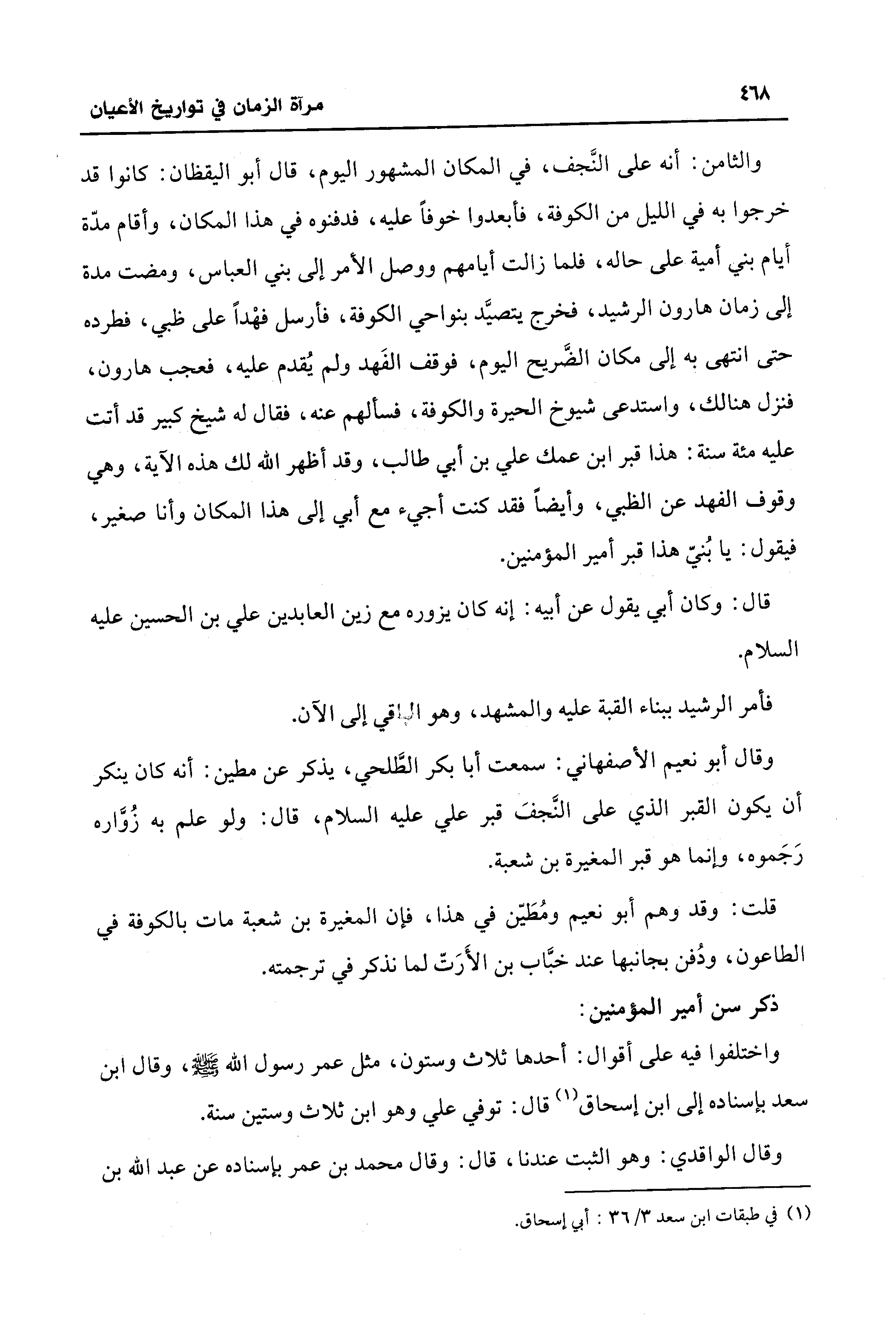 وقال أبو نعيم الأصفهاني: سمعت أبا بكر الطَّلحي، يذكر عن مطين: أنه كان ينكر أن يكون القبر الذي على النَّجفَ قبر علي - عليه السلام -، قال: ولو علم به زُوَّاره رَجُموه، وإنما هو قبر المغيرة بن شعبة.