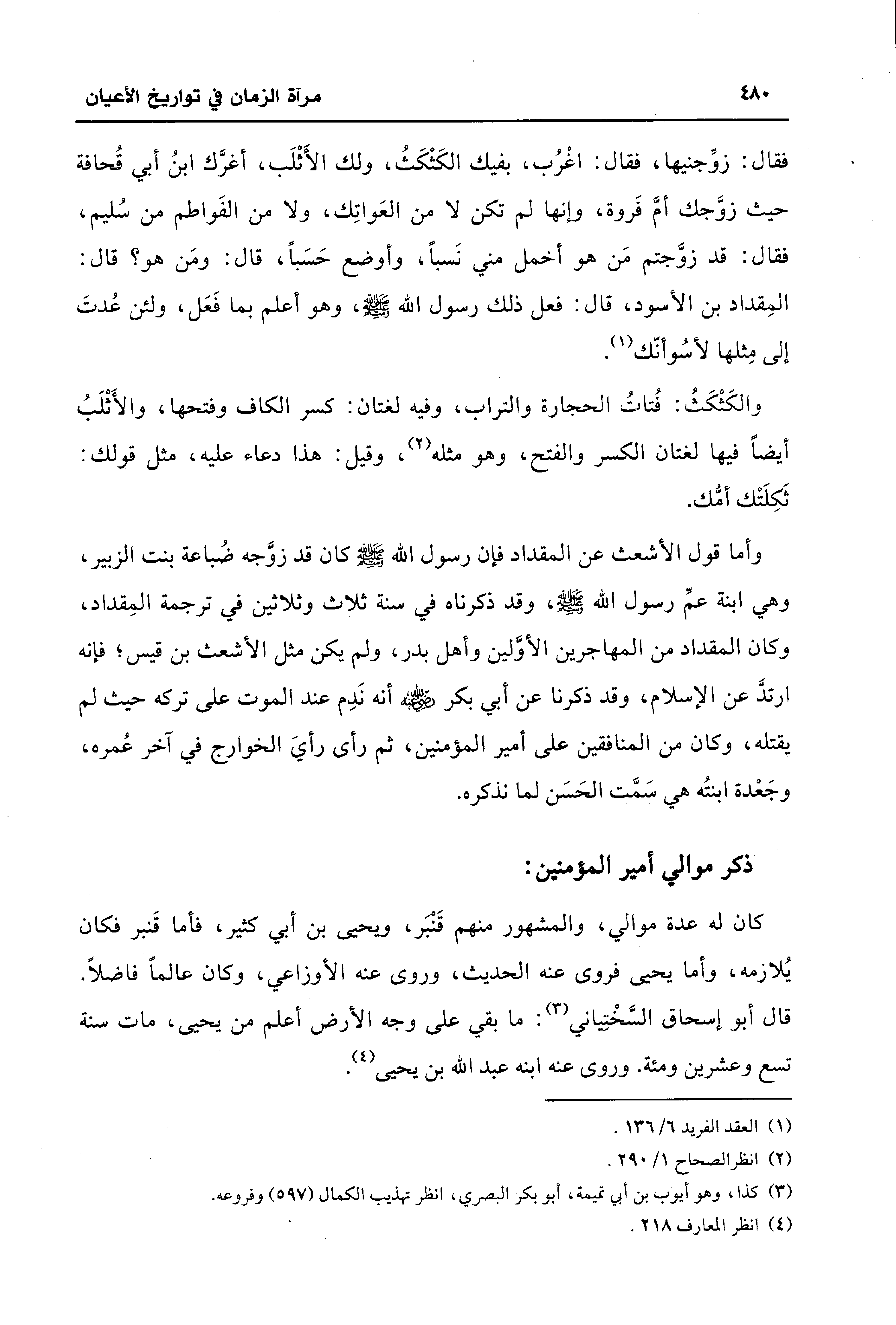 وأما قول الأشعث عن المقداد فإن رسول الله - صلى الله عليه وسلم - كان قد زوَّجه ضُباعة بنت الزبير، وهي ابنة عمّ رسول الله - صلى الله عليه وسلم -، وقد ذكرناه في سنة ثلاث وثلاثين في ترجمة المِقداد، وكان المقداد من المهاجرين الأوَّلين وأهل بدر، ولم يكن مثل الأشعث بن قيس؛ فإنه ارتدَّ عن الإسلام، وقد ذكرنا عن أبي بكر - رضي الله عنه - أنه نَدِم عند الموت على تركه حيث لم يقتله، وكان من المنافقين على أمير المؤمنين، ثم رأى رأيَ الخوارج في آخر عُمره، وجَعْدة ابنتُه هي سَمَّت الحَسَن لما نذكره.