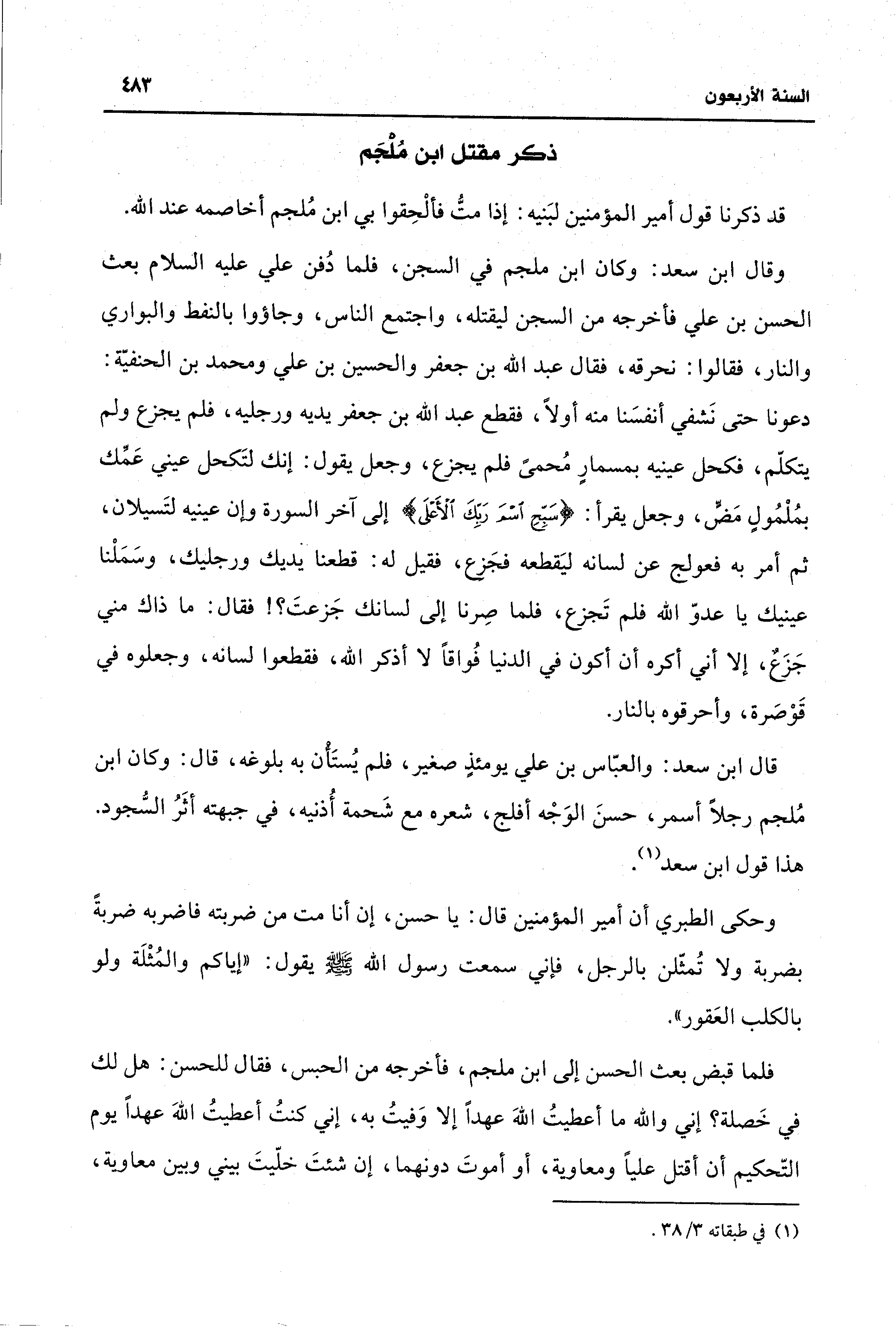 قال ابن سعد: والعبّاس بن علي يومئذٍ صغير، فلم يُستَأْن به بلوغه، قال: وكان ابن مُلجم رجلًا أسمر، حسنَ الوَجْه أفلج، شعره مع شَحمة أُذنيه، في جبهته أثَرُ السُّجود. هذا قول ابن سعد (¬1).