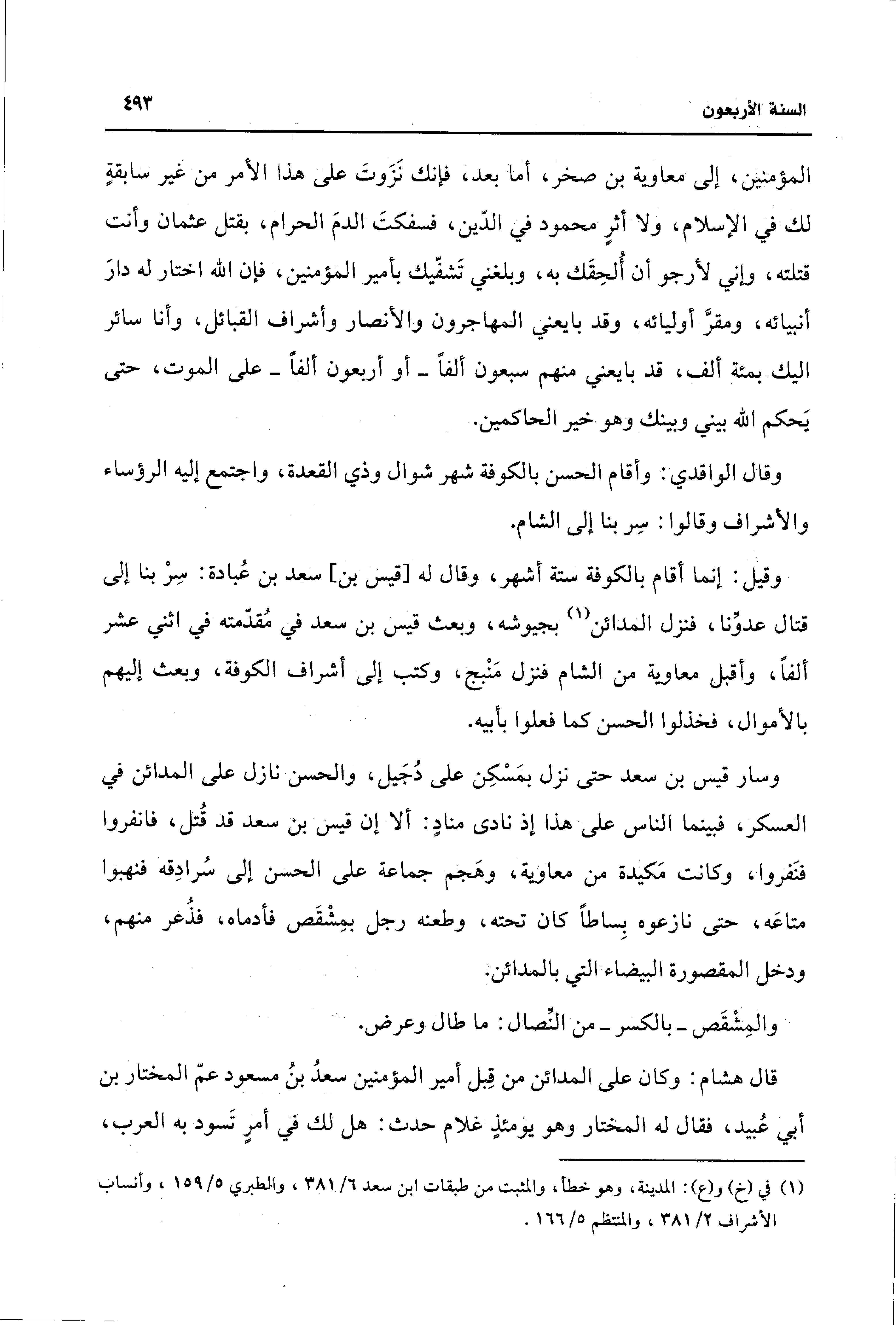 وقيل: إنما أقام بالكوفة ستة أشهر، وقال له [قيس بن] سعد بن عُبادة: سِرْ بنا إلى قتال عدوِّنا، فنزل المدائن (¬1) بجيوشه، وبعث قيس بن سعد في مُقدّمته في اثني عشر ألفًا، وأقبل معاوية من الشام فنزل مَنْبج، وكتب إلى أشراف الكوفة، وبعث إليهم بالأموال، فخذلوا الحسن كما فعلوا بأبيه.