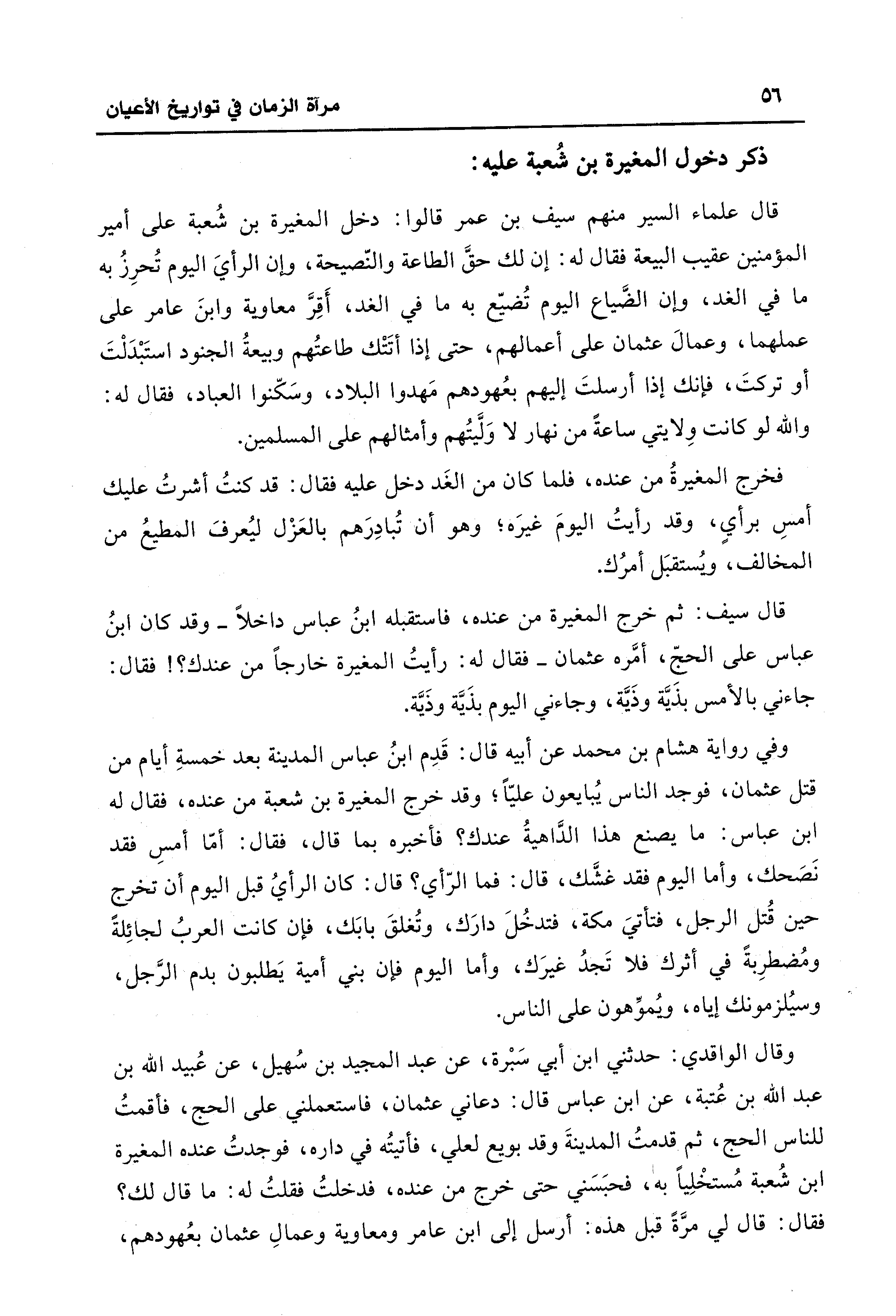 وقال الواقدي: حدثني ابن أبي سَبْرة، عن عبد المجيد بن سُهيل، عن عُبيد الله بن عبد الله بن عُتبة، عن ابن عباس قال: دعاني عثمان، فاستعملني على الحج، فأقمتُ للناس الحج، ثم قدمتُ المدينةَ وقد بويع لعلي، فأتيتُه في داره، فوجدتُ عنده المغيرة بن شُعبة مُستخْلِيًا بَه، فحبَسَني حتَّى خرج من عنده، فدخلتُ فقلتُ له: ما قال لك؟ فقال: قال لي مرَّةً قَبل هذه: أرسل إلى ابن عامر ومعاوية وعمالِ عثمان بعُهودهم،