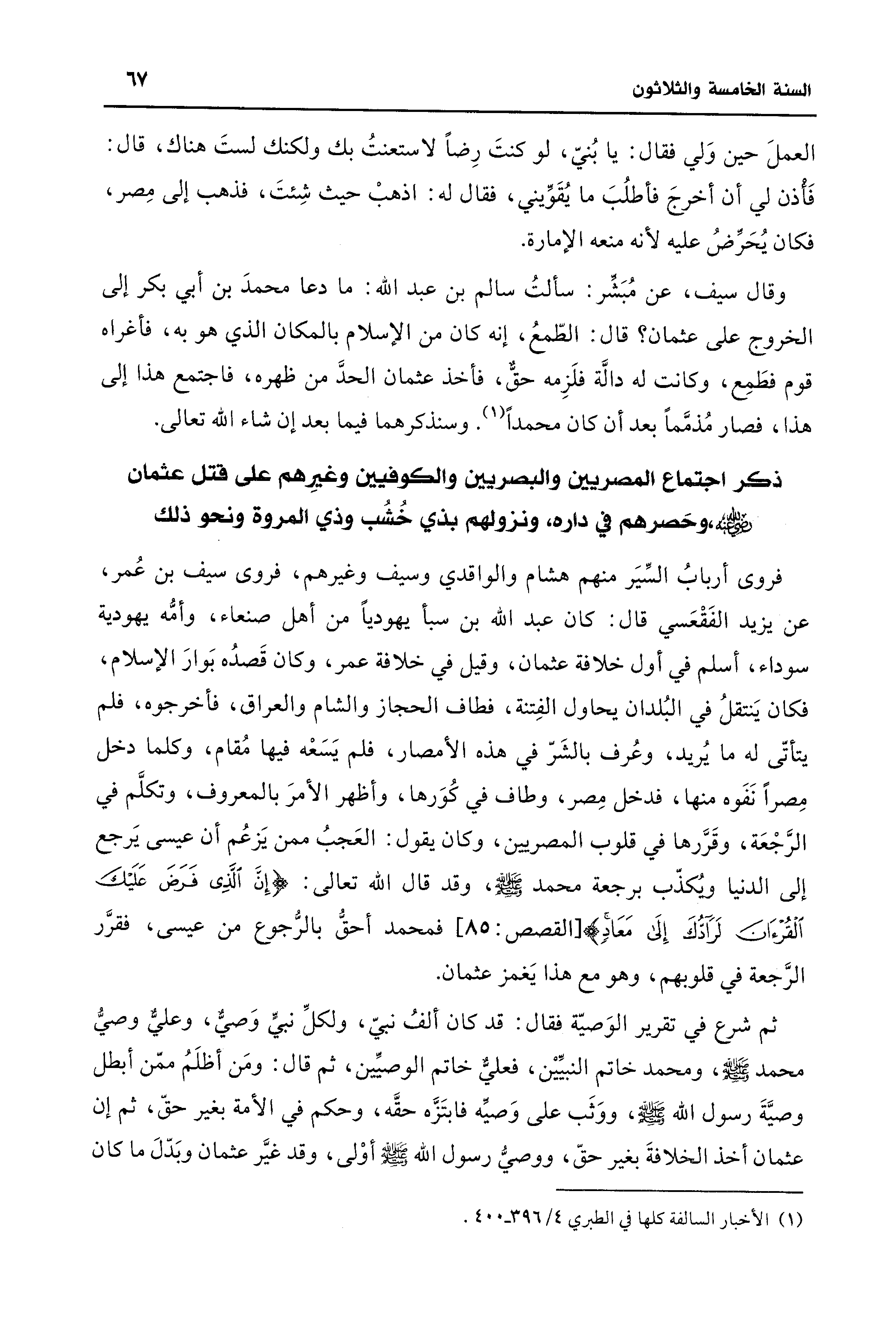 ذكر اجتماع المصريين والبصريين والكوفيين وغيرهم على قتل عثمان - رضي الله عنه -، وحَصرهم في داره، ونزولهم بذي خُشُب وذي المروة ونحو ذلك