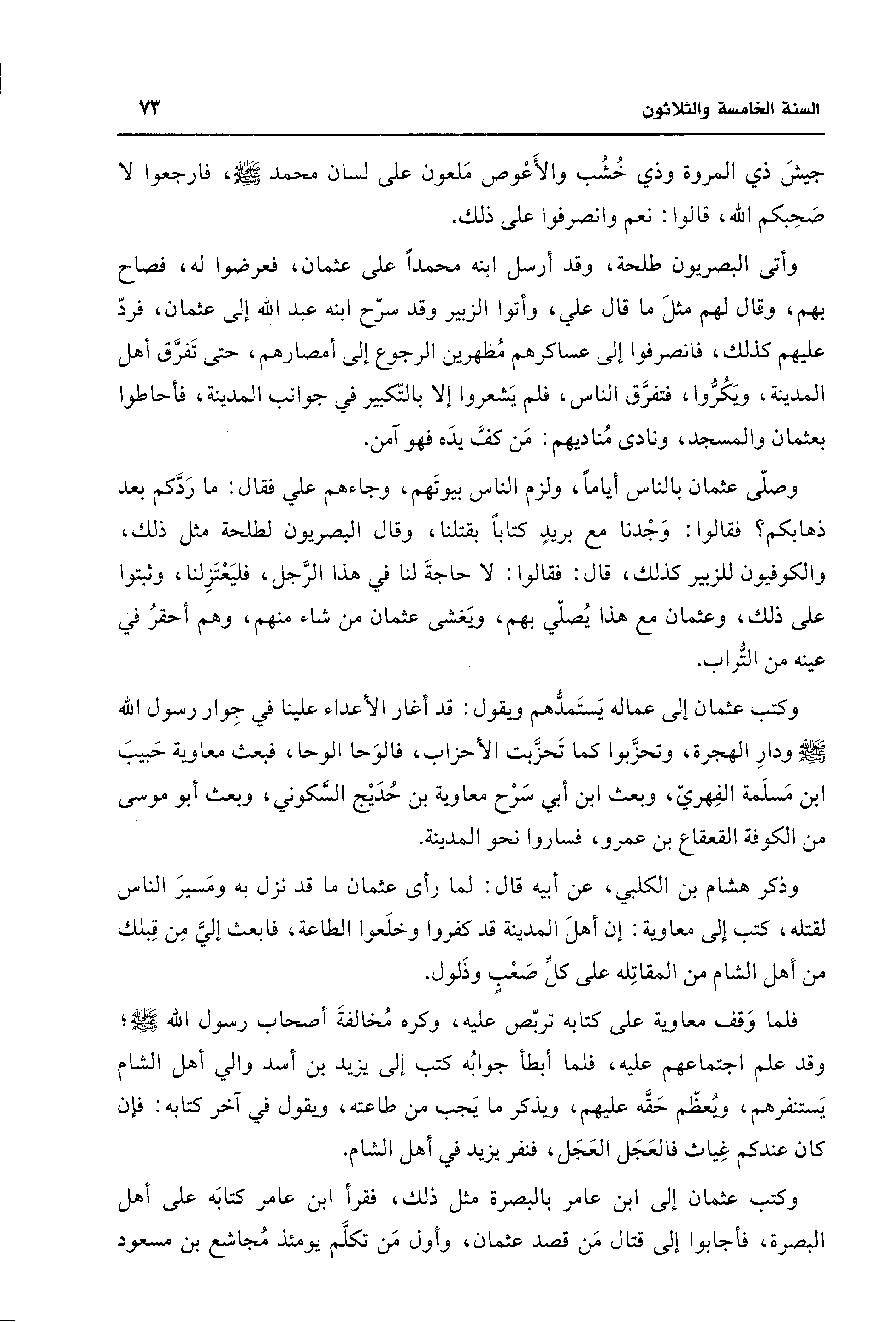 وصلّى عثمان بالناس أيامًا، ولزم الناس بيوتَهم، وجاءهم علي فقال: ما رَدَّكم بعد ذهابكم؟ فقالوا: وَجْدنا مع بريدٍ كتابًا بقتلنا، وقال البصريون لطلحة مثل ذلك، والكوفيون للزبير كذلك، قال: فقالوا: لا حاجةَ لنا في هذا الرَّجل، فليَعْتَزِلنا، وثبتوا على ذلك، وعثمان مع هذا يُصلّي بهم، ويَغشى عثمان من شاء منهم، وهم أحقرُ في عينه من التُّراب.