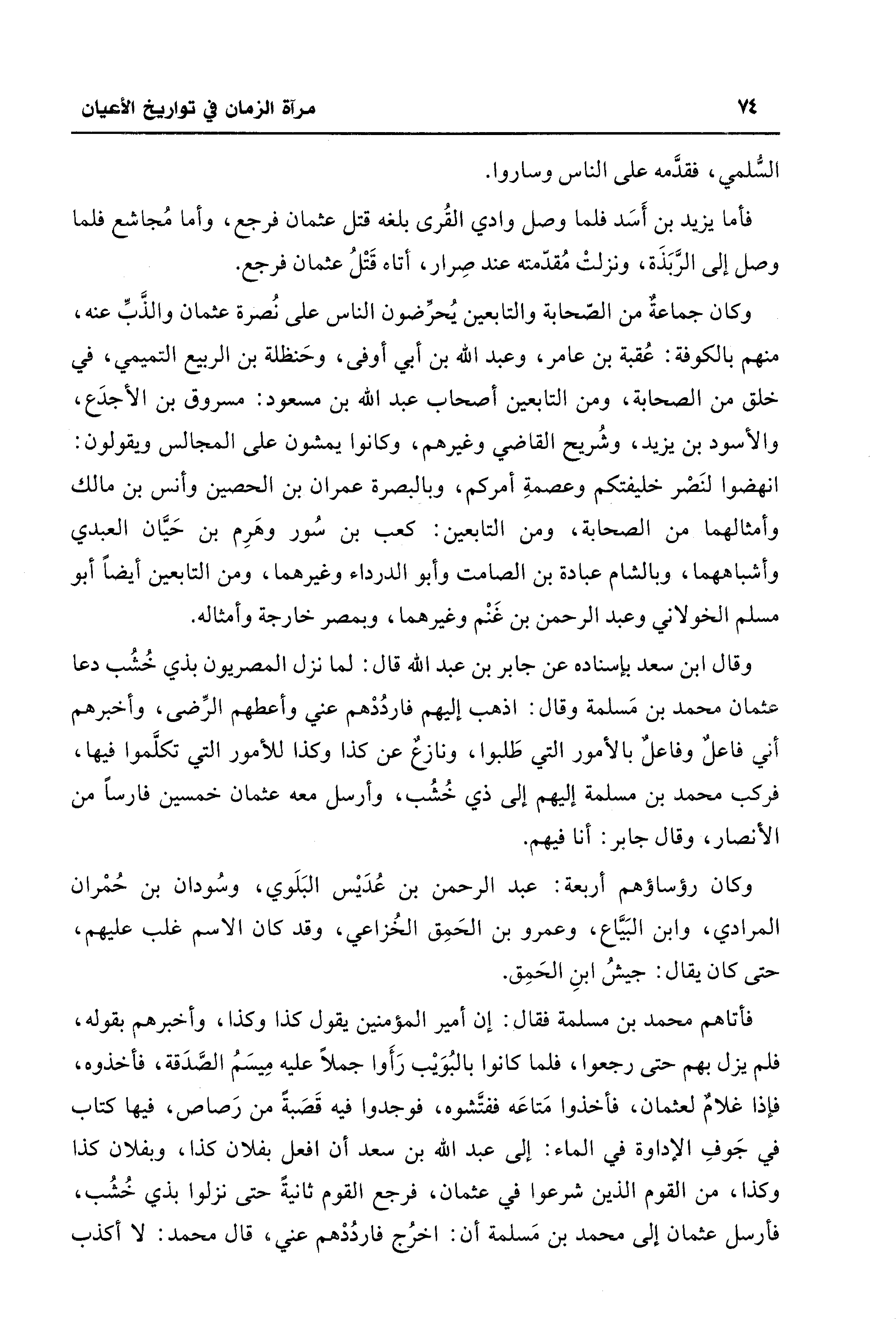 فأتاهم محمد بن مسلمة فقال: إن أمير المؤمنين يقول كذا وكذا، وأخبرهم بقوله، فلم يزل بهم حتى رجعوا، فلما كانوا بالبُوَيب رَأَوا جملًا عليه مِيسَمُ الصَّدَقة، فأخذوه، فإذا غلامٌ لعثمان، فأخذوا مَتاعَه ففتَّشوه، فوجدوا فيه قَصَبةً من رَصاص، فيها كتاب في جَوفِ الإداوة في الماء: إلى عبد الله بن سعد أن افعل بفلان كذا، وبفلان كذا وكذا، من القوم الذين شرعوا في عثمان، فرجع القوم ثانيةً حتى نزلوا بذي خُشُب، فأرسل عثمان إلى محمد بن مَسلمة أن: اخرُج فاردُدْهم عني، قال محمد: لا أكذب