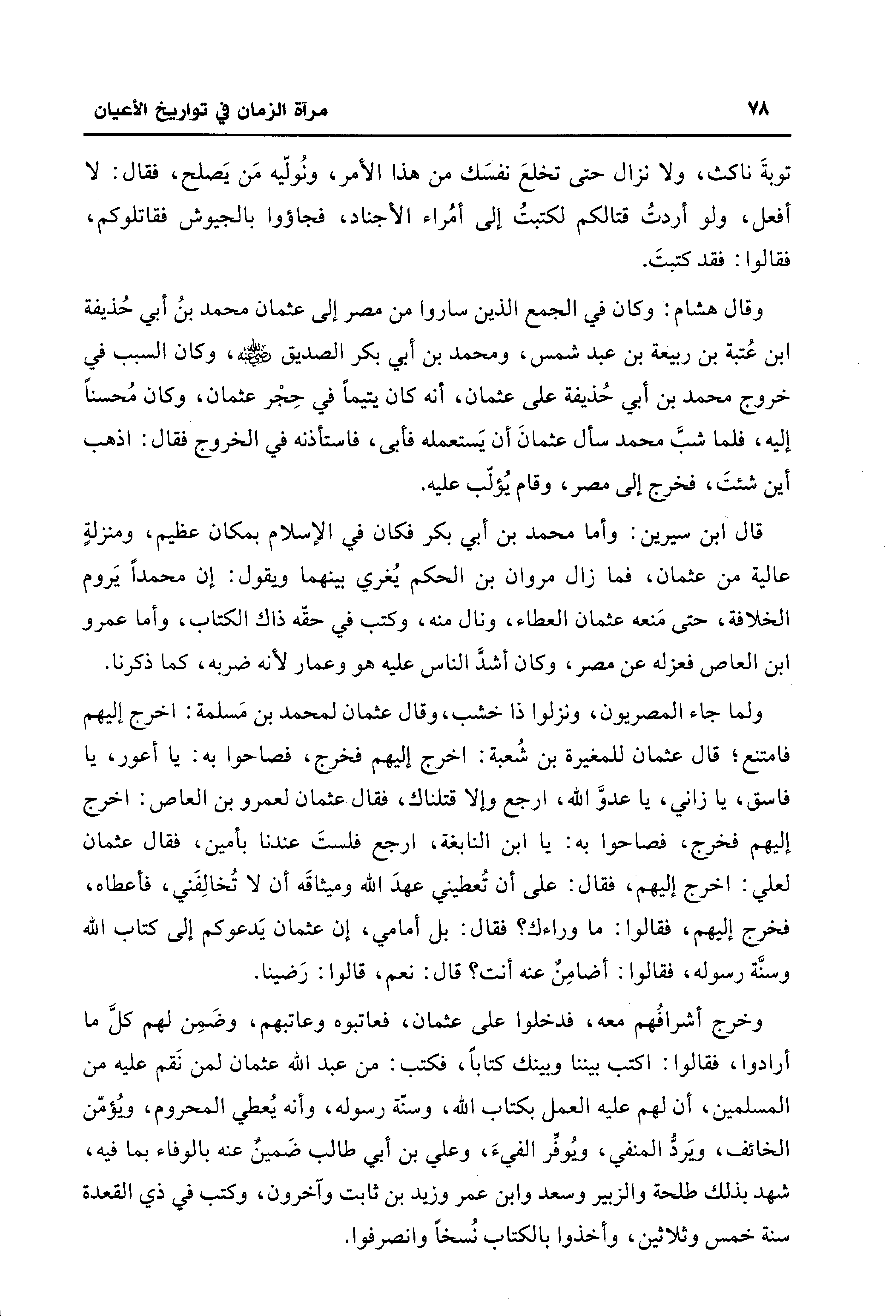 وخرج أشرافُهم معه، فدخلوا على عثمان، فعاتبوه وعاتبهم، وضَمِن لهم كلَّ ما أرادوا، فقالوا: اكتب بيننا وبينك كتابًا، فكتب: من عبد الله عثمان لمن نَقم عليه من المسلمين، أن لهم عليه العمل بكتاب الله، وسنّة رسوله، وأنه يُعطي المحروم، ويؤمّن الخائف، وَيردُّ المنفي، ويُوفِّر الفيءَ، وعلي بن أبي طالب ضَمينٌ عنه بالوفاء بما فيه، شهد بذلك طلحة والزبير وسعد وابن عمر وزيد بن ثابت وآخرون، وكتب في ذي القعدة سنة خمس وثلاثين، وأخذوا بالكتاب نُسخًا وانصرفوا.