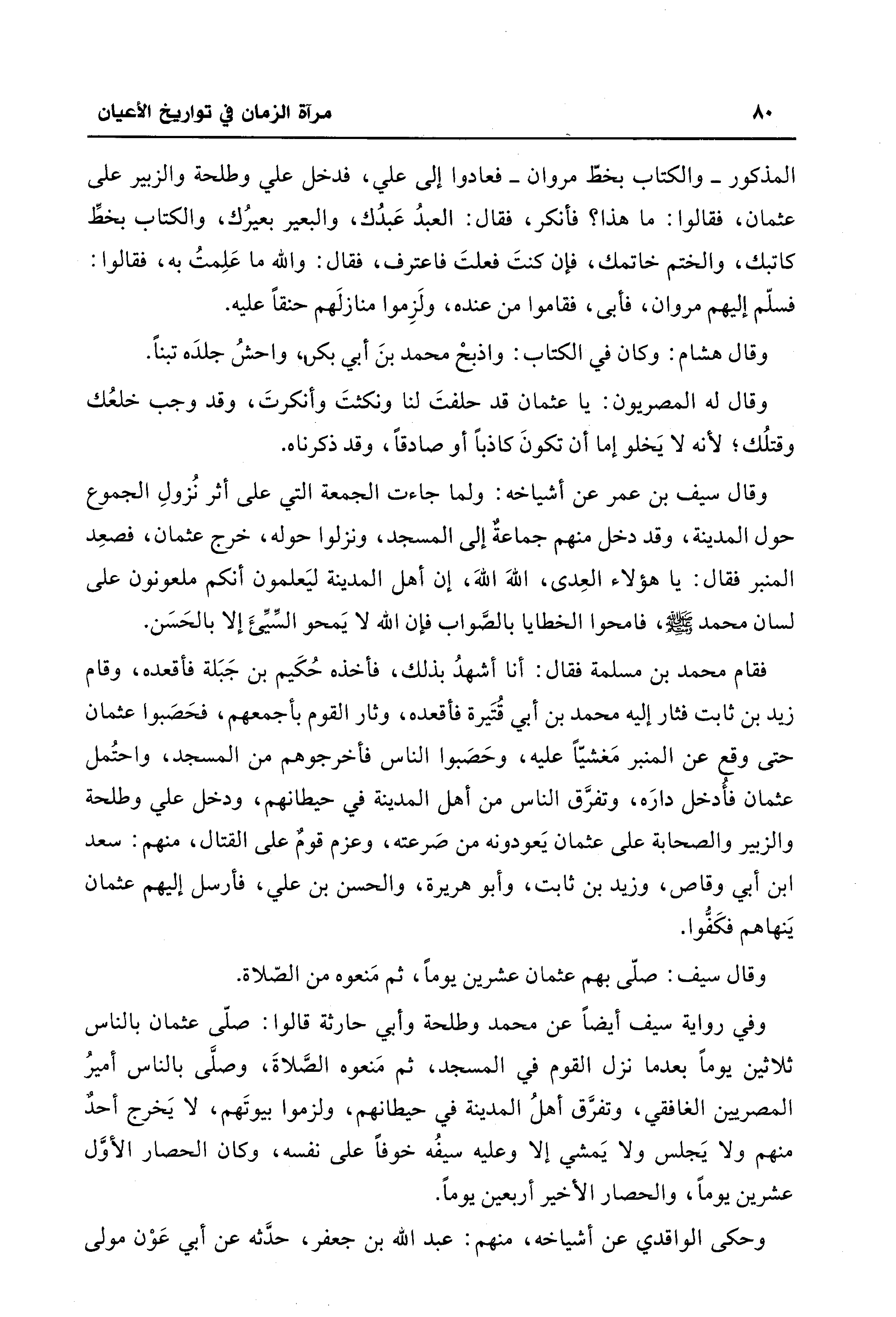 وفي رواية سيف أيضًا عن محمد وطلحة وأبي حارثة قالوا: صلّى عثمان بالناس ثلاثين يومًا بعدما نزل القوم في المسجد، ثم مَنعوه الصَّلاةَ، وصلَّى بالناس أميرُ المصريين الغافقي، وتفرَّق أهلُ المدينة في حيطانهم، ولزموا بيوتَهم، لا يَخرج أحدٌ منهم ولا يَجلس ولا يَمشي إلا وعليه سيفُه خوفًا على نفسه، وكان الحصار الأوَّل عشرين يومًا، والحصار الأخير أربعين يومًا.