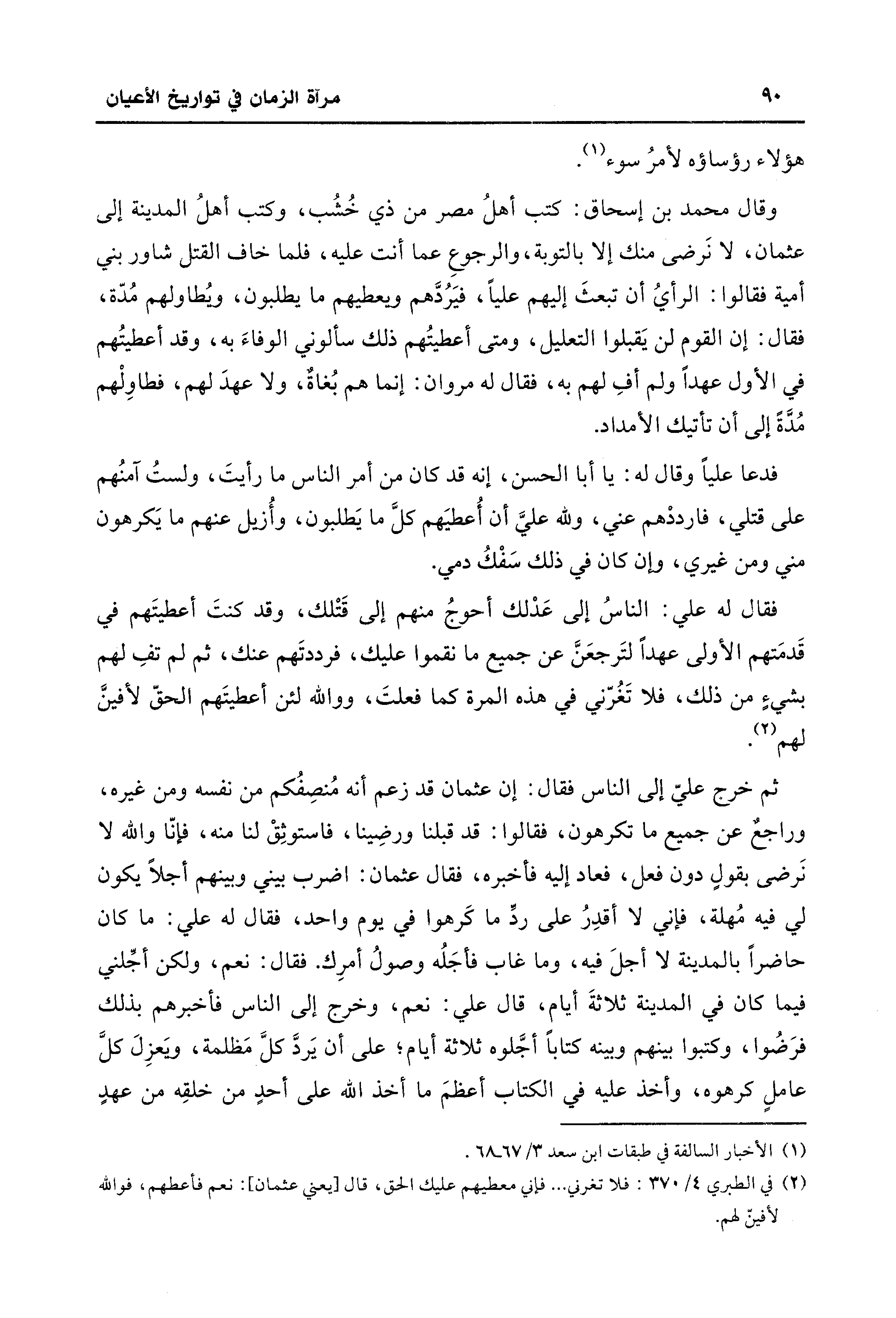 ثم خرج عليّ إلى الناس فقال: إن عثمان قد زعم أنه مُنصِفُكم من نفسه ومن غيره، وراجعٌ عن جميع ما تكرهون، فقالوا: قد قبلنا ورضِينا، فاستوثِقْ لنا منه، فإنّا والله لا نَرضى بقولٍ دون فعل، فعاد إليه فأخبره، فقال عثمان: اضرب بيني وبينهم أجلًا يكون لي فيه مُهلة، فإني لا أقدِرُ على ردِّ ما كَرهوا في يوم واحد، فقال له علي: ما كان حاضرًا بَالمدينة لا أجلَ فيه، وما غاب فأجَلُه وصولُ أمرِك. فقال: نعم، ولكن أجِّلني فيما كان في المدينة ثلاثةَ أيام، قال علي: نعم، وخرج إلى الناس فأخبرهم بذلك فرَضُوا، وكتبوا بينهم وبينه كتابًا أجَّلوه ثلاثة أيام؛ على أن يَردَّ كلَّ مَظلمة، وَيعزِلَ كلَّ عاملٍ كرهوه، وأخذ عليه في الكتاب أعظمَ ما أخذ الله على أحدٍ من خلقِه من عهدٍ
