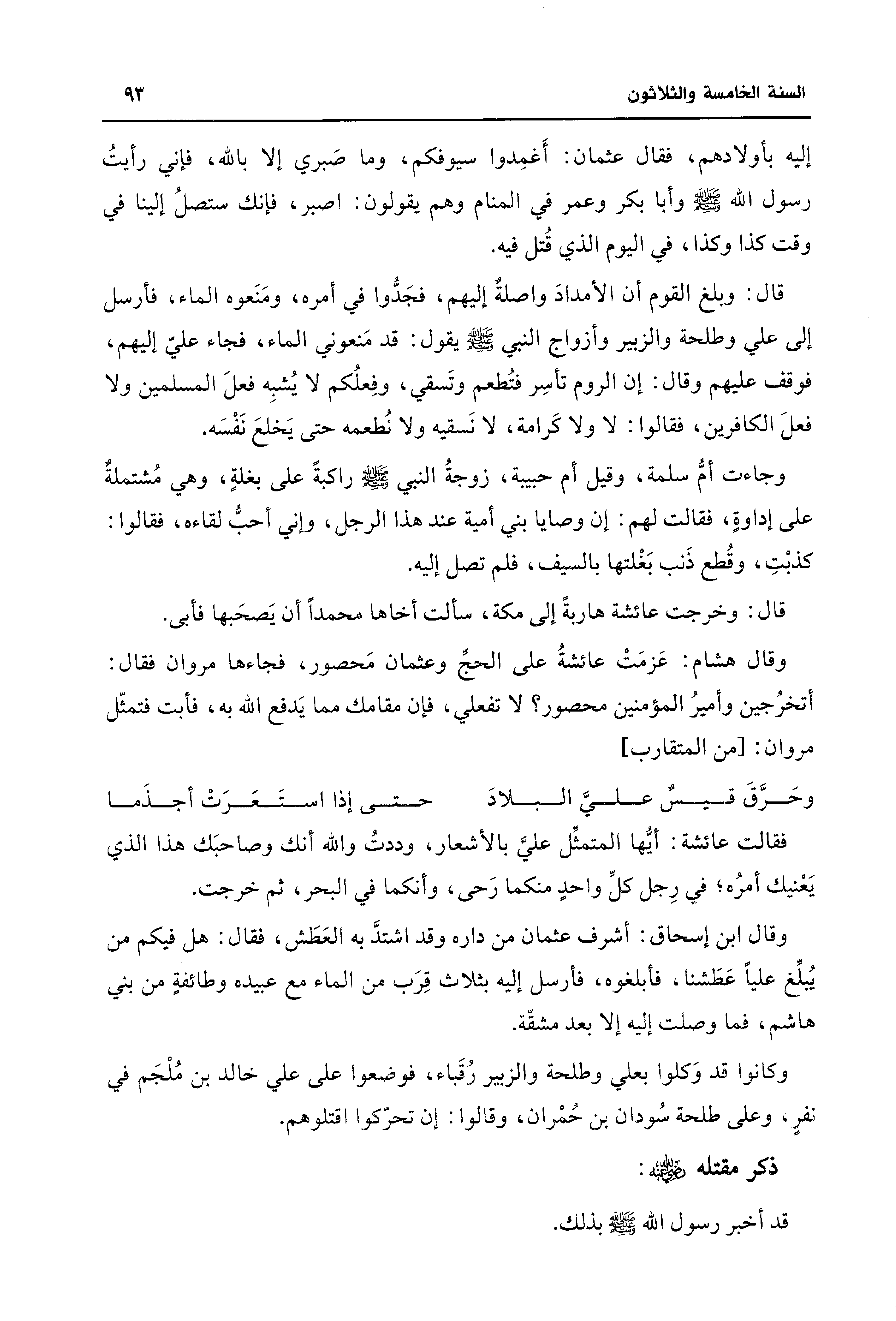وقال هشام: عَزمَتْ عائشةُ على الحجِّ وعثمان مَحصور، فجاءها مروان فقال: أتخرجين وأميرُ المؤمنين محصور؟ لا تفعلي، فإن مقامك مما يَدفع الله به، فأبت فتمثّل مروان: [من المتقارب]