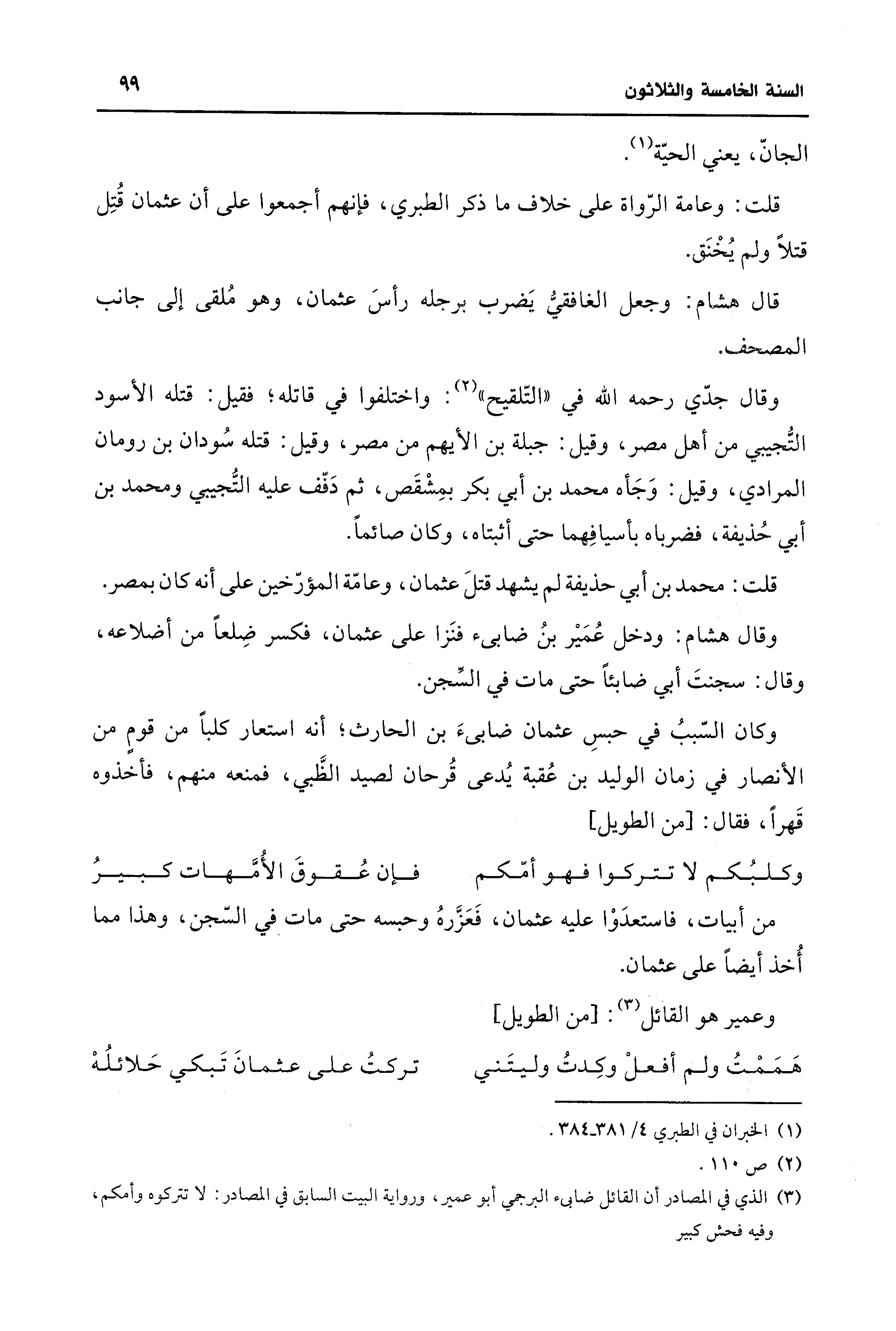 قلت: وعامة الرّواة على خلاف ما ذكر الطبري، فإنهم أجمعوا على أن عثمان قُتِل قتلًا ولم يُخْنَق.