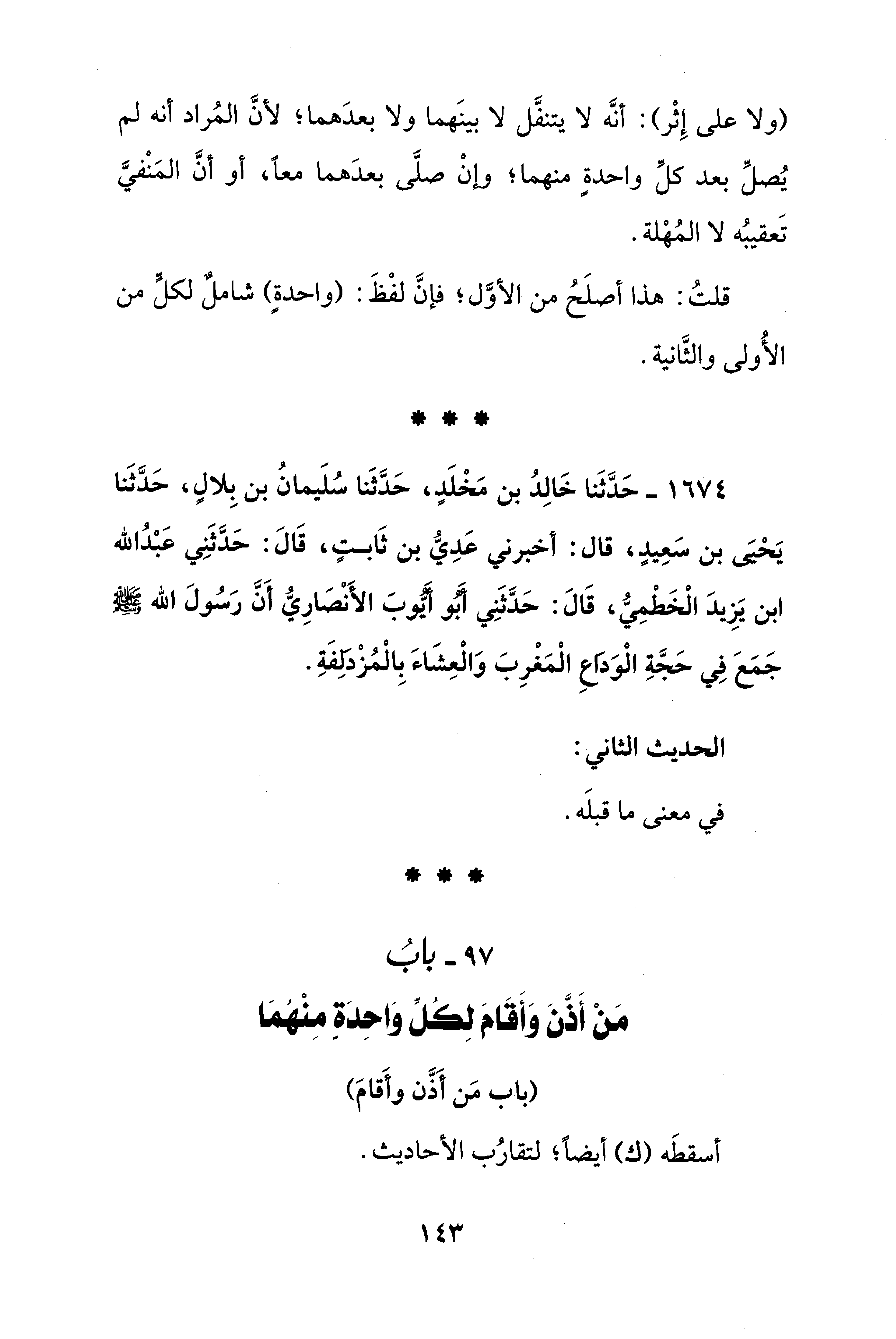 1674 - حَدَّثَنا خَالِدُ بن مَخْلَدٍ، حَدَّثَنا سُلَيمانُ بن بِلالٍ، حَدَّثَنا يَحْيَى بن سَعِيدٍ، قال: أخبرني عَدِيُّ بن ثَابتٍ، قَالَ: حَدَّثَنِي عَبْدُ الله ابن يَزِيدَ الْخَطْمِيُّ، قَالَ: حَدَّثَنِي أَبُو أَيُّوبَ الأَنْصَارِيُّ أَنَّ رَسُولَ الله - صلى الله عليه وسلم - جَمَعَ فِي حَجَّةِ الْوَدَاعِ الْمَغْرِبَ وَالْعِشَاءَ بِالمُزْدَلِفَةِ.