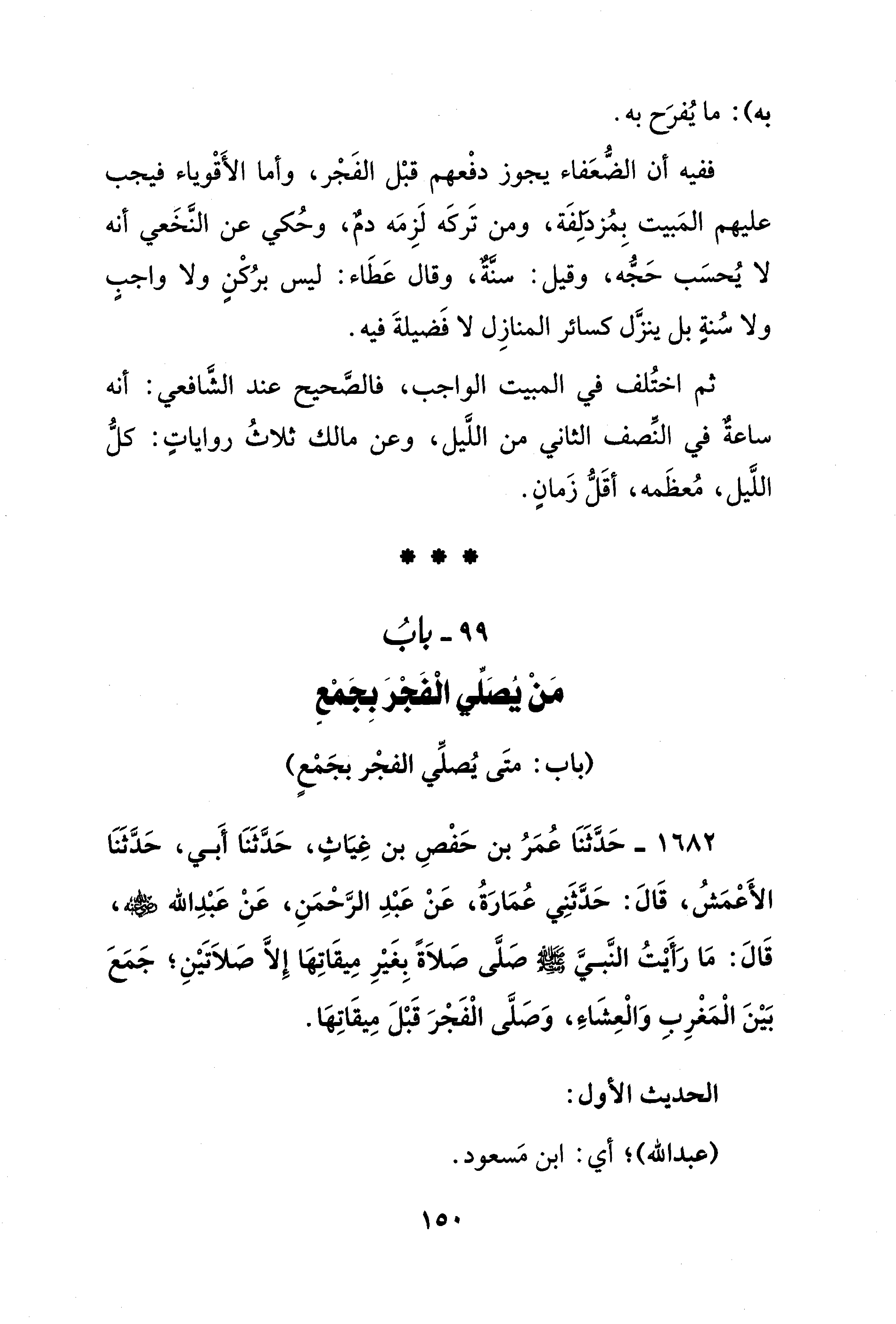 1682 - حَدَّثَنَا عُمَرُ بن حَفْصِ بن غِيَاث، حَدَّثَنَا أَبي، حَدَّثَنَا الأَعْمَشُ، قَالَ: حَدَّثَنِي عُمَارَةُ، عَنْ عَبْدِ الرَّحْمَنِ، عَنْ عَبْدِ الله - رضي الله عنه -، قَالَ: مَا رَأَيْتُ النَّبيَّ - صلى الله عليه وسلم - صَلَّى صَلَاةً بِغَيْرِ مِيقَاتِهَا إلا صَلَاتَيْنِ؛ جَمَعَ بَيْنَ الْمَغْرِبِ وَالْعِشَاءِ، وَصَلَّى الْفَجْرَ قَبْلَ مِيقَاتِهَا.