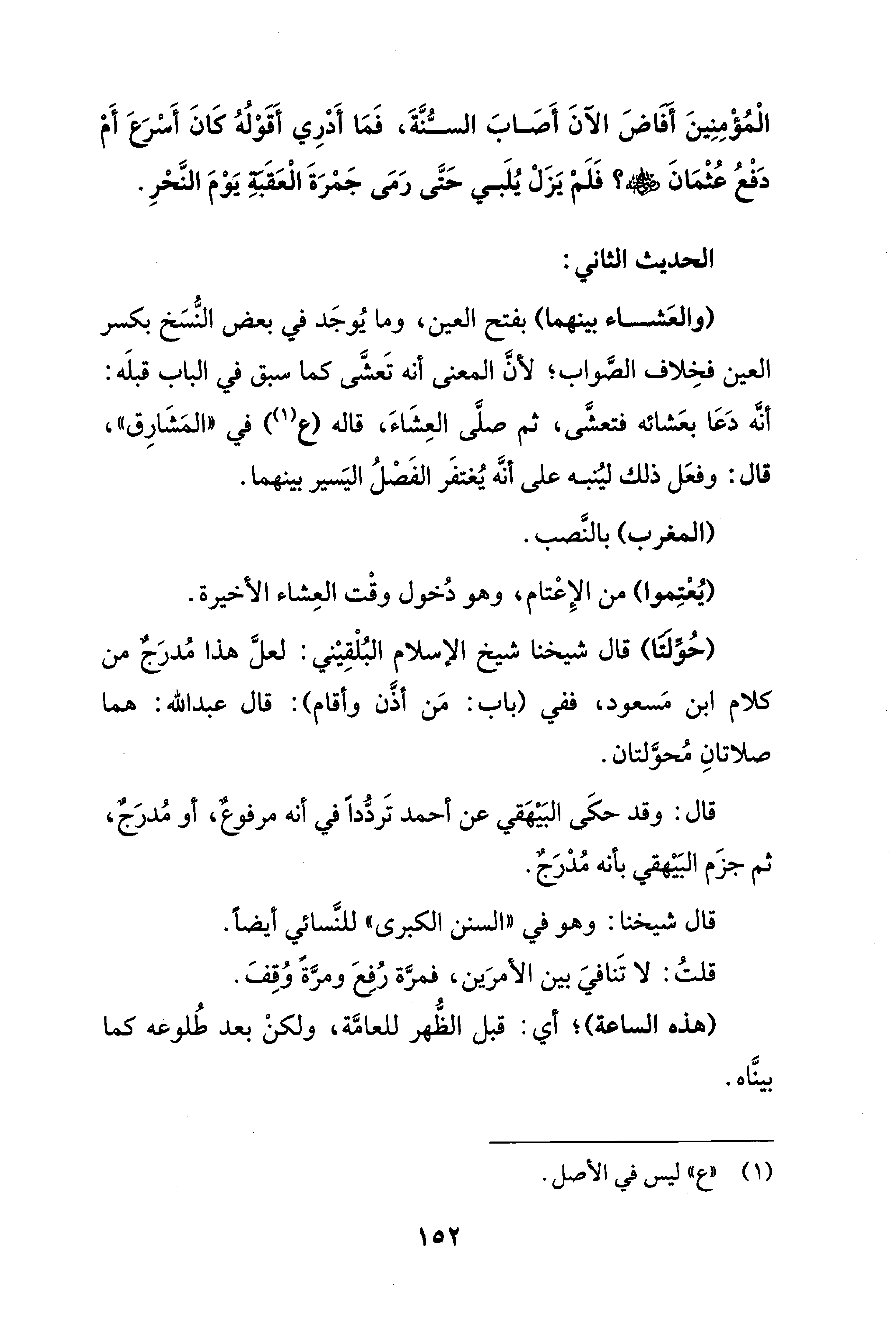 الْمُؤْمِنِينَ أَفَاضَ الآنَ أَصَابَ السُّنَّةَ، فَمَا أَدْرِي أَقَوْلُهُ كَانَ أَسْرَعَ أَمْ دَفْعُ عُثْمَانَ - رضي الله عنه -؟ فَلَمْ يَزَلْ يُلَبي حَتَّى رَمَى جَمْرَةَ الْعَقَبةِ يَوْمَ النَّحْرِ.