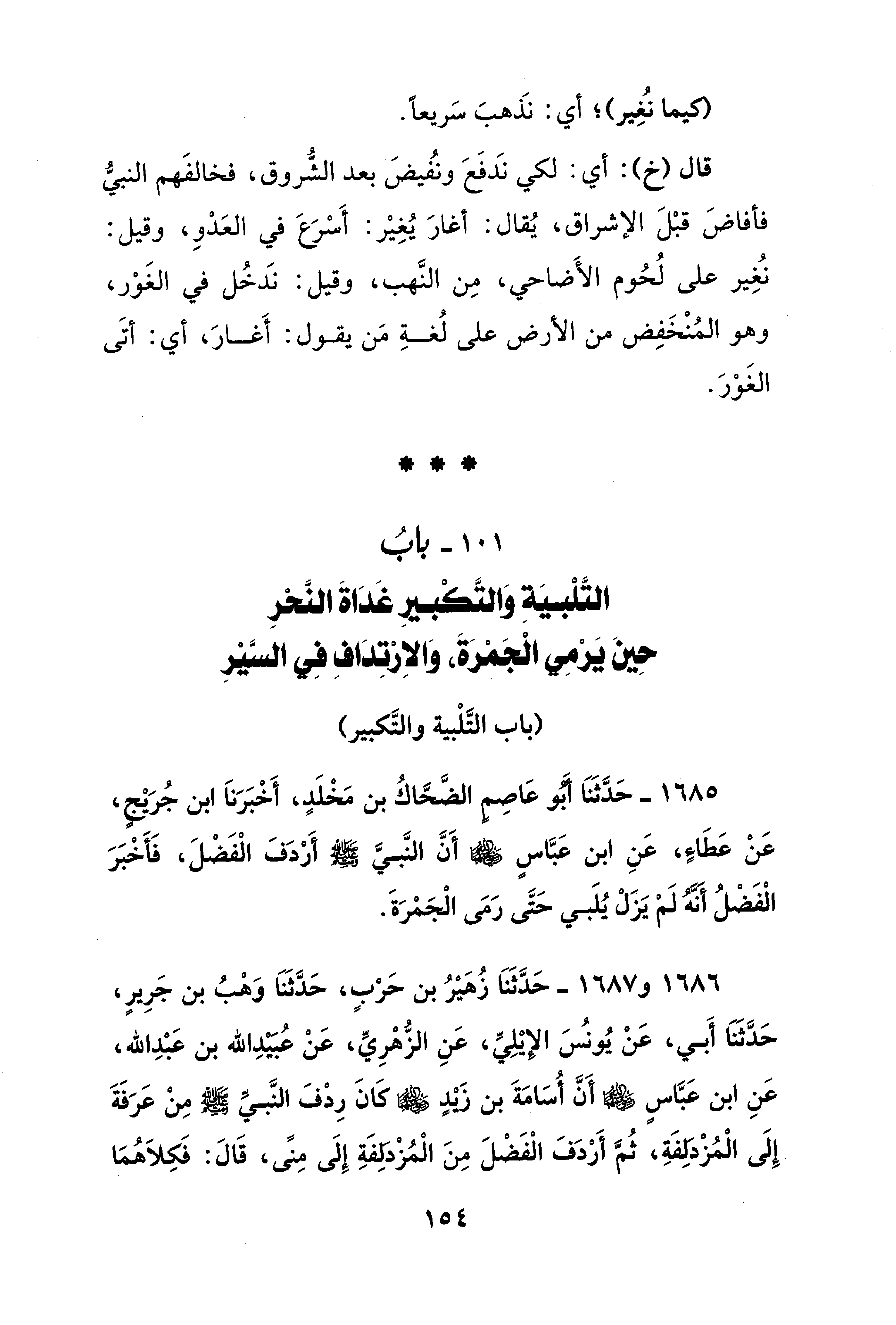 1685 - حَدَّثَنَا أَبُو عَاصِمٍ الضَّحَّاكُ بن مَخْلَدٍ، أَخْبَرَنَا ابن جُرَيْج، عَنْ عَطَاءٍ، عَنِ ابن عَبَّاسٍ - رضي الله عنهما - أَنَّ النَّبيَّ - صلى الله عليه وسلم - أَرْدَفَ الْفَضْلَ، فَأَخْبَرَ الْفَضْلُ أَنَّهُ لَمْ يَزَلْ يُلَبي حَتَّى رَمَى الْجَمْرَةَ.