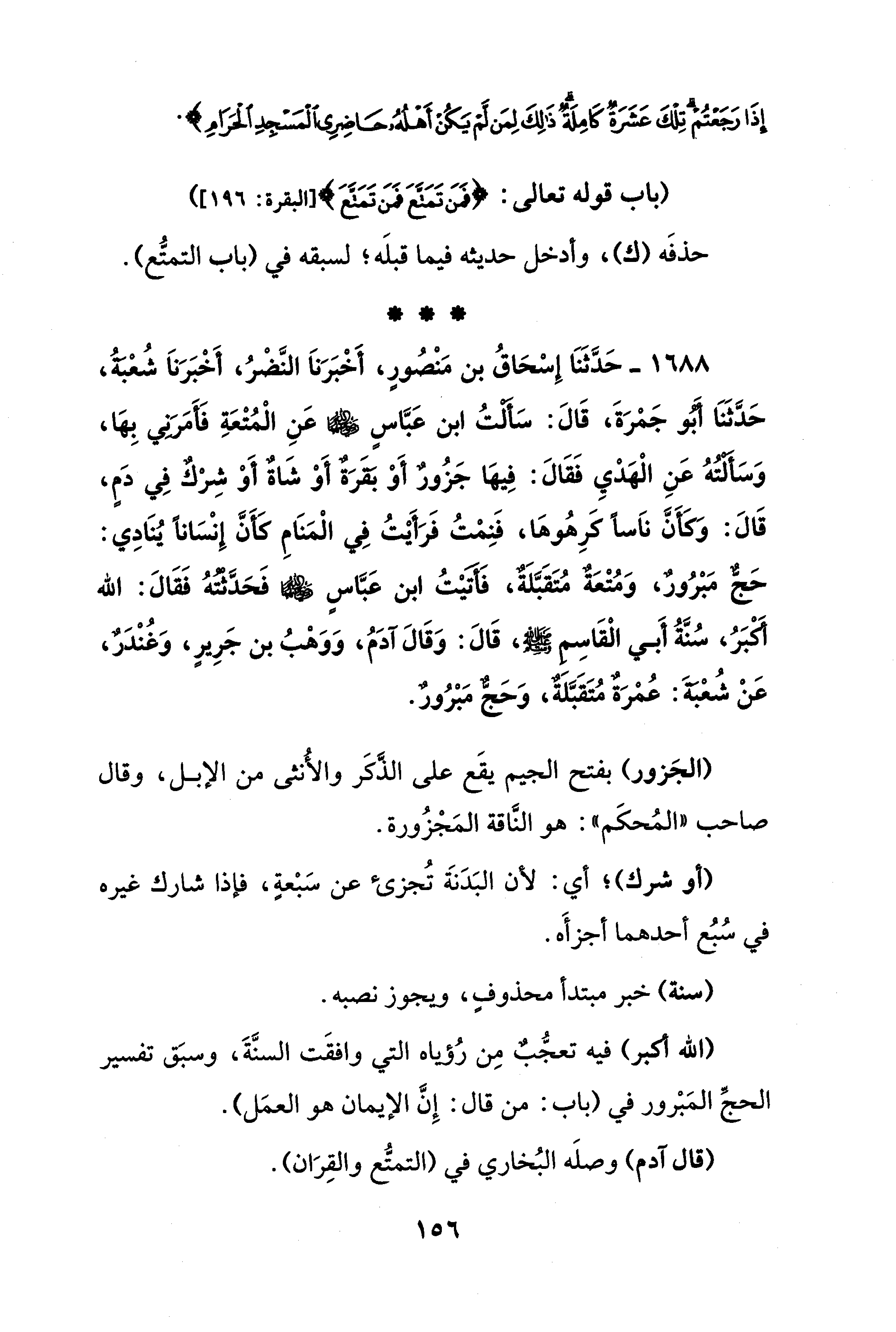 1688 - حَدَّثنا إِسحَاقُ بن مَنْصُورٍ، أَخْبَرَنَا النَّضْرُ، أَخْبَرَنَا شُعْبَةُ، حَدَّثنا أَبُو جَمْرَةَ، قَالَ: سَأَلتُ ابن عَبَّاسٍ - رضي الله عنهما - عَنِ الْمُتْعَةِ فَأَمَرَنِي بِهَا، وَسَأَلتُهُ عَنِ الْهَدْيِ فَقَالَ: فِيهَا جَزُورٌ أَوْ بَقَرَةٌ أَوْ شَاةٌ أَوْ شِرْكٌ فِي دَمٍ، قَالَ: وَكَأَنَّ نَاسًا كَرِهُوهَا، فَنِمْتُ فَرَأَيْتُ فِي الْمَنَامِ كَأَنَّ إنْسَانًا يُنَادِي: حَجٌّ مَبْرُورٌ، وَمُتْعَةٌ مُتَقَبَّلَةٌ، فَأَتَيْتُ ابن عَبَّاسٍ - رضي الله عنهما - فَحَدَّثْتُهُ فَقَالَ: الله أَكبَرُ، سُنَّةُ أَبي الْقَاسِم - صلى الله عليه وسلم -، قَالَ: وَقَالَ آدَمُ، وَوَهْبُ بن جَرِيرٍ، وَغُنْدَرٌ، عَنْ شُعْبة: عُمْرَةٌ مُتَقَبَّلَةٌ، وَحَجٌّ مَبْرُورٌ.