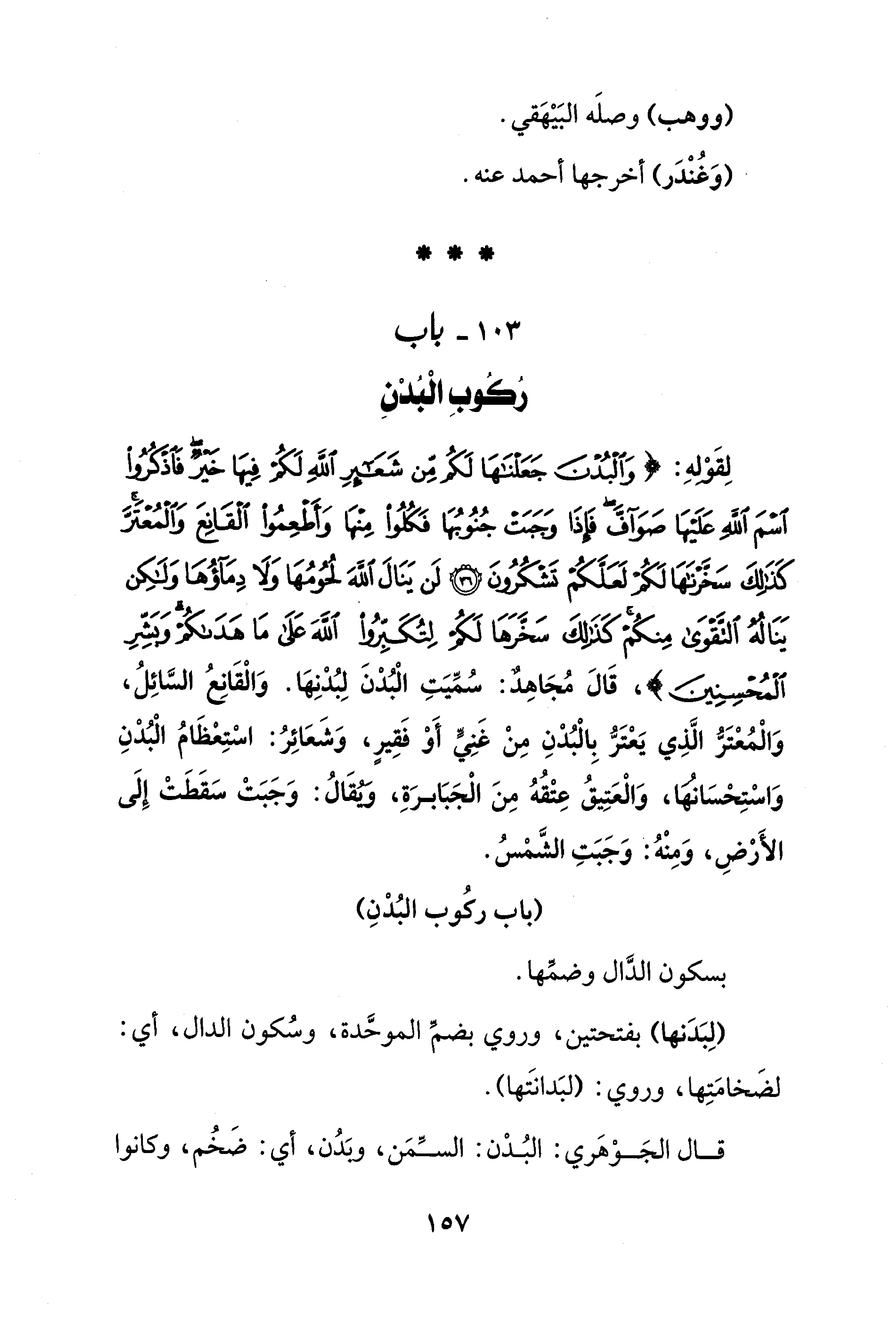 لِقَوْلهِ: {وَالْبُدْنَ جَعَلْنَاهَا لَكُمْ مِنْ شَعَائِرِ اللَّهِ لَكُمْ فِيهَا خَيْرٌ فَاذْكُرُوا اسْمَ اللَّهِ عَلَيْهَا صَوَافَّ فَإِذَا وَجَبَتْ جُنُوبُهَا فَكُلُوا مِنْهَا وَأَطْعِمُوا الْقَانِعَ وَالْمُعْتَرَّ كَذَلِكَ سَخَّرْنَاهَا لَكُمْ لَعَلَّكُمْ تَشْكُرُونَ (36) لَنْ يَنَالَ اللَّهَ لُحُومُهَا وَلَا دِمَاؤُهَا وَلَكِنْ يَنَالُهُ التَّقْوَى مِنْكُمْ كَذَلِكَ سَخَّرَهَا لَكُمْ لِتُكَبِّرُوا اللَّهَ عَلَى مَا هَدَاكُمْ وَبَشِّرِ الْمُحْسِنِينَ}، قَالَ مُجَاهِدٌ: سُمِّيَتِ الْبُدْنَ لِبُدْنِهَا. وَالْقَانِعُ السَّائِلُ، وَالْمُعْتَرُّ الَّذِي يَعْتَرُّ بِالْبُدْنِ مِنْ غَنِيٍّ أَوْ فَقِيرٍ، وَشَعَائِرُ: اسْتِعْظَامُ الْبُدْنِ وَاسْتِحْسَانها، وَالْعَتِيقُ عِتْقُهُ مِنَ الْجَبَابرَةِ، وَيُقَالُ: وَجَبَتْ سَقَطَتْ إِلَى الأَرْضِ، وَمِنْهُ: وَجَبَتِ الشَّمْسُ.