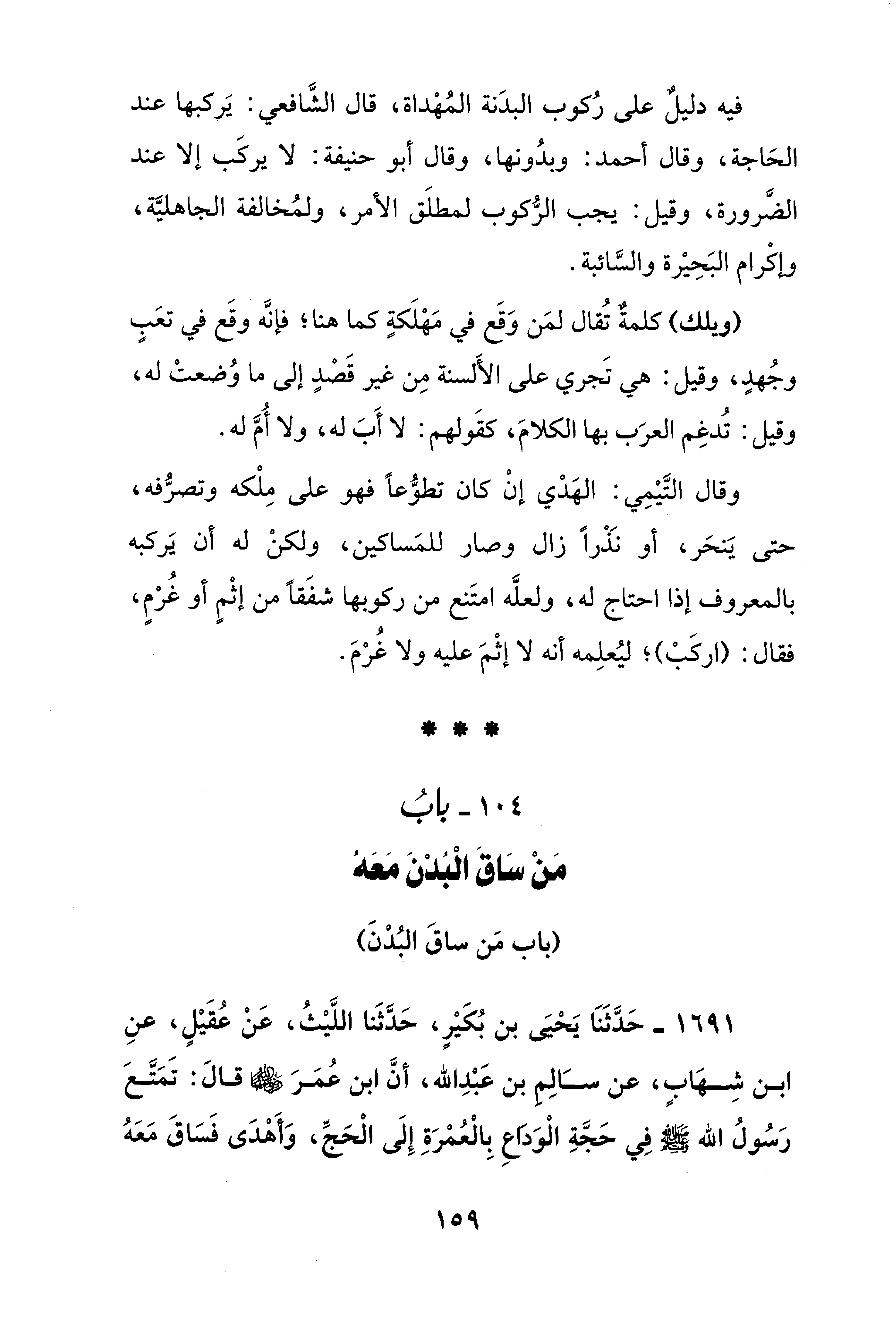 1691 - حَدَّثَنَا يَحْيَى بن بُكَيْرٍ، حَدَّثَنا اللَّيْثُ، عَنْ عُقَيْلٍ، عنِ ابن شِهَابٍ، عن سَالِمٍ بن عَبْدِ الله، أنَّ ابن عُمَرَ - رضي الله عنهما - قالَ: تَمَتَّعَ رَسُولُ الله - صلى الله عليه وسلم - فِي حَجَّةِ الْوَدَاعِ بِالْعُمْرَةِ إِلَى الْحَجِّ، وَأَهْدَى فَسَاقَ مَعَهُ