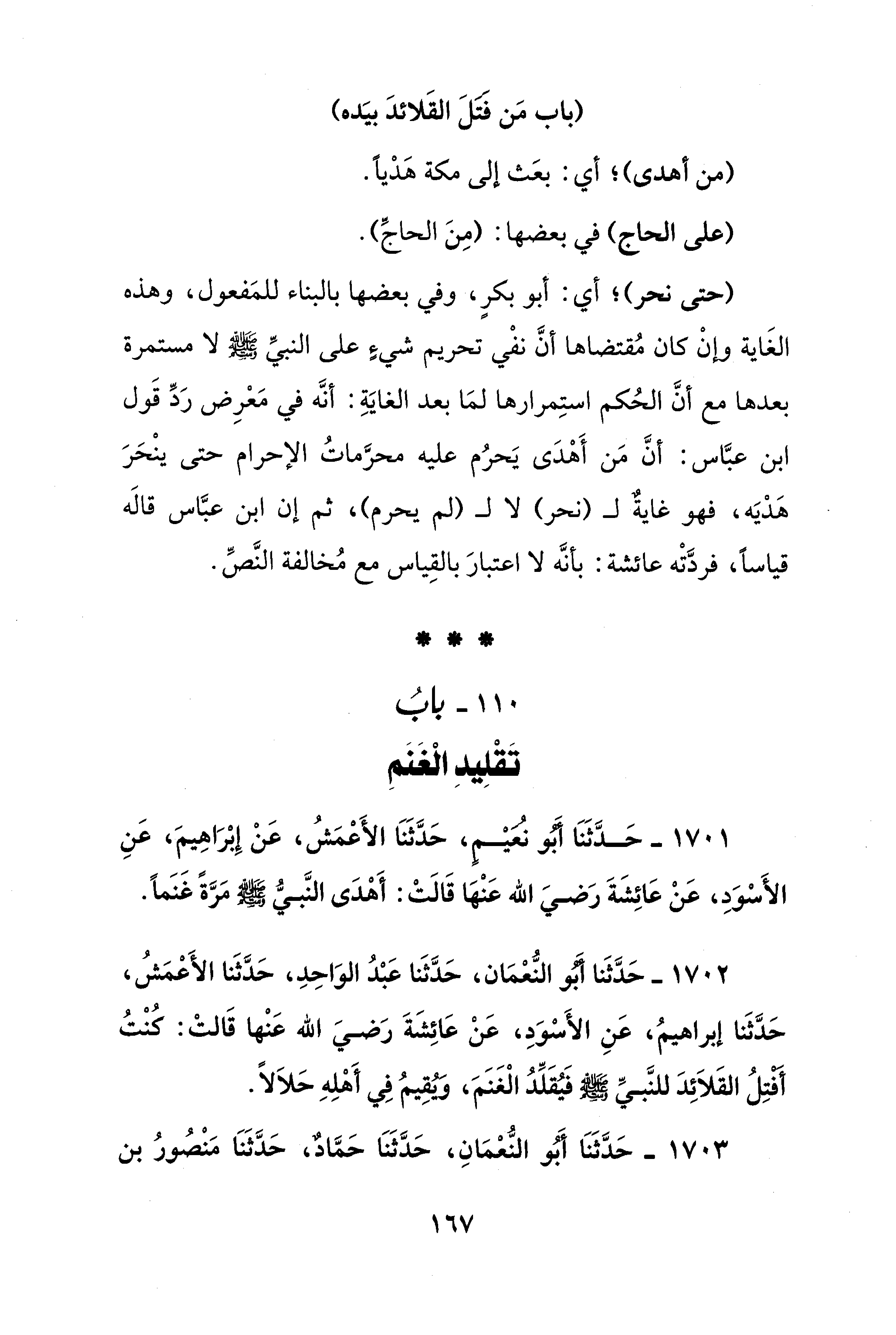 1702 - حَدَّثَنا أَبُو النُّعْمَان، حَدَّثَنا عَبْدُ الوَاحِدِ، حَدَّثَنا الأَعْمَشُ، حَدَّثَنا إبراهيمُ، عَنِ الأَسْوَدِ، عَنْ عَائِشَةَ رَضيَ الله عَنْها قَالتْ: كُنْتُ أفتِلُ القَلَائِدَ للنَّبيِّ - صلى الله عليه وسلم - فَيُقَلِّدُ الْغَنَمَ، ويُقِيمُ فِي أَهْلِهِ حَلَالًا.