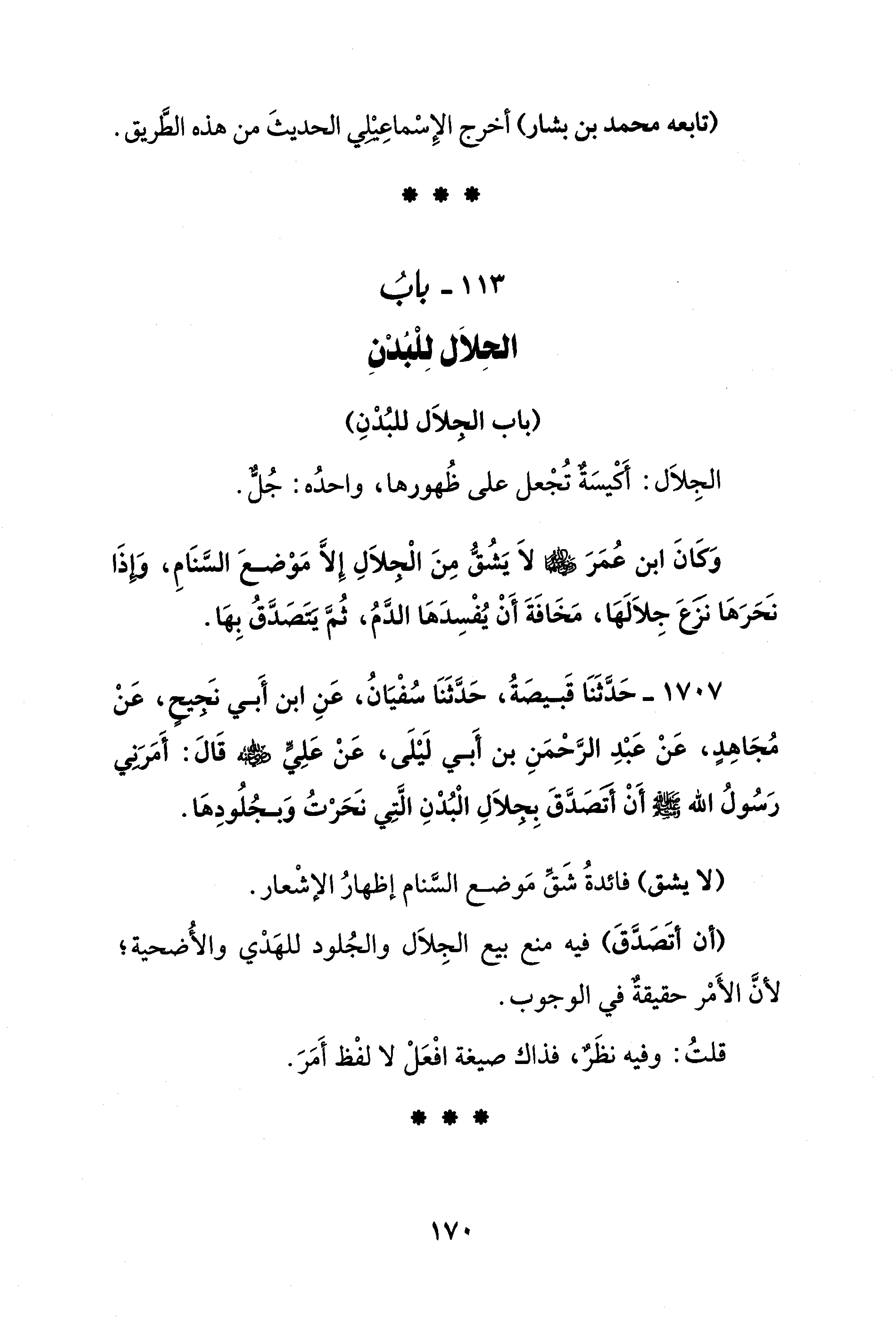 1707 - حَدَّثَنَا قَبيصَةُ، حَدَّثَنَا سُفْيَانُ، عَنِ ابن أَبي نَجِيحٍ، عَنْ مُجَاهِدٍ، عَنْ عَبْدِ الرَّحْمَنِ بن أَبي لَيْلَى، عَنْ عَلِيٍّ قَالَ: أَمَرَنِي رَسُولُ الله - صلى الله عليه وسلم - أَنْ أتصَدَّقَ بِجلَالِ الْبُدْنِ الَّتِي نَحَرْتُ وَبجُلُودِهَا.