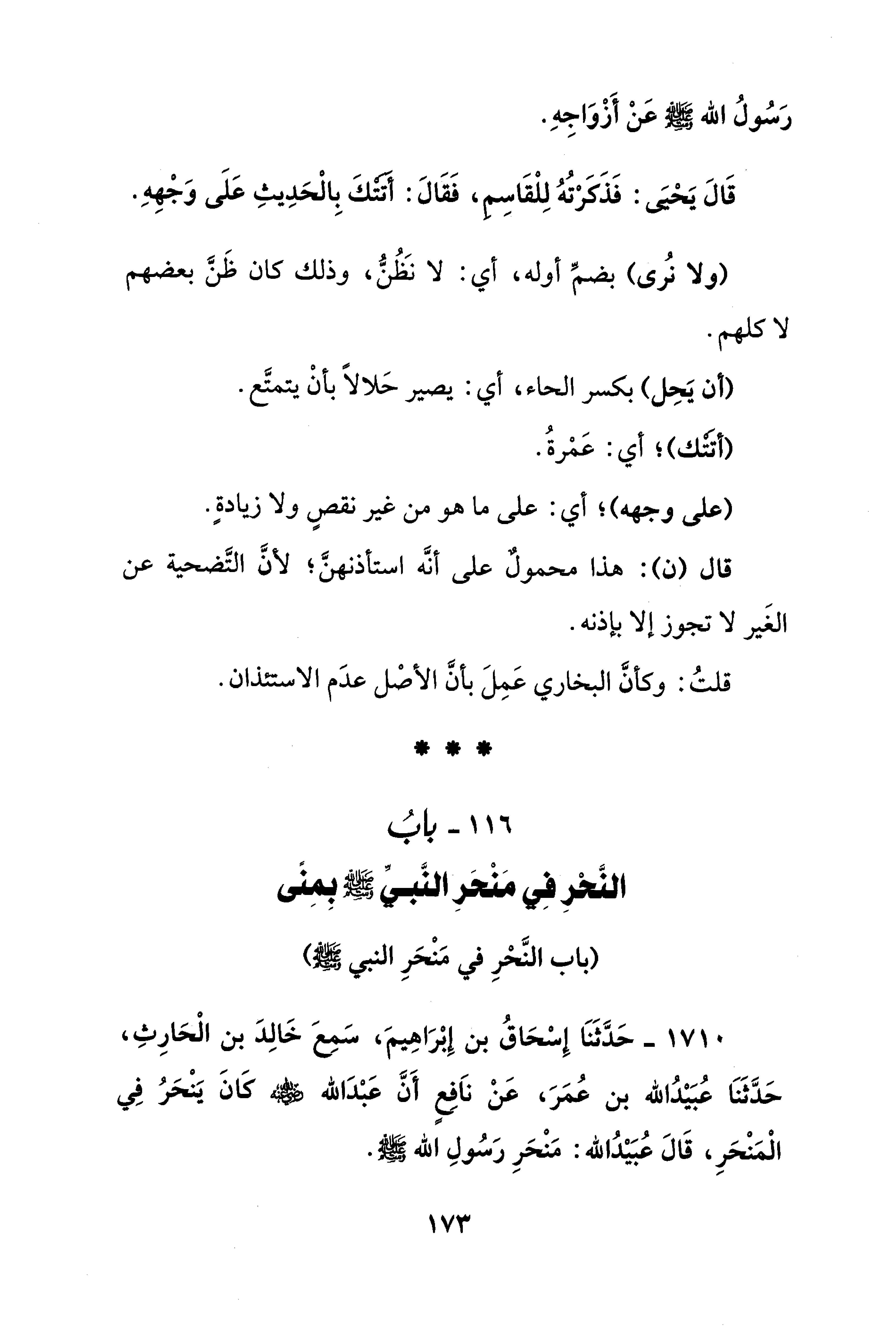 1710 - حَدَّثَنَا إِسْحَاقُ بن إِبْرَاهِيمَ، سَمعَ خَالِدَ بن الْحَارِثِ، حَدَّثَنَا عُبَيْدُ الله بن عُمَرَ، عَنْ نَافِعٍ أَنَّ عَبْدَ الله - رضي الله عنه - كَانَ يَنْحَرُ فِي الْمَنْحَرِ، قَالَ عُبَيْدُ الله: مَنْحَرِ رَسُولِ الله - صلى الله عليه وسلم -.