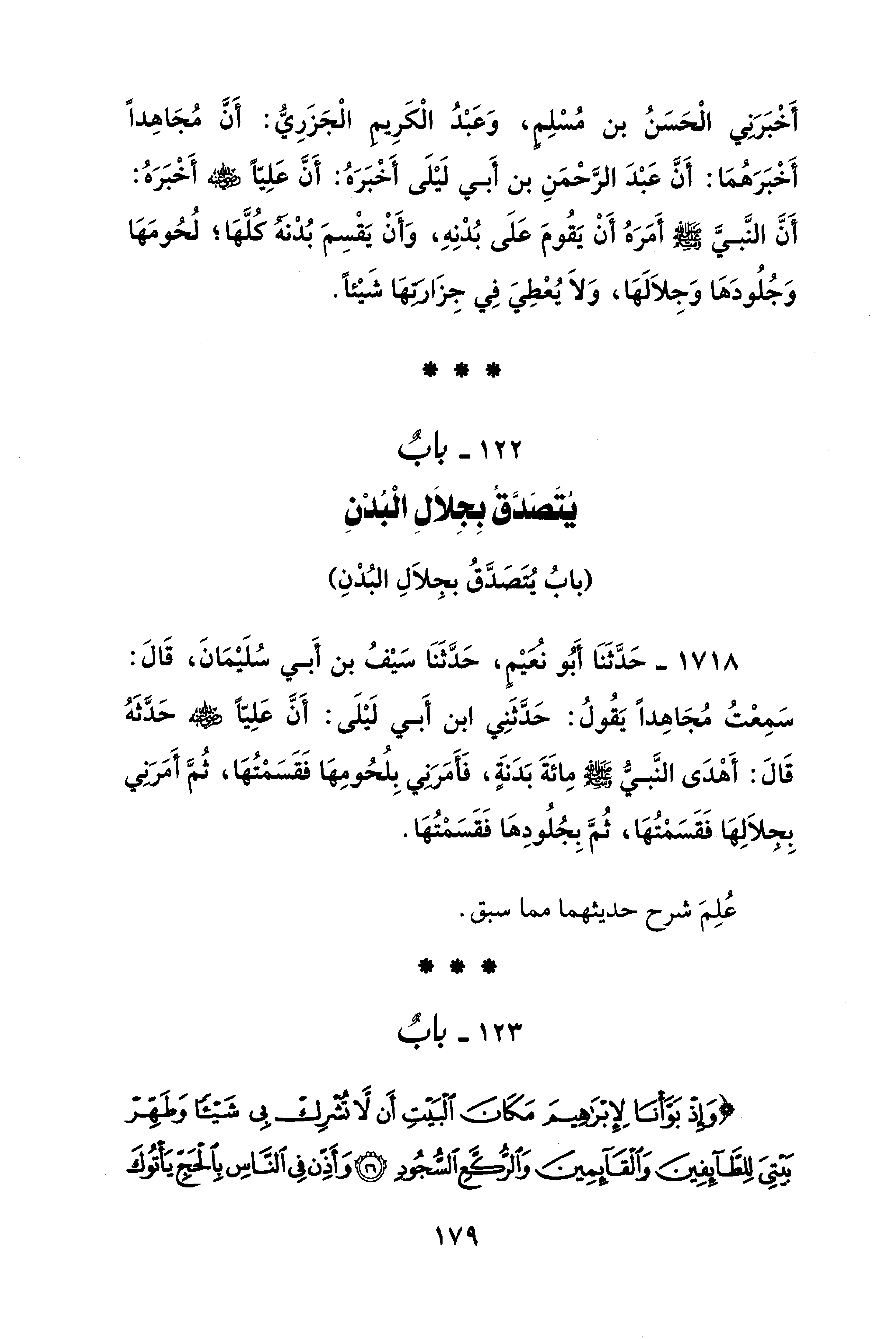 1718 - حَدَّثَنَا أَبُو نُعَيْمٍ، حَدَّثَنَا سَيْفُ بن أَبي سُلَيْمَانَ، قَالَ: سَمِعْتُ مُجَاهِدًا يَقُولُ: حَدَّثَنِي ابن أَبي لَيْلَى: أَنَّ عَلِيًّا - رضي الله عنه - حَدَّثَهُ قَالَ: أَهْدَى النَّبيُّ - صلى الله عليه وسلم - مِائَةَ بَدَنَةٍ، فَأَمَرَنِي بِلُحُومِهَا فَقَسَمْتُهَا، ثُمَّ أَمَرَنِي بِجلَالِهَا فَقَسَمْتُهَا، ثُمَّ بِجُلُودِهَا فَقَسَمْتُهَا.