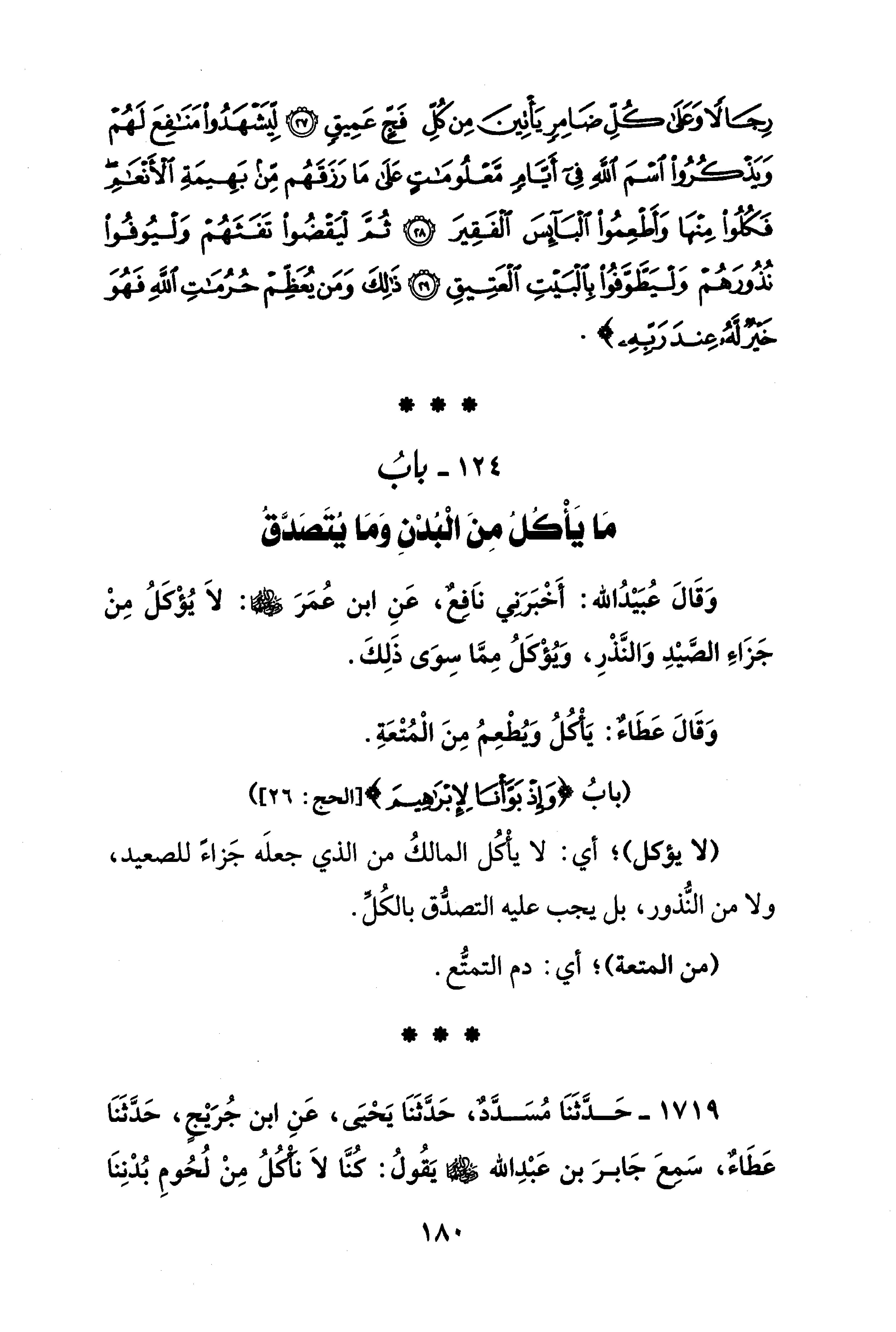 1719 - حَدَّثَنَا مُسَدَّدٌ، حَدَّثَنَا يَحْيَى، عَنِ ابن جُرَيْجٍ، حَدَّثَنَا عَطَاءٌ، سَمعَ جَابرَ بن عَبْدِ الله - رضي الله عنهما - يَقُولُ: كُنَّا لَا نَأكُلُ مِنْ لُحُومِ بُدْنِنَا