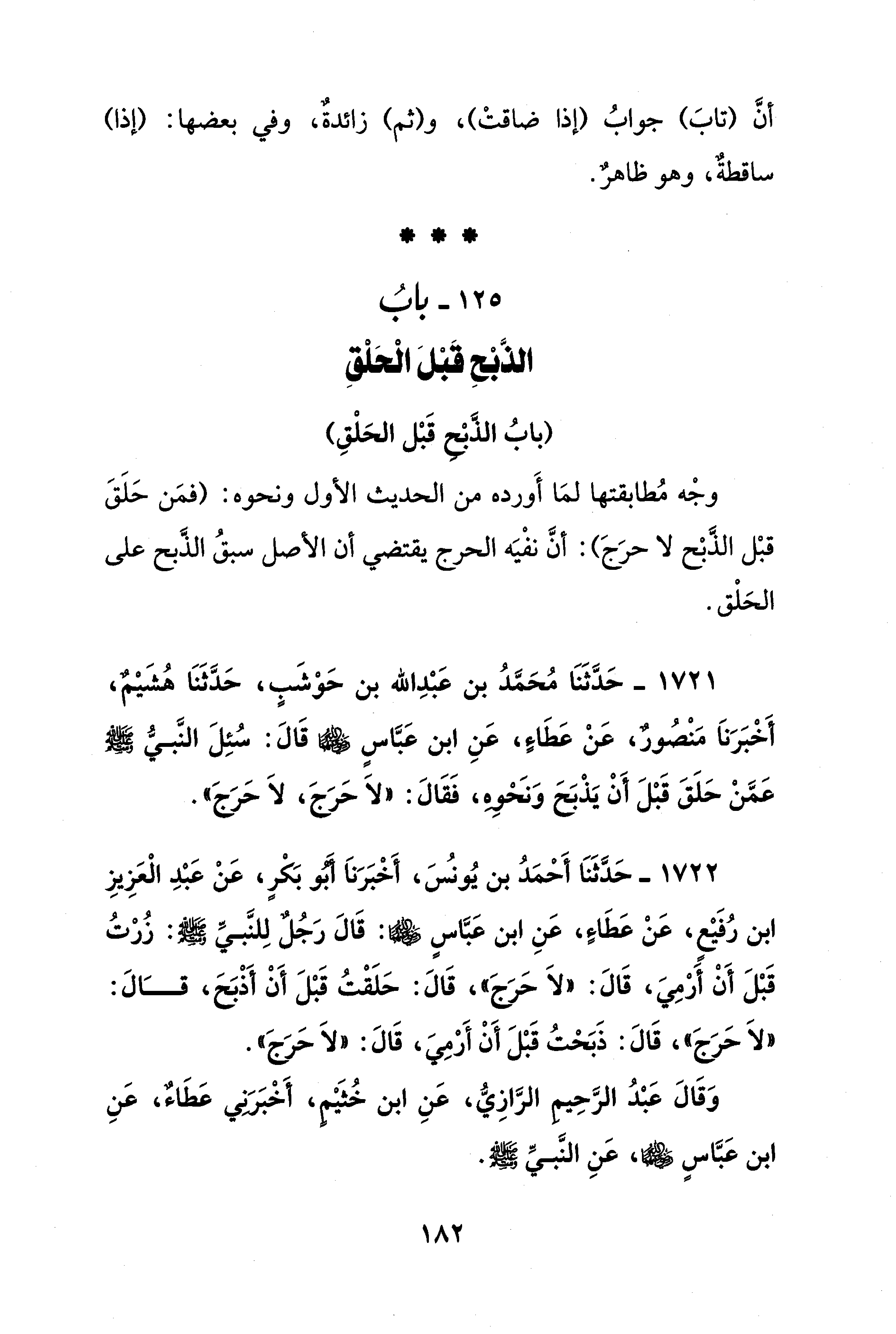 125 - بابُ الذَّبْحِ قَبْلَ الْحَلْقِ
