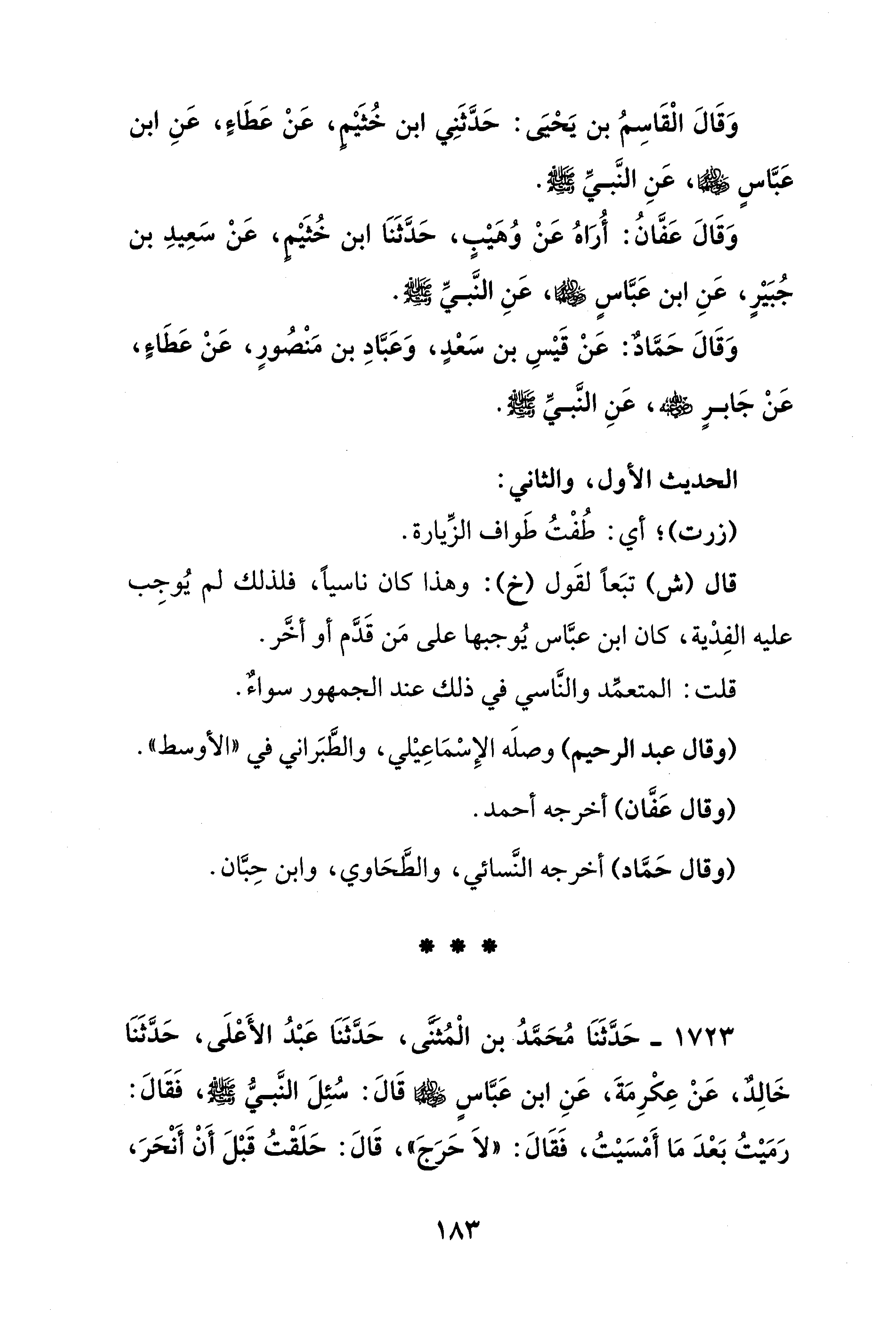 1723 - حَدَّثَنَا مُحَمَّدُ بن الْمُثَنَّى، حَدَّثَنَا عَبْدُ الأَعْلَى، حَدَّثَنَا خَالِدٌ، عَنْ عِكْرِمَةَ، عَنِ ابن عَبَّاسٍ - رضي الله عنهما - قَالَ: سُئِلَ النَّبيُّ - صلى الله عليه وسلم -، فَقَالَ: رَمَيْتُ بَعْدَ مَا أَمْسَيْتُ، فَقَالَ: "لَا حَرَجَ"، قَالَ: حَلَقْتُ قَبْلَ أَنْ أَنْحَرَ،