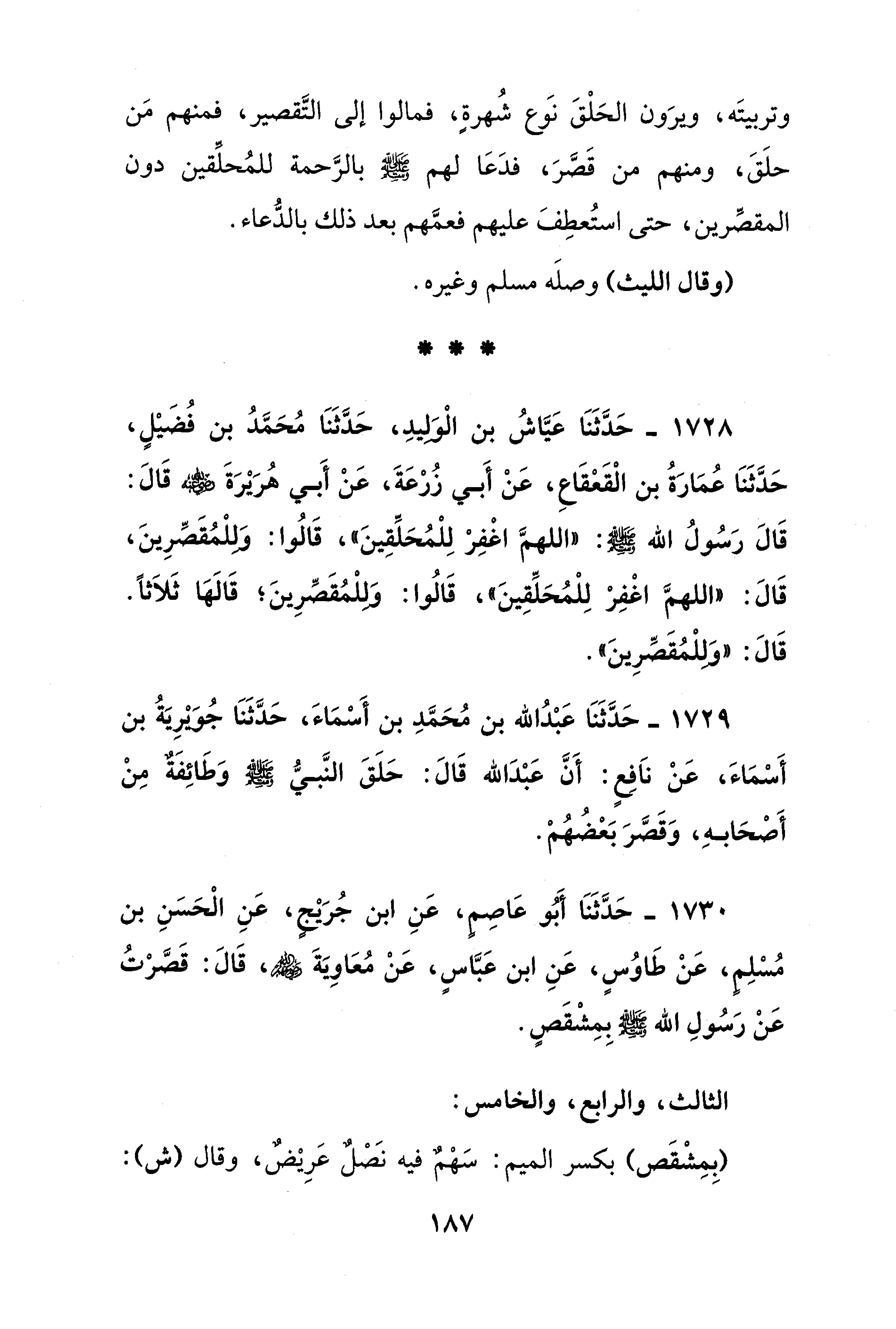 1729 - حَدَّثَنَا عَبْدُ الله بن مُحَمَّدِ بن أَسْمَاءَ، حَدَّثَنَا جُويرِيَةُ بن أَسْمَاءَ، عَنْ نَافِعٍ: أَنَّ عَبْدَ الله قَالَ: حَلَقَ النَّبيُّ - صلى الله عليه وسلم - وَطَائِفَةٌ مِنْ أَصْحَابهِ، وَقَصَّرَ بَعْضُهُمْ.