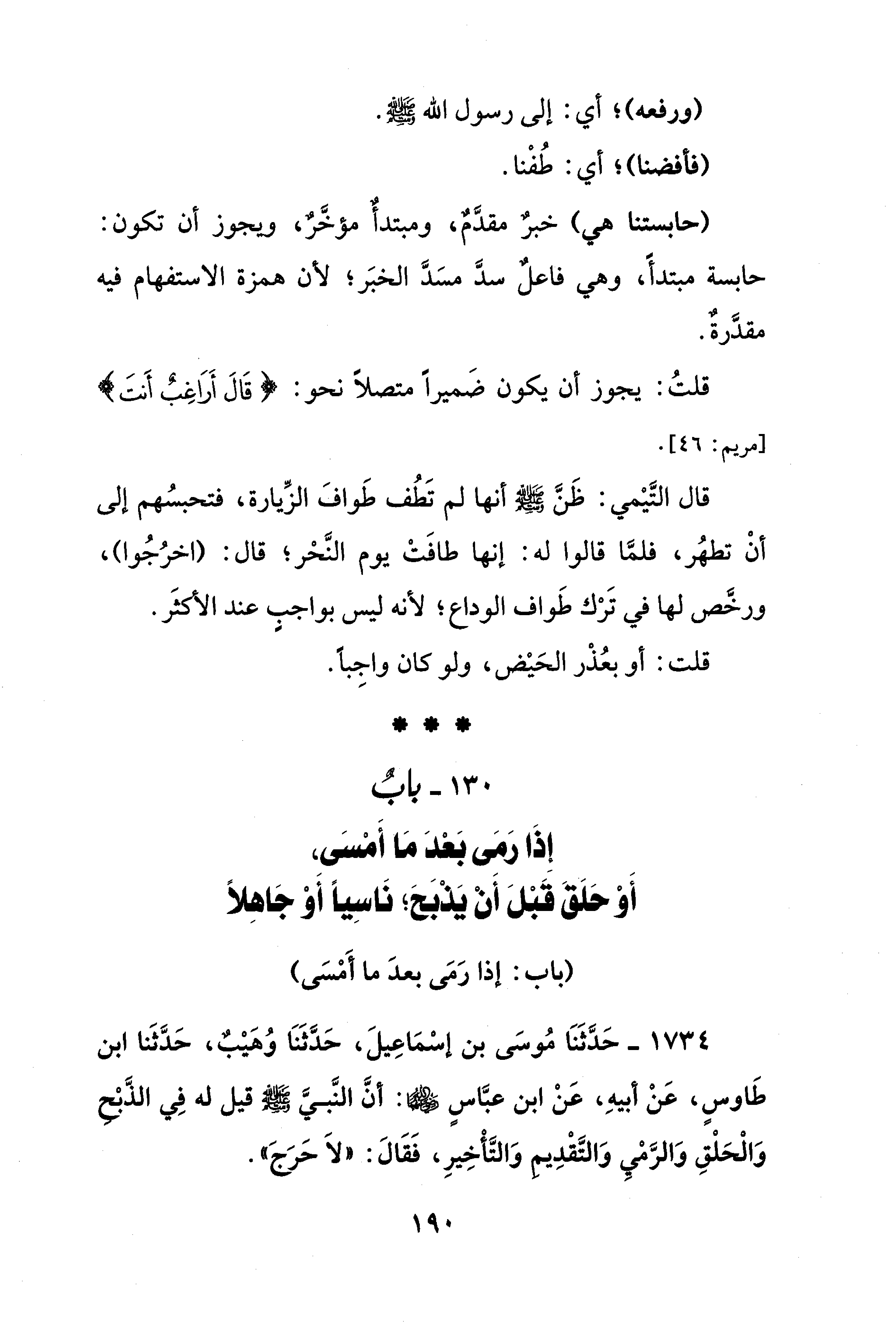 1734 - حَدَّثَنَا مُوسَى بن إسْمَاعِيلَ، حَدَّثَنَا وُهَيْبٌ، حَدَّثَنا ابن طَاوسٍ، عَنْ أبيهِ، عَنْ ابن عبَّاسٍ - رضي الله عنهما -: أنَّ النَّبيَّ - صلى الله عليه وسلم - قيل له فِي الذَّبْحِ وَالْحَلْقِ وَالرَّمْيِ وَالتَّقْدِيمِ وَالتَّأْخِيرِ، فَقَالَ: "لَا حَرَجَ".