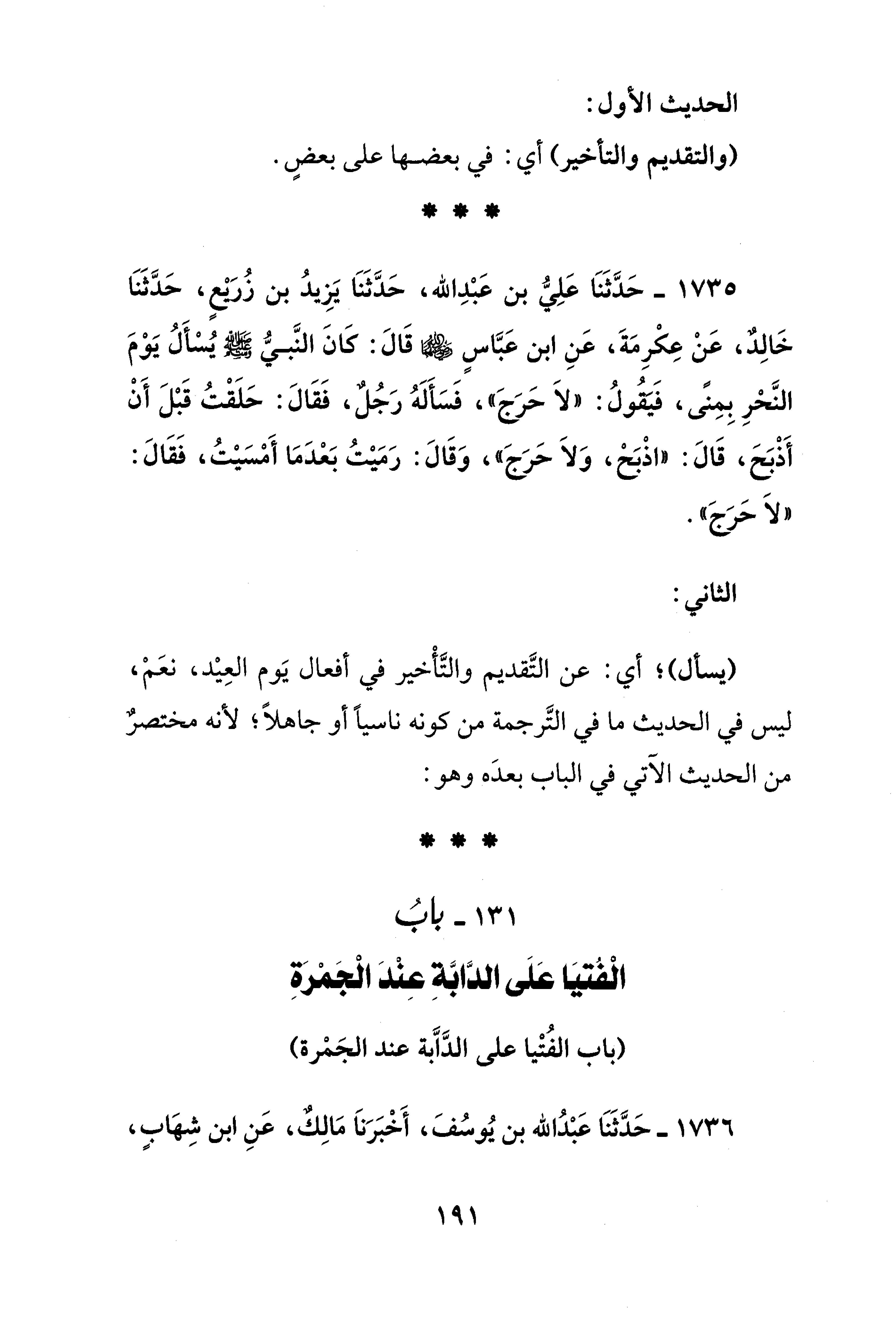 1735 - حَدَّثَنَا عَلِيُّ بن عَبْدِ الله، حَدَّثَنَا يَزِيدُ بن زُريعٍ، حَدَّثَنَا خَالِدٌ، عَنْ عِكْرِمَةَ، عَنِ ابن عَبَّاسٍ - رضي الله عنهما - قَالَ: كَانَ النَّبيُّ - صلى الله عليه وسلم - يُسْأَلُ يَوْمَ النَّحْرِ بِمِنًى، فَيَقُولُ: "لَا حَرَجَ"، فَسَألهُ رَجُلٌ، فَقَالَ: حَلَقْتُ قَبْلَ أَنْ أَذْبَحَ، قَالَ: "اذْبَحْ، وَلَا حَرَجَ"، وَقَالَ: رَمَيْتُ بَعْدَمَا أَمْسَيْتُ، فَقَالَ: "لَا حَرَجَ".