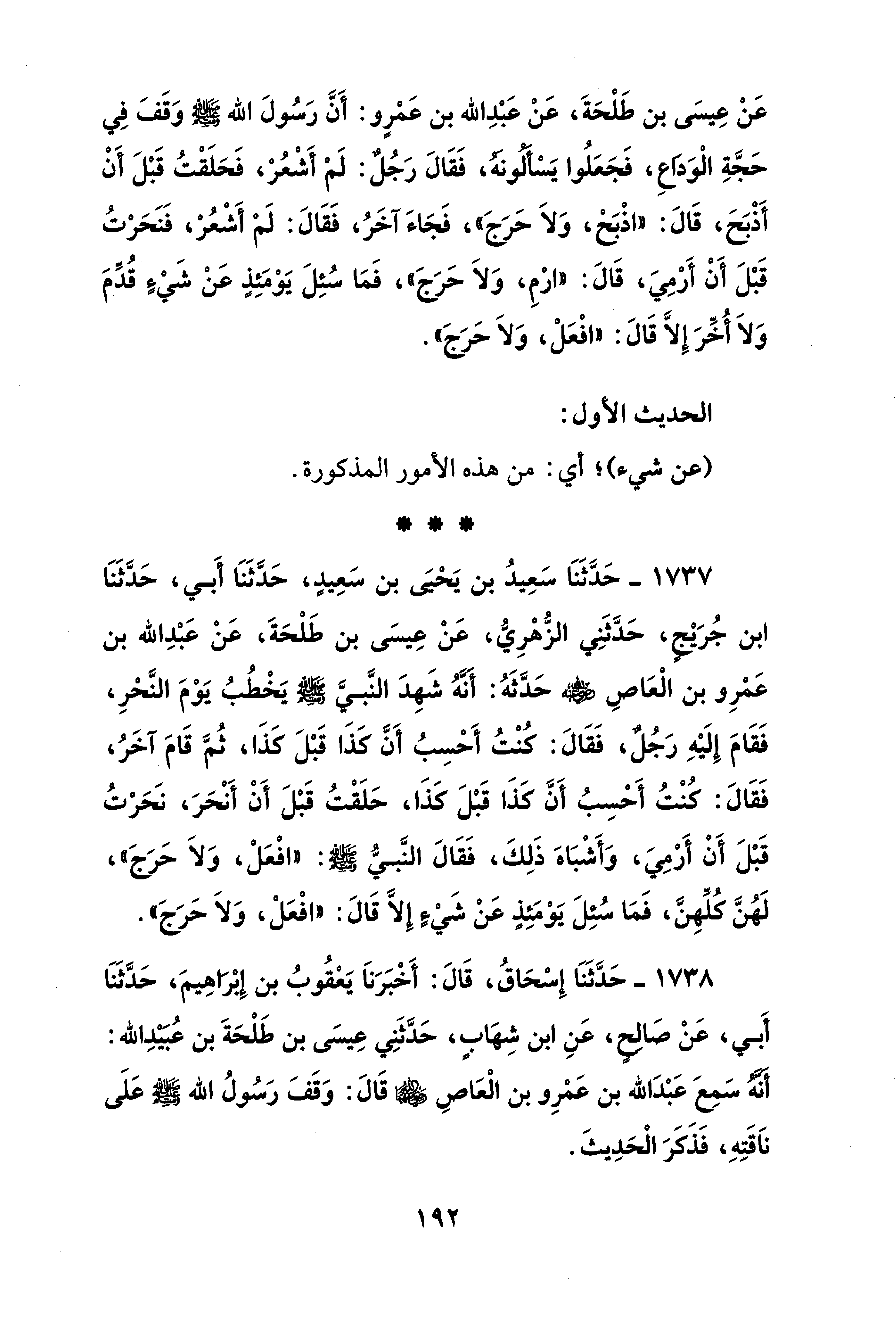 1737 - حَدَّثَنَا سَعِيدُ بن يَحْيَى بن سَعِيدٍ، حَدَّثَنَا أَبي، حَدَّثَنَا ابن جُرَيْجٍ، حَدَّثَنِي الزُّهْرِيُّ، عَنْ عِيسَى بن طَلْحَةَ، عَنْ عَبْدِ الله بن عَمْرِو بن الْعَاصِ - رضي الله عنه - حَدَّثَهُ: أَنَّهُ شَهِدَ النَّبيَّ - صلى الله عليه وسلم - يَخْطُبُ يَوْمَ النَّحْرِ، فَقَامَ إِلَيْهِ رَجُلٌ، فَقَالَ: كنْتُ أَحْسِبُ أَنَّ كَذَا قَبْلَ كَذَا، ثُمَّ قَامَ آخَرُ، فَقَالَ: كنْتُ أَحْسِبُ أَنَّ كَذَا قَبْلَ كَذَا، حَلَقْتُ قَبْلَ أَنْ أَنْحَرَ، نَحَرْتُ قَبْلَ أَنْ أَرْمِيَ، وَأَشْبَاهَ ذَلِكَ، فَقَالَ النَّبيُّ - صلى الله عليه وسلم -: "افْعَلْ، وَلَا حَرَجَ"، لَهُنَّ كلِّهِنَّ، فَمَا سُئِلَ يَوْمَئِذٍ عَنْ شَيْءٍ إلا قَالَ: "افْعَلْ، وَلَا حَرَجَ".