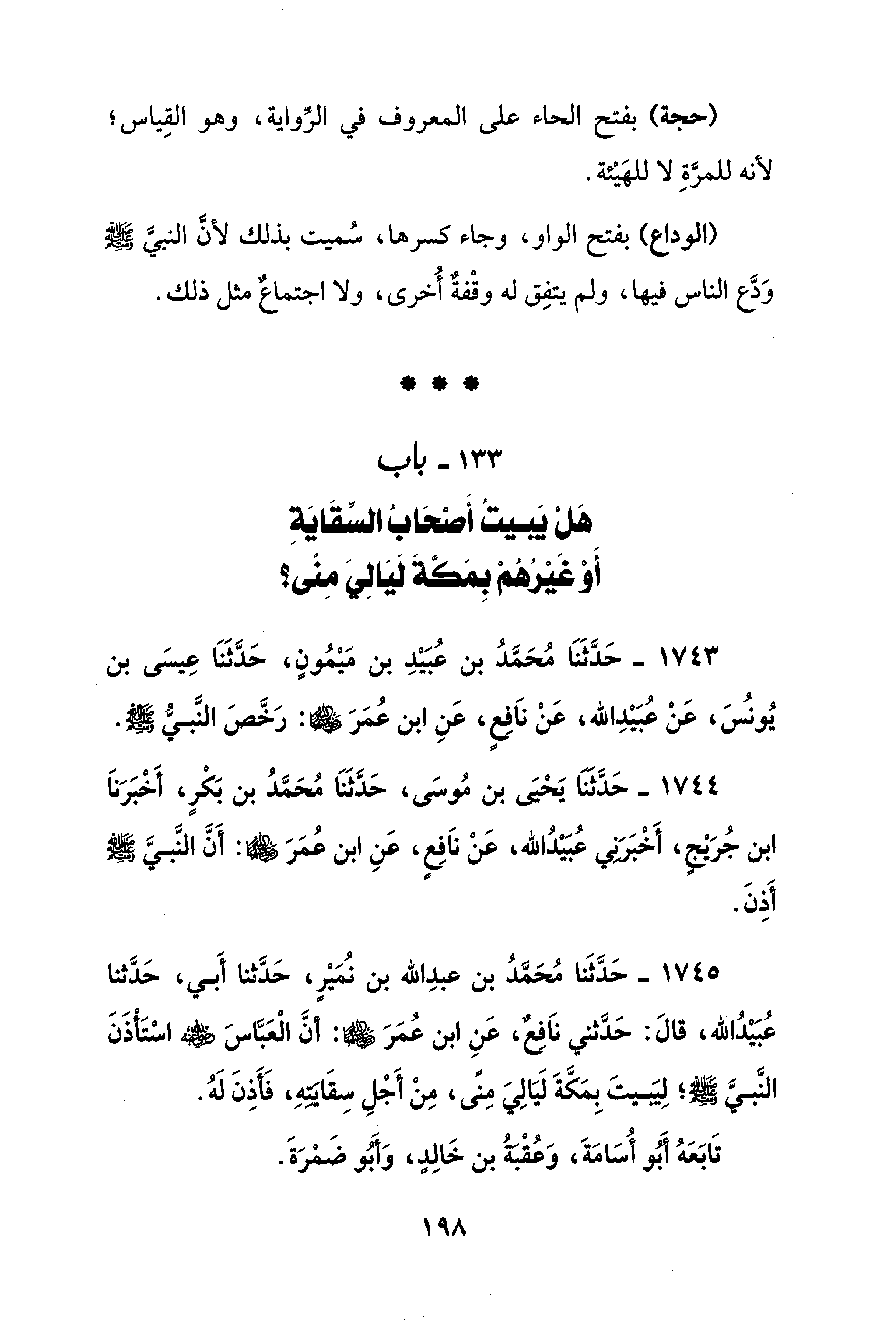 1745 - حَدَّثَنا مُحَمَّدُ بن عبدِ الله بن نُمَيْرٍ، حَدَّثنا أَبي، حَدَّثنا عُبَيْدُ الله، قالَ: حَدَّثني نَافِعٌ، عَنِ ابن عُمَرَ - رضي الله عنهما -: أنَّ الْعَبَّاسَ - رضي الله عنه - اسْتَأْذَنَ النَّبيَّ - صلى الله عليه وسلم -؛ لِيَبيتَ بِمَكَّةَ لَيَالِيَ مِنًى، مِنْ أَجْلِ سِقَايَتِهِ، فَأَذِنَ لَهُ.