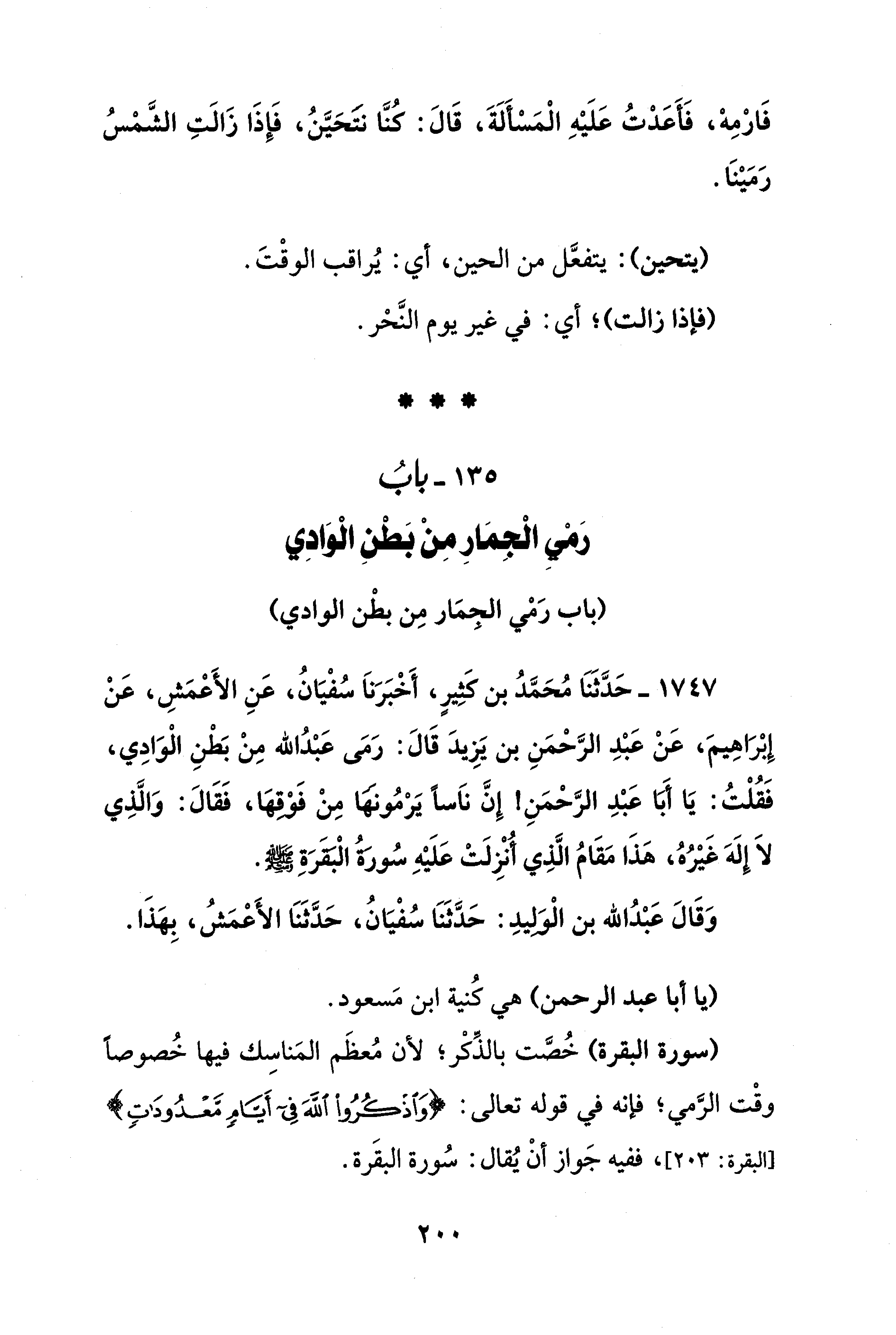 135 - بابُ رَمْيِ الْجِمَارِ مِنْ بَطْنِ الْوَادِي