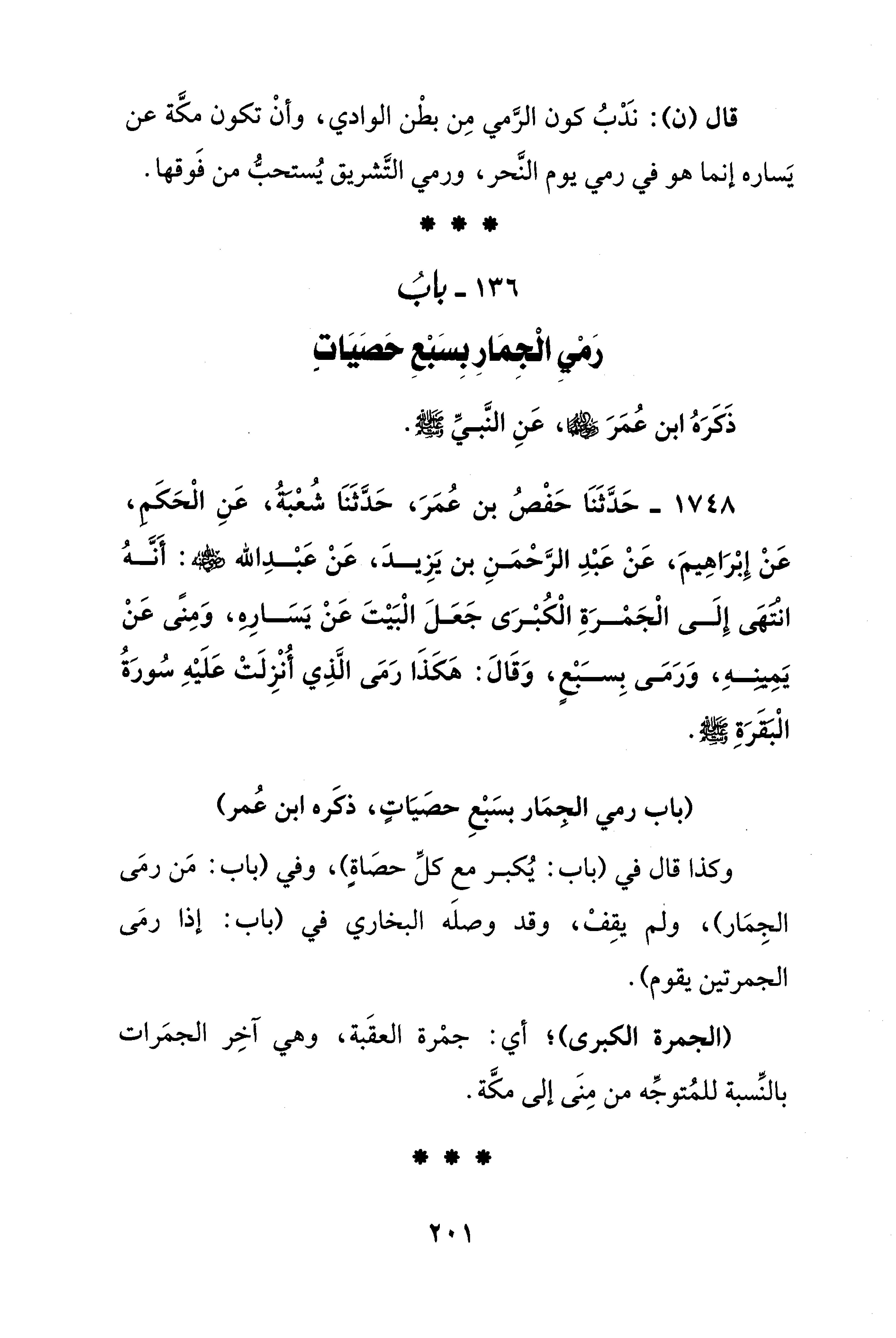 136 - بابُ رَمْيِ الْجِمَارِ بِسَبْعِ حَصَيَات