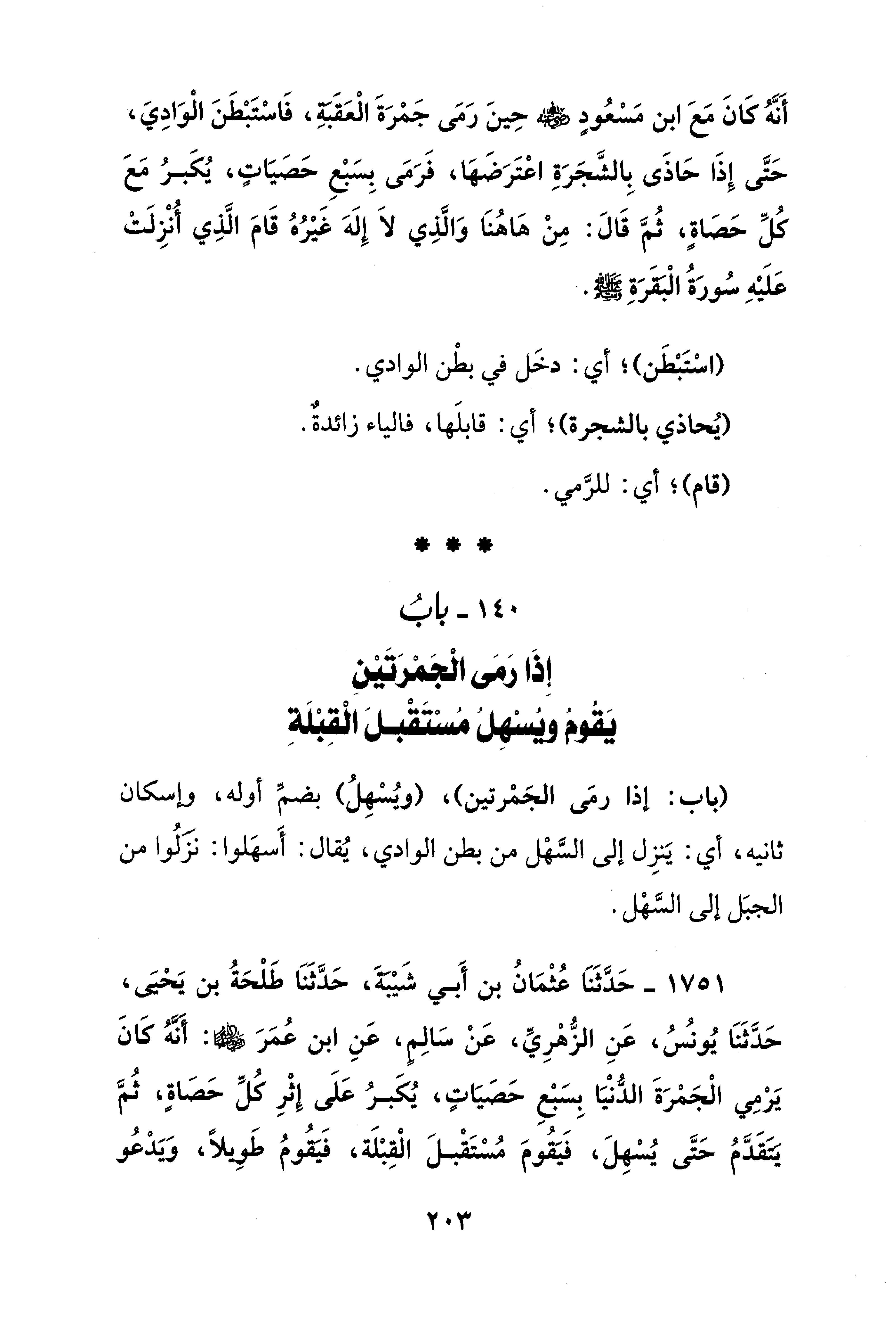 1751 - حَدَّثَنَا عُثْمَانُ بن أَبي شَيْبةَ، حَدَّثَنَا طَلْحَةُ بن يَحْيَى، حَدَّثَنَا يُونس، عَنِ الزُّهْرِيِّ، عَنْ سَالِم، عَنِ ابن عُمَرَ - رضي الله عنهما -: أَنَّهُ كَانَ يَرْمِي الْجَمْرَةَ الدُّنْيَا بِسَبْعِ حَصَيَات، يُكَبرُ عَلَى إِثْرِ كُلِّ حَصَاةٍ، ثُمَّ يتقَدَّمُ حَتَّى يُسْهِلَ، فَيقُومَ مُسْتَقْبلَ الْقِبْلَة، فَتقُومُ طَوِيلًا، وَيَدْعُو