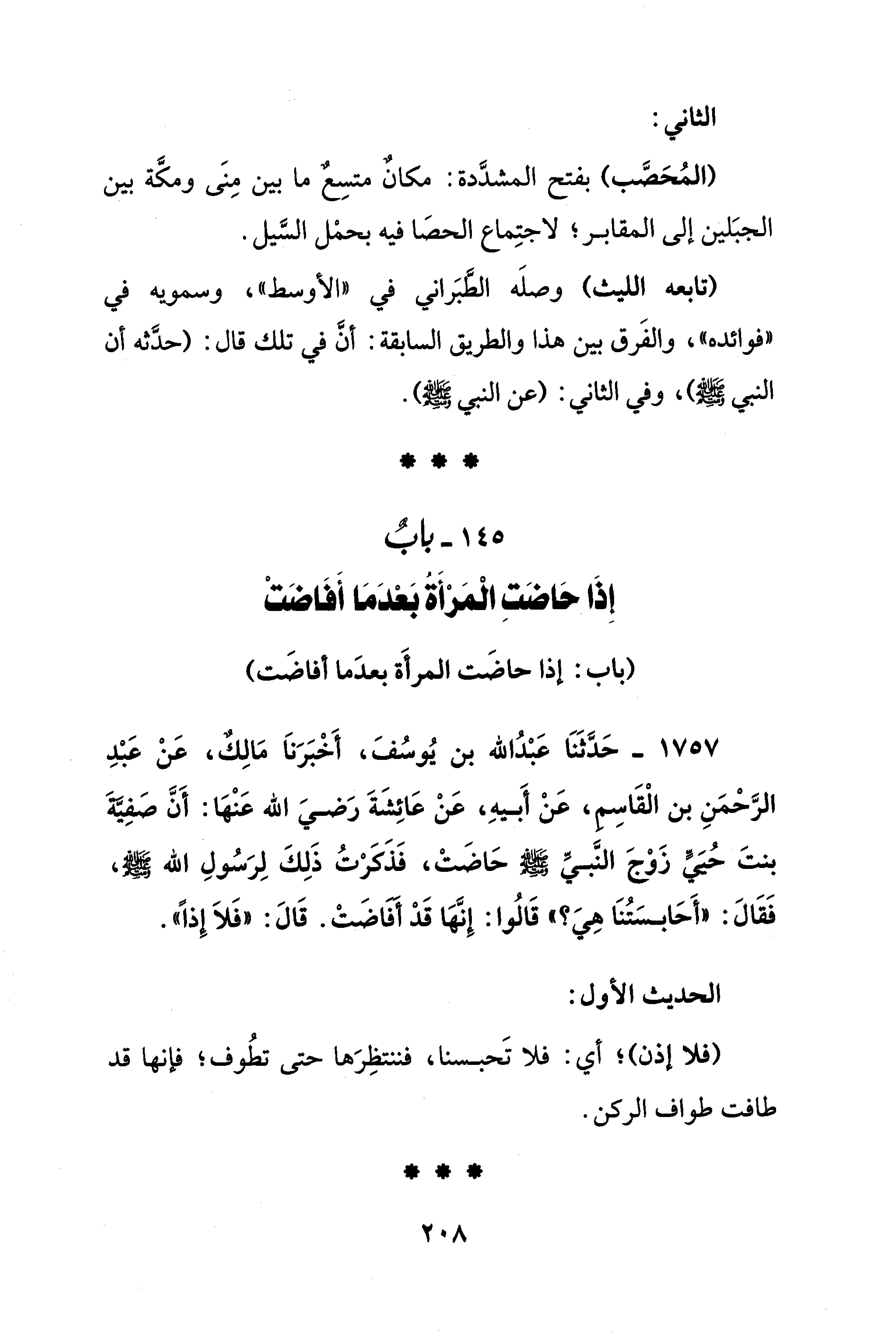 1757 - حَدَّثَنَا عَبْدُ الله بن يُوسُفَ، أَخْبَرَناَ مَالِكٌ، عَنْ عَبْدِ الرَّحْمَنِ بن الْقَاسم، عَنْ أَبيهِ، عَنْ عَائِشَةَ رَضيَ الله عَنْهَا: أَنَّ صَفِيَّةَ بنتَ حُيَيٍّ زَوْجَ النَّبيِّ - صلى الله عليه وسلم - حَاضَتْ، فَذَكَرتُ ذَلِكَ لِرَسُولِ الله - صلى الله عليه وسلم -، فَقَالَ: "أَحَابسَتُنَا هِيَ؟ " قَالُوا: إنَّهَا قَدْ أفاضَتْ. قَالَ: "فَلاَ إِذًا".