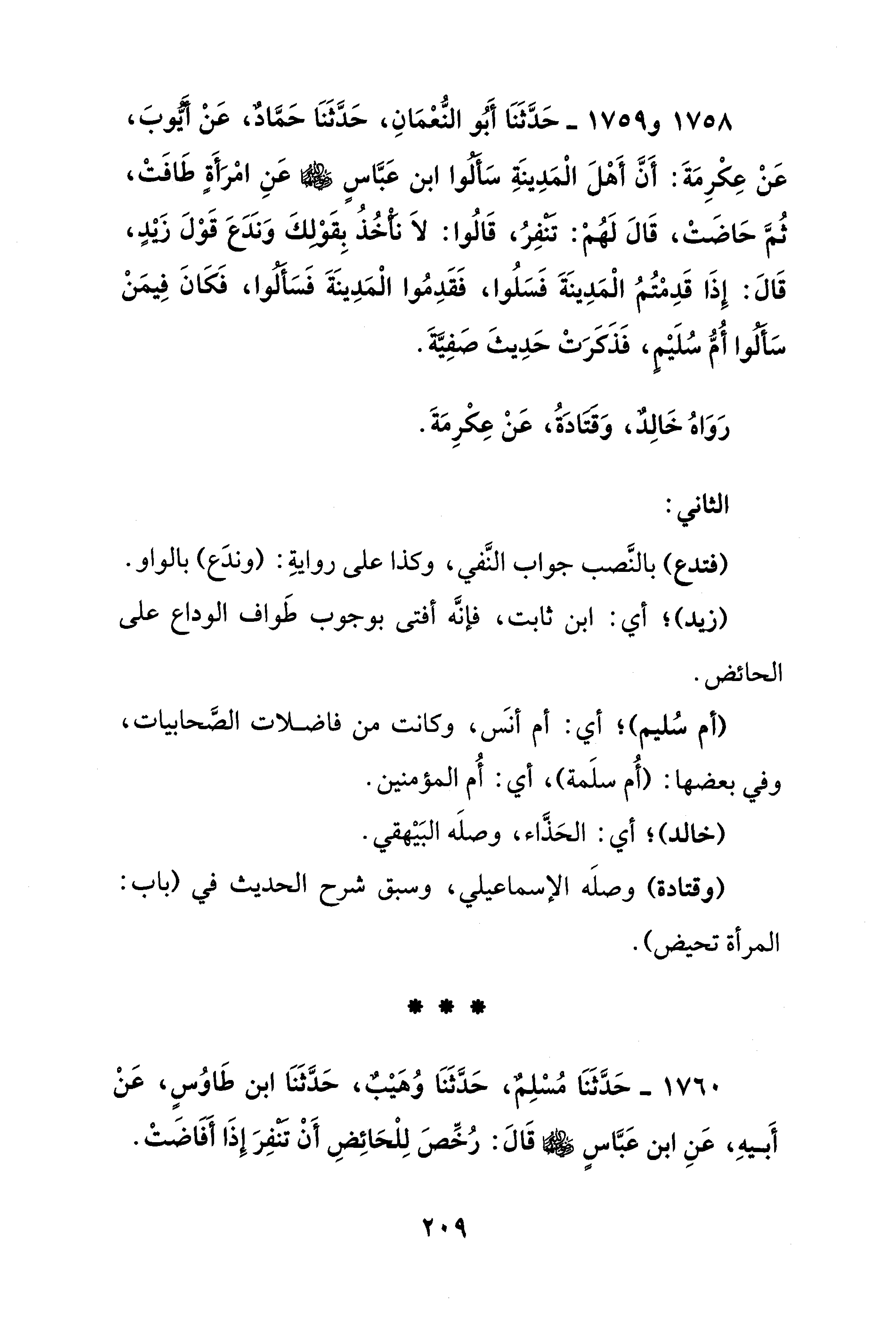 1758 - و 1759 - حَدَّثَنَا أَبُو النُّعْمَانِ، حَدَّثَنَا حَمَّادٌ، عَنْ أَيَّوبَ، عَنْ عِكْرِمَةَ: أَنَّ أَهْلَ الْمَدِينَةِ سَألوا ابن عَبَّاس - رضي الله عنهما - عَنِ امْرَأَةٍ طَافَتْ، ثُمَّ حَاضَتْ، قَالَ لَهُمْ: تنفِرُ، قَالُوا: لاَ نأخُذُ بِقَوْلكَ وَندَعَ قَوْلَ زيدٍ، قَالَ: إِذَا قَدِمْتُمُ الْمَدِينَةَ فَسَلُوا، فَقَدِمُوا الْمَدِينَةَ فَسَألوا، فَكَانَ فِيمَنْ سَألوا أُمُّ سُلَيْم، فَذَكَرَتْ حَدِيثَ صَفِيةَ.