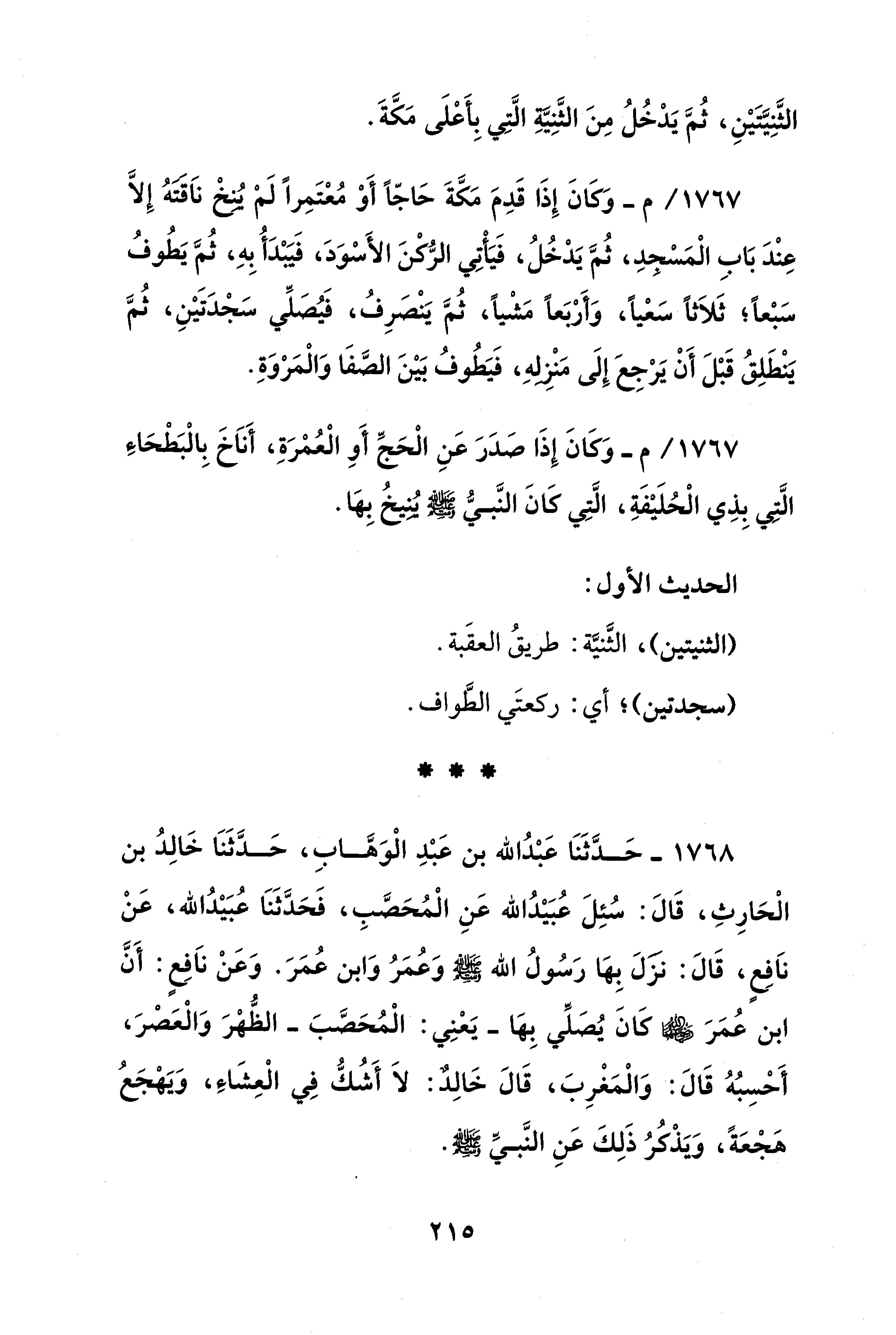 1767 / -م - وَكَانَ إِذَا صدَرَ عَنِ الْحَجِّ أَوِ الْعُمْرَةِ، أَناَخَ بِالْبَطْحَاءَ الَّتِي بِذِي الْحُلَيْفَةِ، الَّتِي كَانَ النَّبيُّ - صلى الله عليه وسلم - ينيخُ بِهَا.