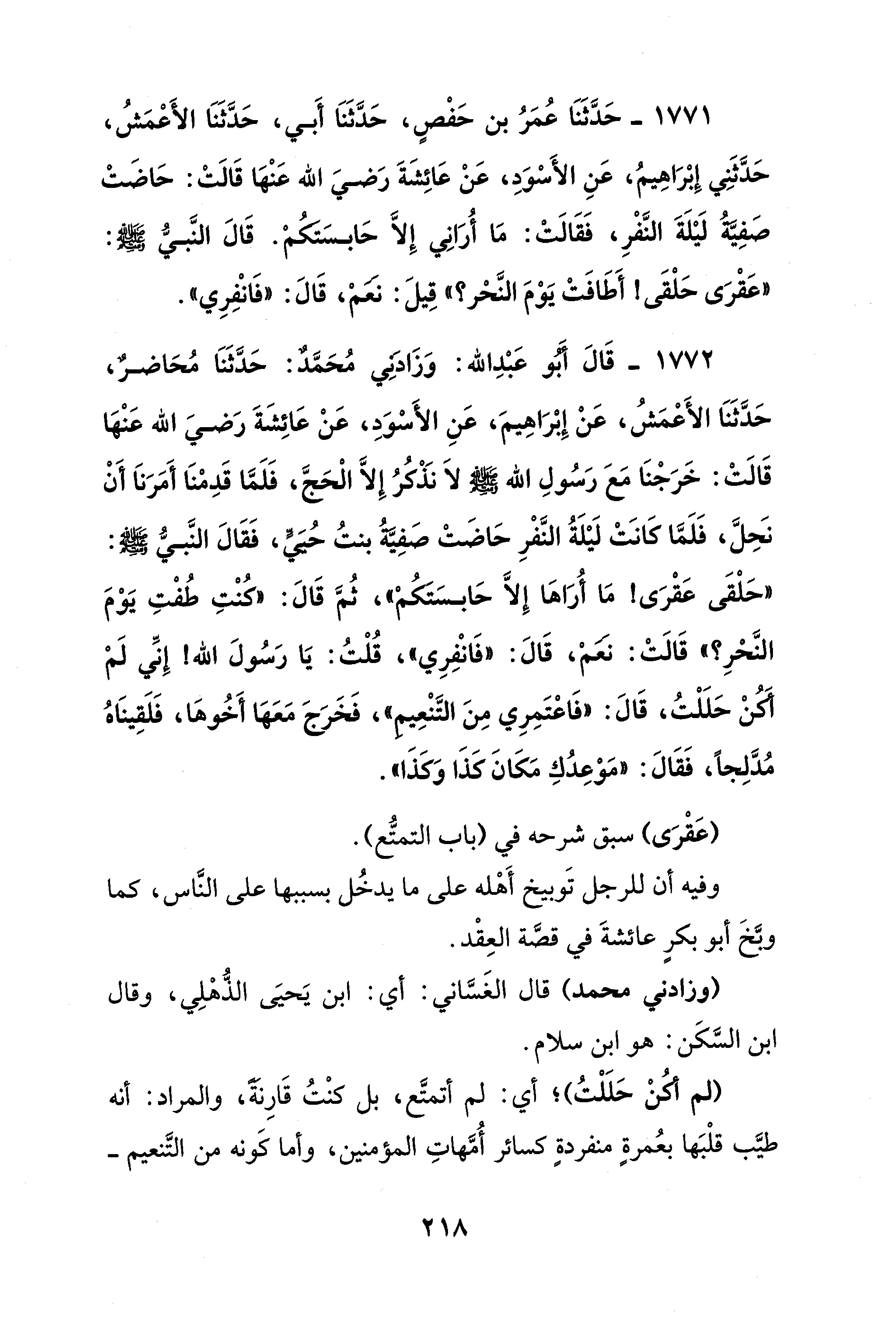 1772 - قَالَ أَبُو عَبْدِ الله: وَزَادني مُحَمَّد: حَدَّثَنَا مُحَاضرٌ، حَدَّثَنَا الأَعْمَشُ، عَنْ إِبْرَاهِيمَ، عَنِ الأَسْوَدِ، عَنْ عَائِشَةَ رَضيَ الله عَنْهَا قَالَتْ: خَرَجْنَا مَعَ رَسُولِ الله - صلى الله عليه وسلم - لاَ نَذْكُرُ إِلَّا الْحَجَّ، فَلَمَّا قَدِمْنَا أَمَرَناَ أَنْ نَحِلَّ، فَلَمَّا كَانَتْ لَيْلَةُ النَّفْرِ حَاضَتْ صفِيةُ بنتُ حُيَيٍّ، فَقَالَ النَّبيّ - صلى الله عليه وسلم -: "حَلْقَى عَقْرَى! مَا أُرَاهَا إِلَّا حَابسَتكُمْ"، ثُمَّ قَالَ: "كنْتِ طُفْتِ يَوْمَ النَّحْرِ؟ " قَالَتْ: نعمْ، قَالَ: "فَانْفِرِي"، قُلْتُ: يَا رَسُولَ الله! إِنِّي لَمْ أكَنْ حَلَلْتُ، قَالَ: "فَاعْتَمِرِي مِنَ التَّنْعِيم"، فَخَرَجَ مَعَهَا أَخُوهَا، فَلَقِينَاهُ مُدَّلِجًا، فَقَالَ: "مَوْعِدُكِ مَكَانَ كَذَا وَكَذَا".