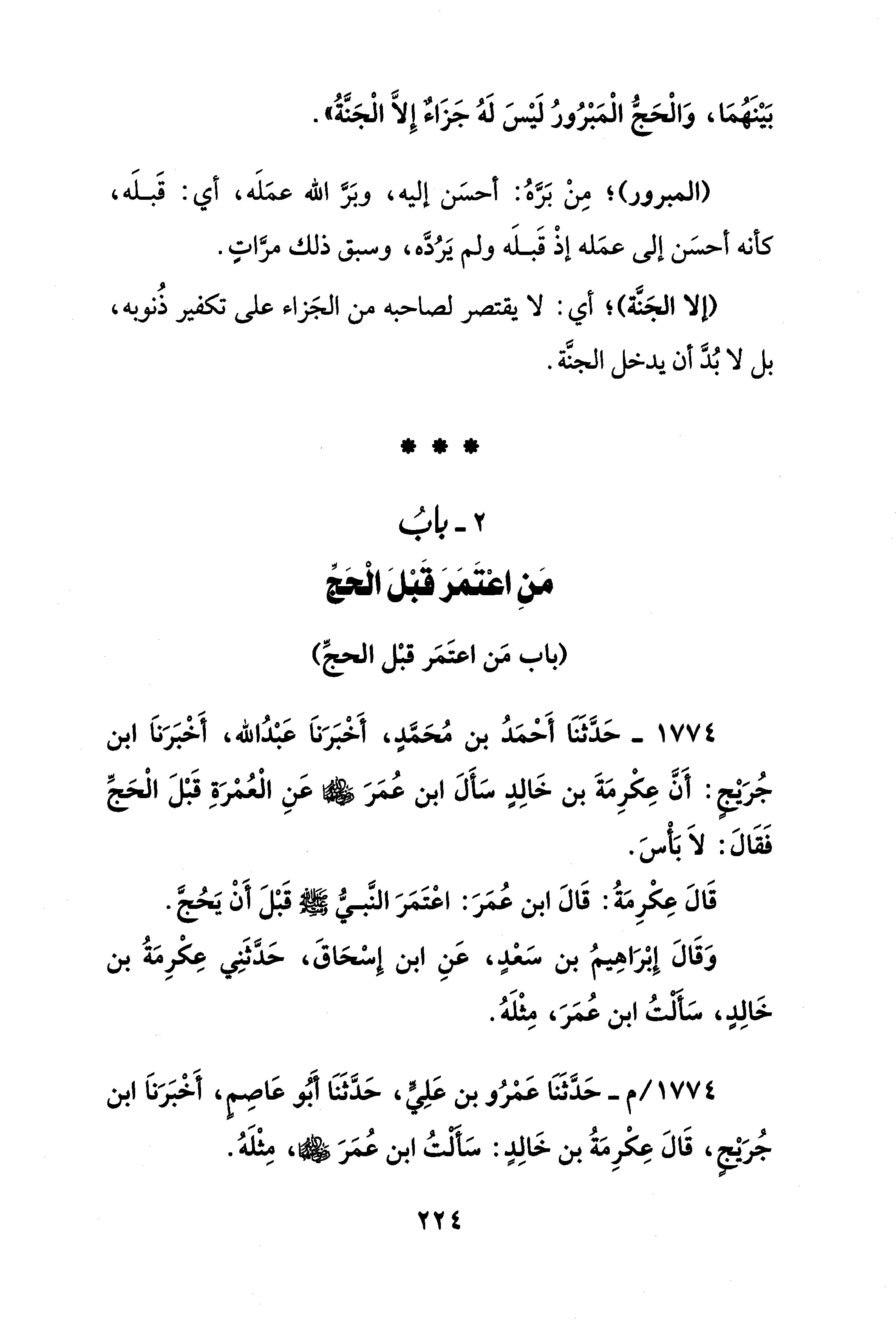 1774 - حَدَّثَنَا أَحْمَدُ بن مُحَمَّدٍ، أَخْبَرَناَ عَبْدُ الله، أَخْبَرَناَ ابن جُرَيْجٍ: أَنَّ عِكْرِمَةَ بن خَالِدٍ سَألَ ابن عُمَرَ - رضي الله عنهما - عَنِ الْعُمْرَةِ قَبْلَ الْحَجِّ فَقَالَ: لاَ بَأسَ.