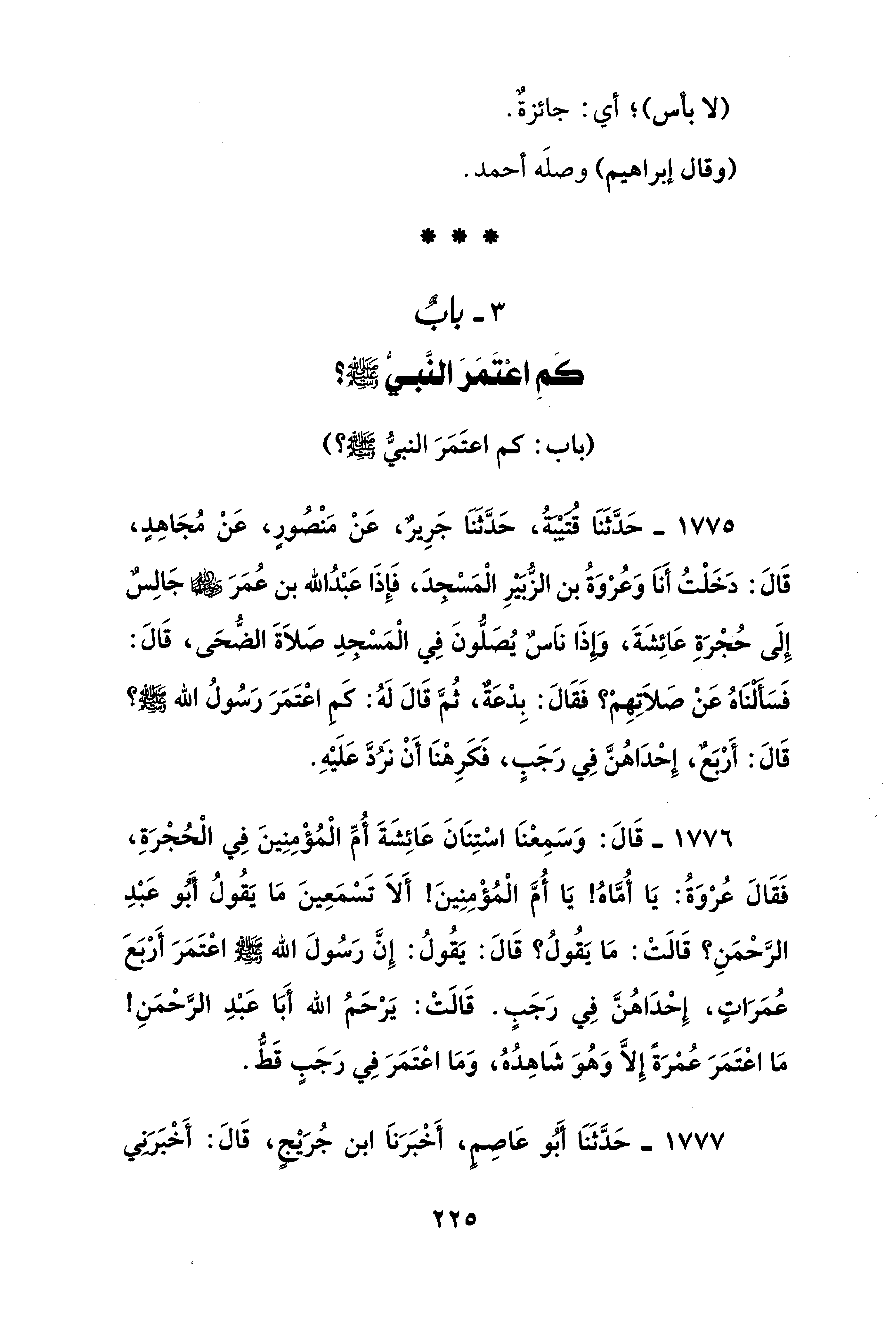 1775 - حَدَّثَنَا قتيْبة، حَدَّثَنَا جَرِيرٌ، عَنْ مَنْصُورٍ، عَنْ مُجَاهِدٍ، قَالَ: دَخَلْتُ أَناَ وَعُرْوَةُ بن الزُّبَيْرِ الْمَسْجدَ، فَإِذَا عَبْدُ الله بن عُمَرَ - رضي الله عنهما - جَالِسٌ إِلَى حُجْرَةِ عَائِشَةَ، وإذَا ناَسٌ يُصَلُّونَ فِي الْمَسْجدِ صَلاَةَ الضُّحَى، قَالَ: فَسَألنَاهُ عَنْ صَلاَتهِمْ؟ فَقَالَ: بِدْعَةٌ، ثُمَّ قَالَ لَهُ: كَم اعْتَمَرَ رَسُولُ الله - صلى الله عليه وسلم -؟ قَالَ: أَرْبَعٌ، إِحْدَاهُنَّ فِي رَجَبٍ، فَكَرِهْنَا أَنْ نرُدَّ عَلَيْهِ.