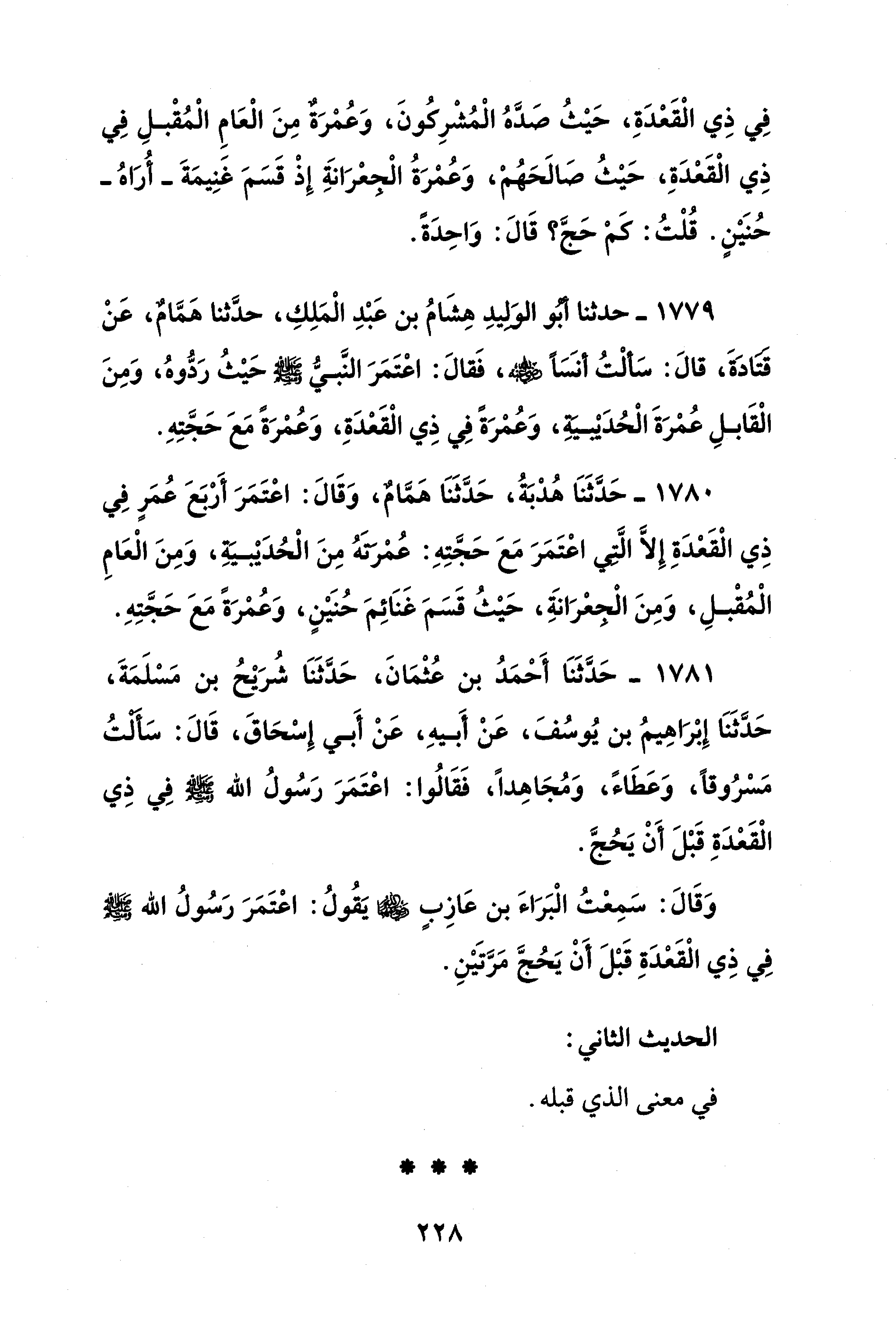 1781 - حَدَّثَنَا أَحْمَدُ بن عُثْمَانَ، حَدَّثَنَا شُرَيْحُ بن مَسْلَمَةَ، حَدَّثَنَا إِبْرَاهِيمُ بن يُوسُفَ، عَنْ أَبيهِ، عَنْ أَبي إِسْحَاقَ، قَالَ: سألتُ مَسْرُوقًا، وَعَطَاءً، وَمُجَاهِدًا، فَقَالُوا: اعْتَمَرَ رَسُولُ الله - صلى الله عليه وسلم - فِي ذِي الْقَعْدَةِ قَبْلَ أَنْ يَحُجَّ.