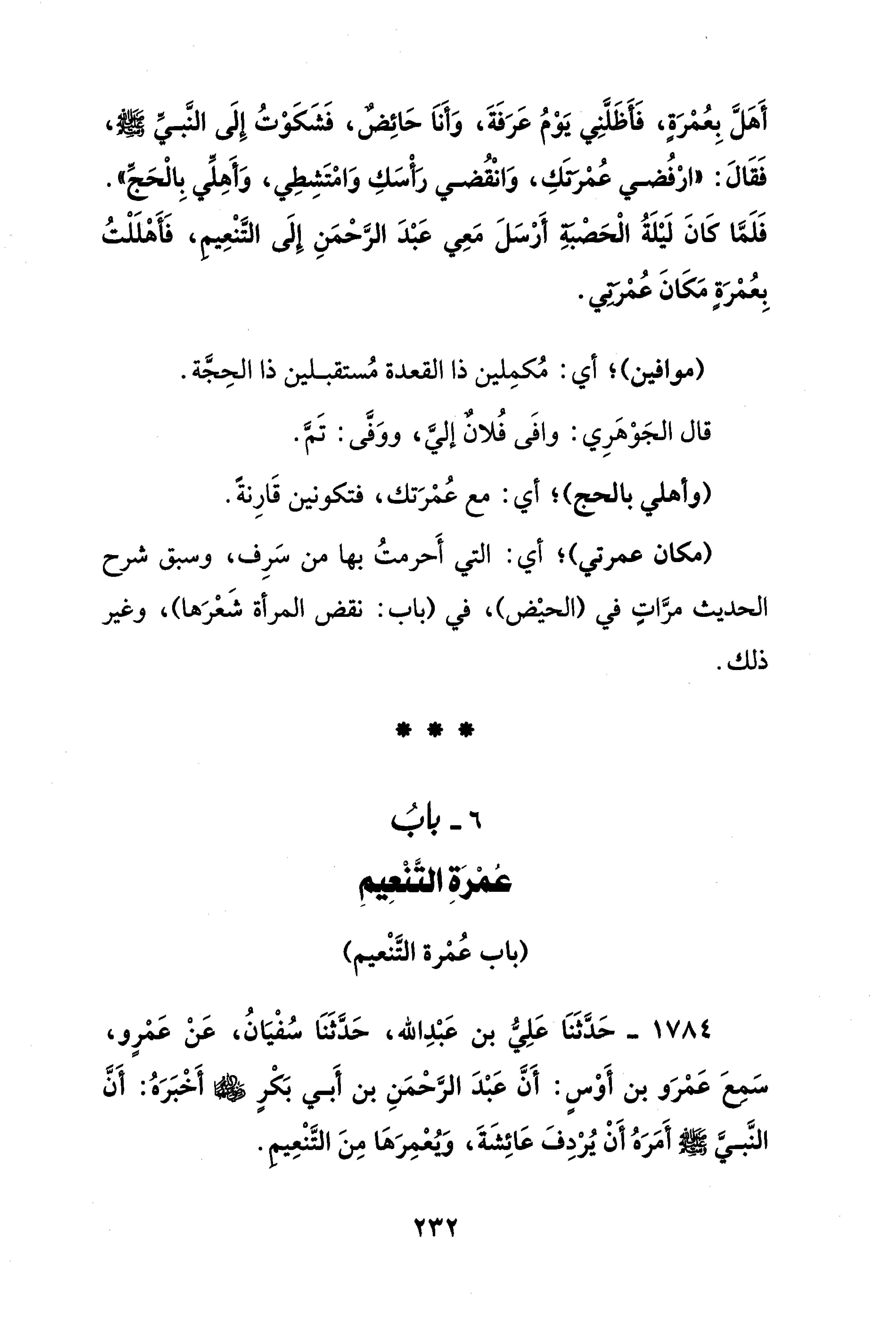 1784 - حَدَّثَنَا عَلِيُّ بن عَبْدِ الله، حَدَّثَنَا سُفْيَانُ، عَنْ عَمْرٍو، سَمِعَ عَمْرَو بن أَوْسٍ: أَنَّ عَبْدَ الرَّحْمَنِ بن أَبي بَكْر - رضي الله عنهما - أَخْبَرَهُ: أَنَّ النَّبي - صلى الله عليه وسلم - أَمَرَهُ أَنْ يُردِفَ عَائِشَةَ، ويُعْمِرَهَا مِنَ التَّنْعِيم.