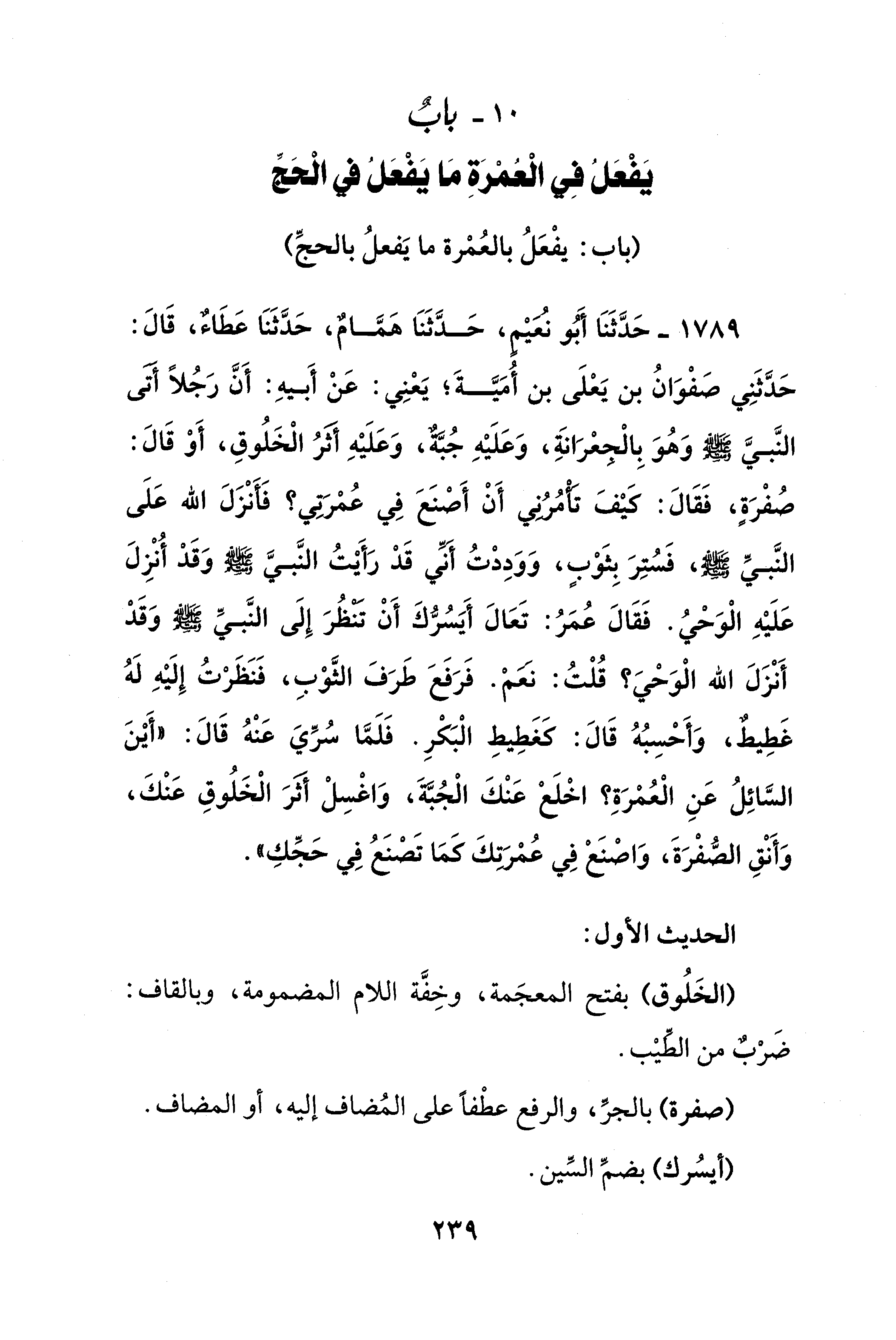 1789 - حَدَّثَنَا أَبُو نُعَيْمٍ، حَدَّثَنَا هَمَّامٌ، حَدَّثَنَا عَطَاءٌ, قَالَ: حَدَّثَنِي صَفْوَانُ بن يَعْلَى بن أُمَيَّةَ؛ يَعْنِي: عَنْ أَبيهِ: أَنَّ رَجُلًا أتى النَّبيَّ - صلى الله عليه وسلم - وَهُوَ بِالْجعْرَانَةِ، وَعَلَيْهِ جُبَّةٌ، وَعَلَيْهِ أثَرُ الْخَلُوقِ، أَوْ قَالَ: صُفْرَةٍ، فَقَالَ: كَيْفَ تأمُرني أَنْ أَصْنَعَ فِي عُمْرتي؟ فَأنْزَلَ الله عَلَى النَّبيِّ - صلى الله عليه وسلم -، فَسُتِرَ بِثَوْبٍ، وَوَدِدْتُ أني قَدْ رَأَيْتُ النَّبيَّ - صلى الله عليه وسلم - وَقَدْ أُنْزِلَ عَلَيْهِ الْوَحْيُ. فَقَالَ عُمَرُ: تَعَالَ أَيَسُرُّكَ أَنْ تنظُرَ إِلَى النَّبيِّ - صلى الله عليه وسلم - وَقَدْ أَنْزَلَ الله الْوَحْيَ؟ قُلْتُ: نعَمْ. فَرَفَعَ طَرَف الثَّوْبِ، فَنَظَرْتُ إِلَيْهِ لَهُ غَطِيطٌ، وَأَحْسِبُهُ قَالَ: كَغَطِيطِ الْبَكْرِ. فَلَمَّا سُرِّيَ عَنْهُ قَالَ: "أَيْنَ السَّائِلُ عَنِ الْعُمْرَةِ؟ اخْلَعْ عَنْكَ الْجُبَّةَ، وَاغْسِلْ أثَرَ الْخَلُوقِ عَنْكَ، وَأَنْقِ الصُّفْرَةَ، وَاصْنَعْ فِي عُمْرتكَ كَمَا تَصْنَعُ فِي حَجِّكِ".
