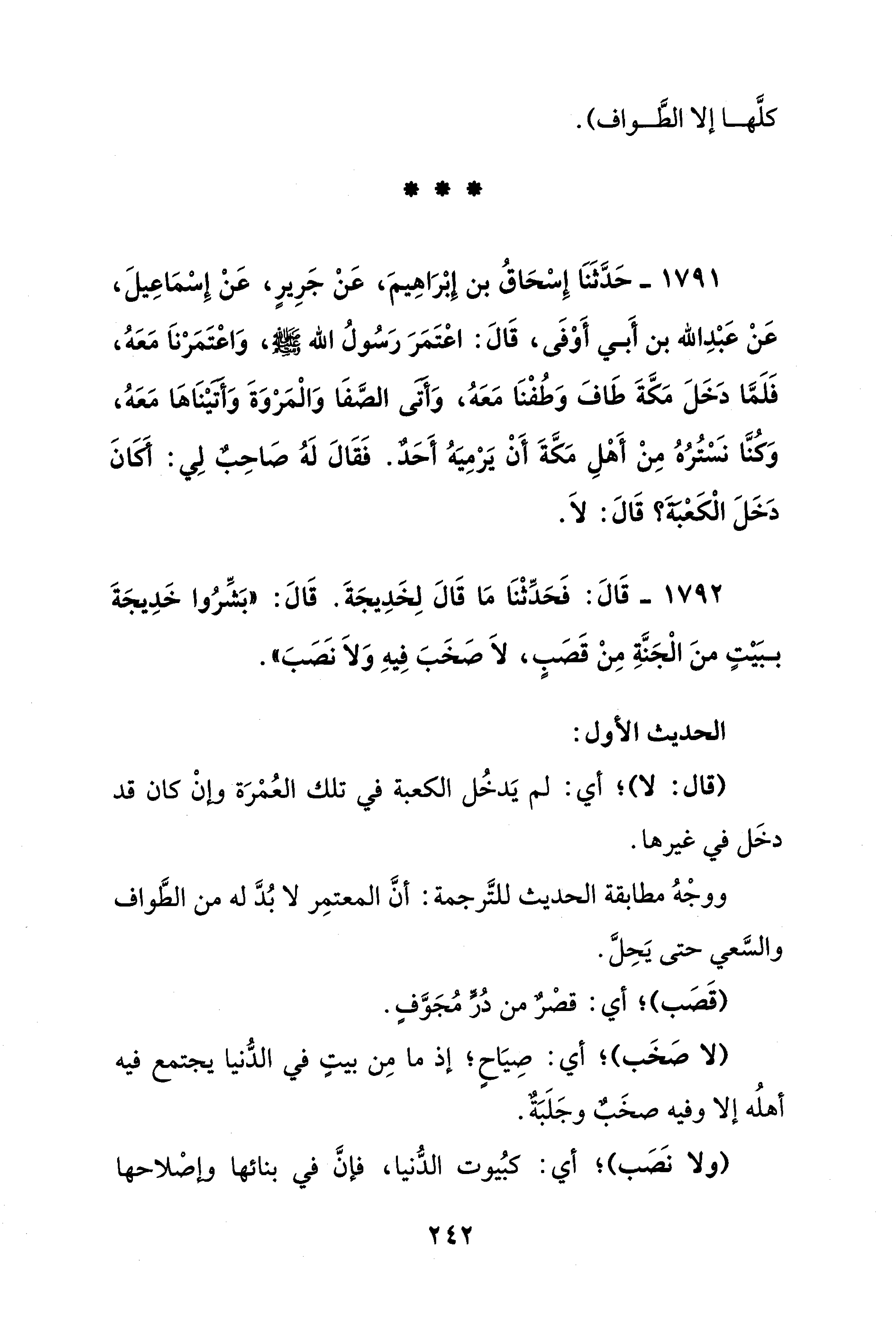 1791 - حَدَّثَنَا إِسْحَاقُ بن إِبْرَاهِيمَ، عَنْ جَرِيرٍ، عَنْ إِسْمَاعِيلَ، عَنْ عَبْدِ الله بن أَبي أَوْفَى، قَالَ: اعْتَمَرَ رَسُولُ الله - صلى الله عليه وسلم -، وَاعْتَمَرناَ مَعَهُ، فَلَمَّا دَخَلَ مَكَّةَ طَاف وَطُفْنَا مَعَهُ، وَأتى الصَّفَا وَالْمَرْوَةَ وَأتيْنَاهَا مَعَهُ، وَكنَّا نستُرُهُ مِنْ أَهْلِ مَكَّةَ أَنْ يَرْمِيَهُ أَحَدٌ. فَقَالَ لَهُ صَاحِبٌ لِي: كانَ دَخَلَ الْكَعْبةَ؟ قَالَ: لاَ.