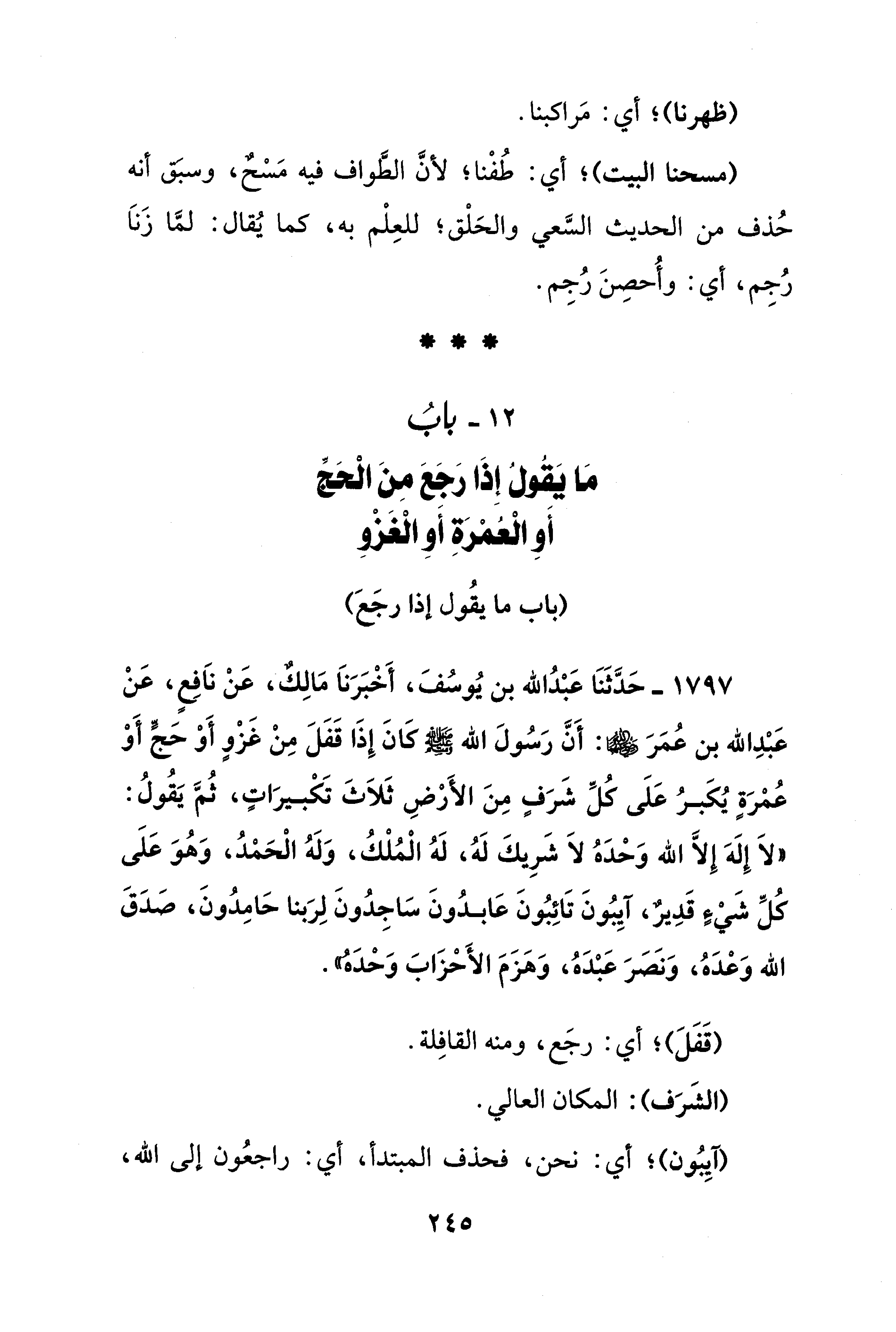 1797 - حَدَّثَنَا عَبْدُ الله بن يُوسُفَ، أَخْبَرَناَ مَالِكٌ، عَنْ ناَفِعٍ، عَنْ عَبْدِ الله بن عُمَرَ: أَنَّ رَسُولَ الله - صلى الله عليه وسلم - كَانَ إِذَا قَفَلَ مِنْ غزْوٍ أَوْ حَج أَوْ عُمْرَةٍ يُكَبرُ عَلَى كُلِّ شَرَفٍ مِنَ الأَرْضِ ثَلاَثَ تَكْبيرَاتٍ، ثُمَّ يَقُولُ: "لاَ إِلَهَ إِلَّا الله وَحْدَهُ لاَ شَرِيكَ لَهُ، لَهُ الْمُلْكُ، وَلَهُ الْحَمْدُ، وَهُوَ عَلَى كُلِّ شَيْء قَدِيرٌ، آيِبُونَ تَائِبُونَ عَابدُونَ سَاجِدُونَ لِرَبنا حَامِدُونَ، صَدَقَ الله وَعْدَهُ، وَنَصَرَ عَبْدَهُ، وَهَزَمَ الأَحْزَابَ وَحْدَه".