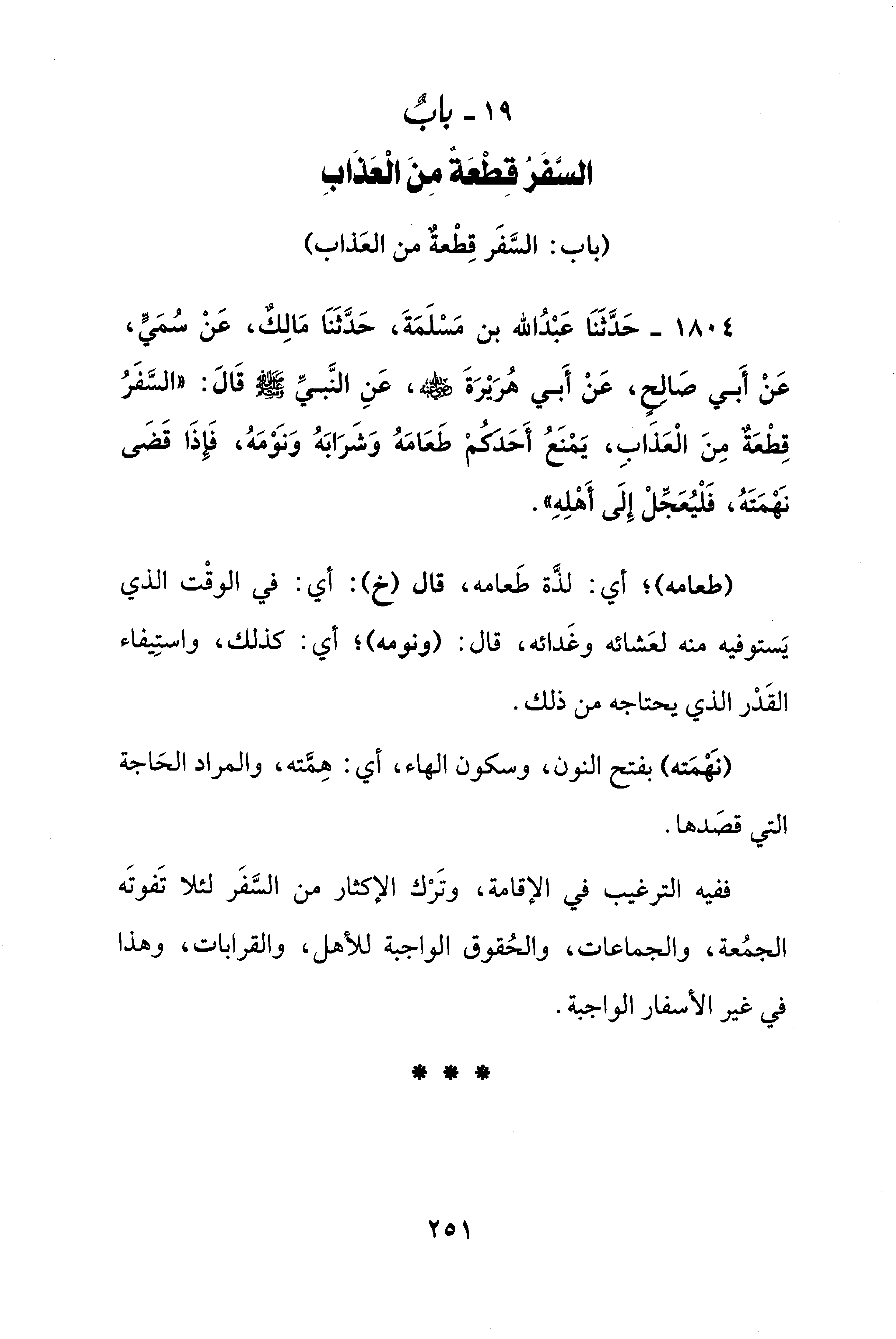 1804 - حَدَّثَنَا عَبْدُ الله بن مَسْلَمَةَ، حَدَّثَنَا مَالِكٌ، عَنْ سُمَيٍّ، عَنْ أَبي صَالح، عَنْ أَبي هُرَيْرَةَ - رضي الله عنه -، عَنِ النَّبيِّ - صلى الله عليه وسلم - قَالَ: "السَّفَرُ قِطْعَةٌ مِنَ الْعَذابِ، يَمْنَعُ أَحَدكمْ طَعَامَهُ وَشَرَابَهُ وَنَوْمَهُ، فإذَا قَضَى نَهْمَتَهُ، فَلْيُعَجِّلْ إِلَى أَهْلِهِ".