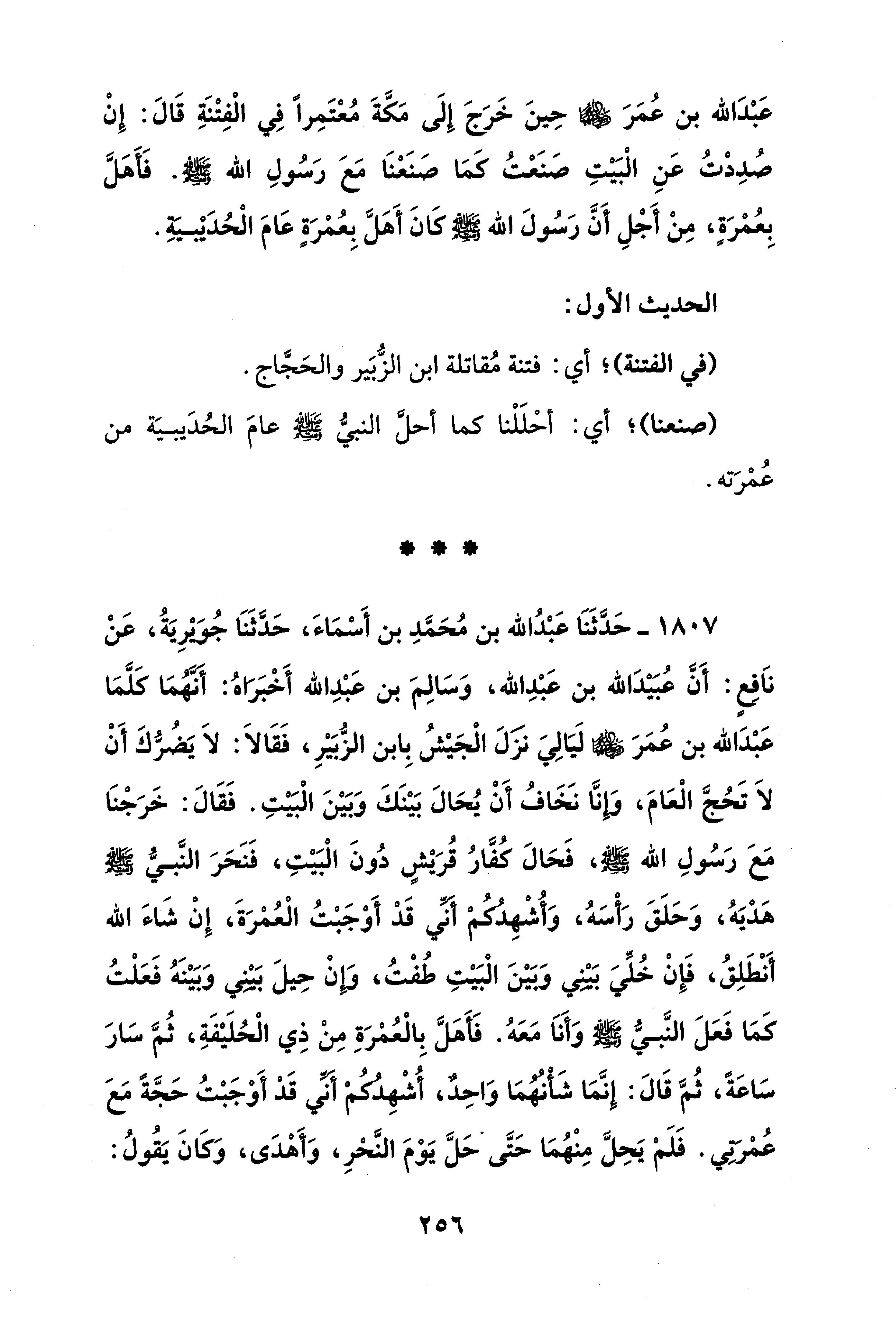 1807 - حَدَّثَنَا عَبْدُ الله بن مُحَمَّدِ بن أَسْمَاءَ، حَدَّثَنَا جُويرِيَةُ، عَنْ ناَفِعٍ: أَنَّ عُبَيْدَ الله بن عَبْدِ الله، وَسَالِمَ بن عَبْدِ الله أَخْبَرَاهُ: أَنَّهُمَا كلَّمَا عَبْدَ الله بن عُمَرَ - رضي الله عنهما - لَيَالِيَ نزَلَ الْجَيْشُ بِابن الزُّبَيْرِ، فَقَالاَ: لاَ يَضُرُّكَ أَنْ لاَ تحُجَّ الْعَامَ، وإنَّا نخافُ أَنْ يُحَالَ بَيْنَكَ وَبَيْنَ الْبَيْتِ. فَقَالَ: خَرَجْنَا مَعَ رَسُولِ الله - صلى الله عليه وسلم -، فَحَالَ كفَّارُ قُرَيشٍ دُونَ الْبَيتِ، فَنَحَرَ النَّبيُّ - صلى الله عليه وسلم - هَدْيَهُ، وَحَلَقَ رَأْسَهُ، وَأُشْهِدُكُمْ أنِّي قَدْ أَوْجَبْتُ الْعُمْرَةَ، إِنْ شَاءَ الله أَنْطَلِقُ، فَإنْ خُلِّيَ بَيْني وَبَيْنَ الْبَيْتِ طُفْتُ، وإنْ حِيلَ بَيْني وَبَيْنَهُ فَعَلْتُ كَمَا فَعَلَ النَّبيُّ - صلى الله عليه وسلم - وَأَناَ مَعَهُ. فَأهَلَّ بِالْعُمْرَةِ مِنْ ذِي الْحُلَيْفَةِ، ثُمَّ سَارَ سَاعَةً، ثُمَّ قَالَ: إِنَّمَا شَأْنهمَا وَاحِدٌ، أُشْهِدُكُمْ أني قَدْ أَوْجَبْتُ حَجَّةً مَعَ عُمْرتي. فَلَمْ يَحِلَّ مِنْهُمَا حَتَّى حَلَّ يَوْمَ النَّحْرِ، وَأَهْدَى، وَكَانَ يَقُولُ: